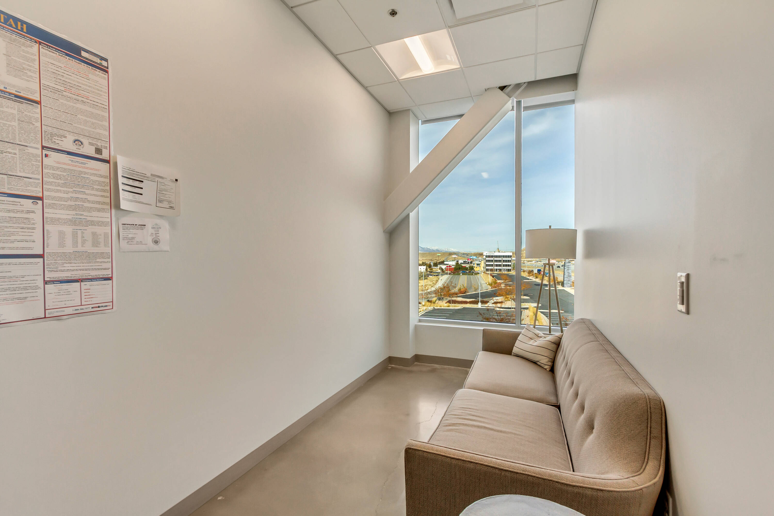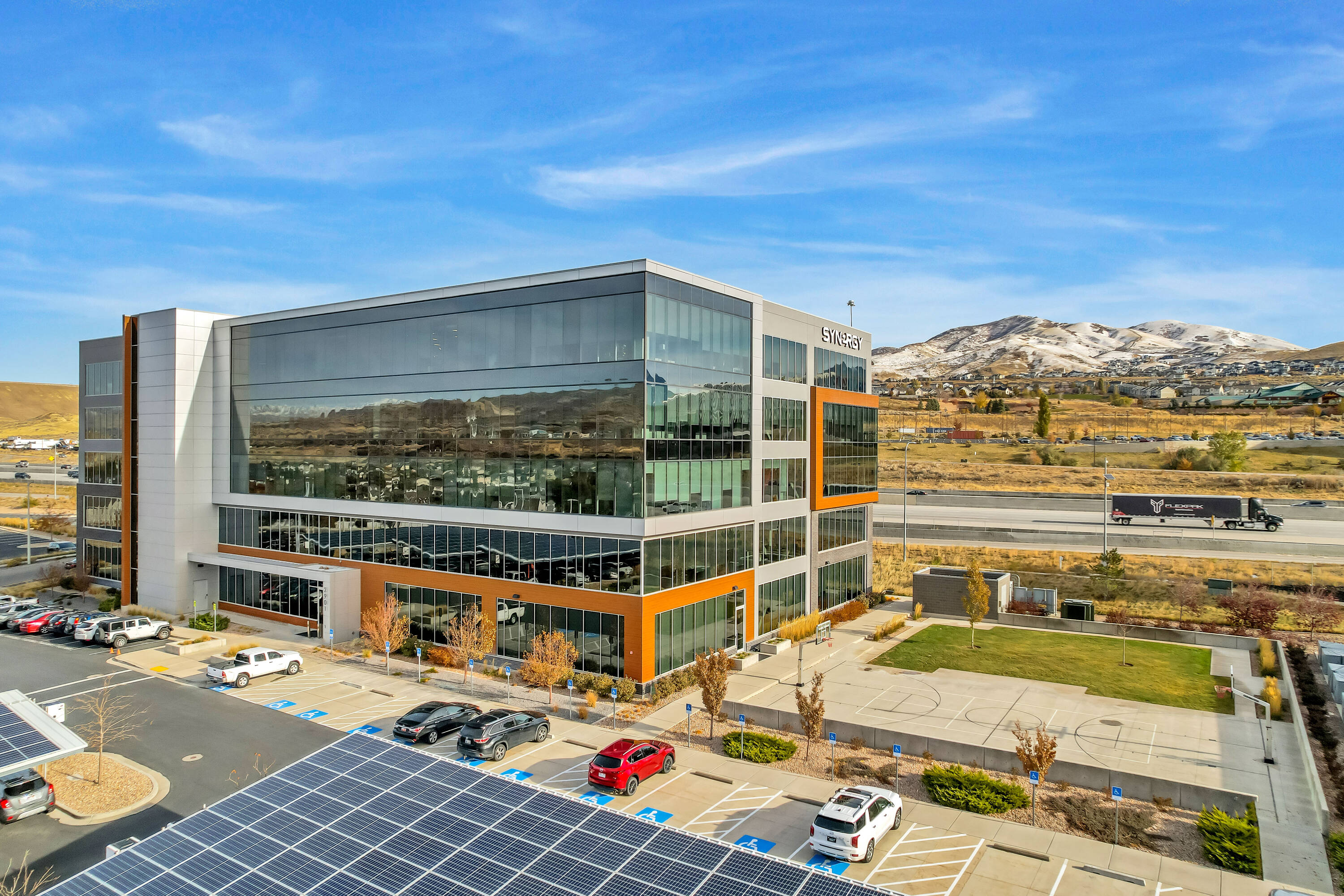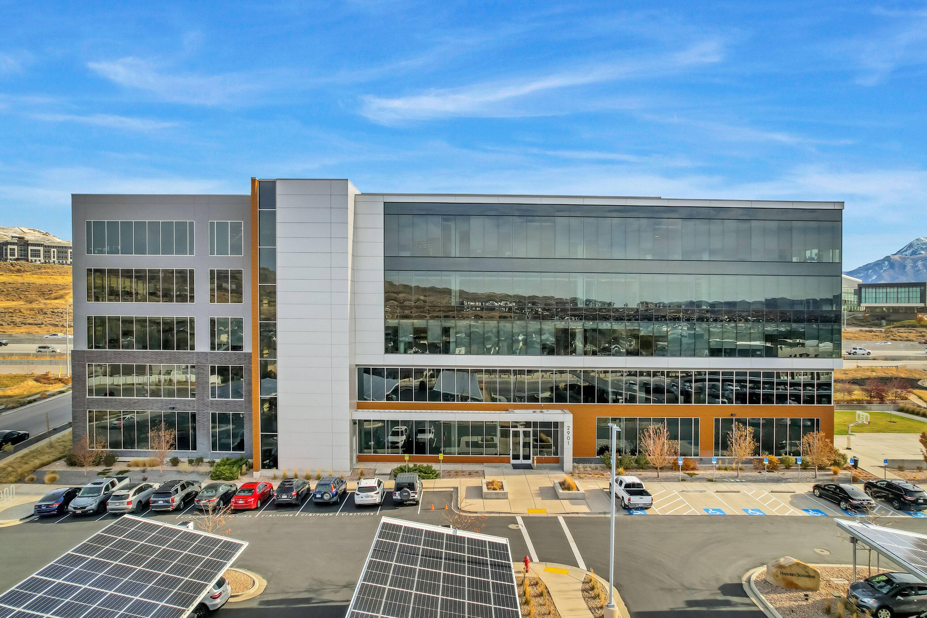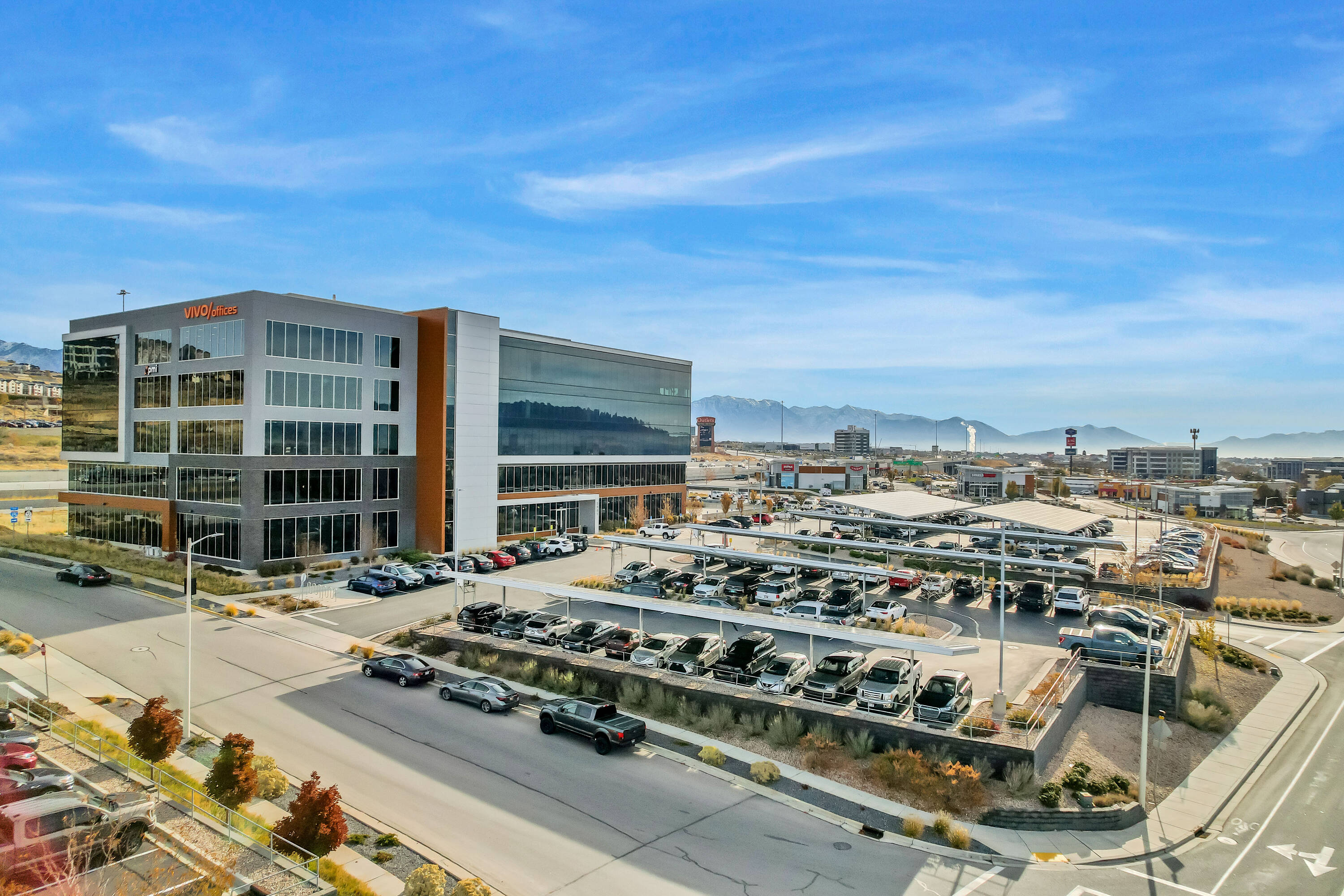 The office space at Lone Peak Plaza features modern finishes and is designed for efficiency. The building is solar-powered and includes floor-to-ceiling glass windows that provide ample natural light and a contemporary aesthetic. Parking is available at a ratio of 4.5 spaces per 1,000 square feet, with covered parking options. This property is suitable for businesses seeking a professional and sustainable environment, combining functionality with sophisticated design.