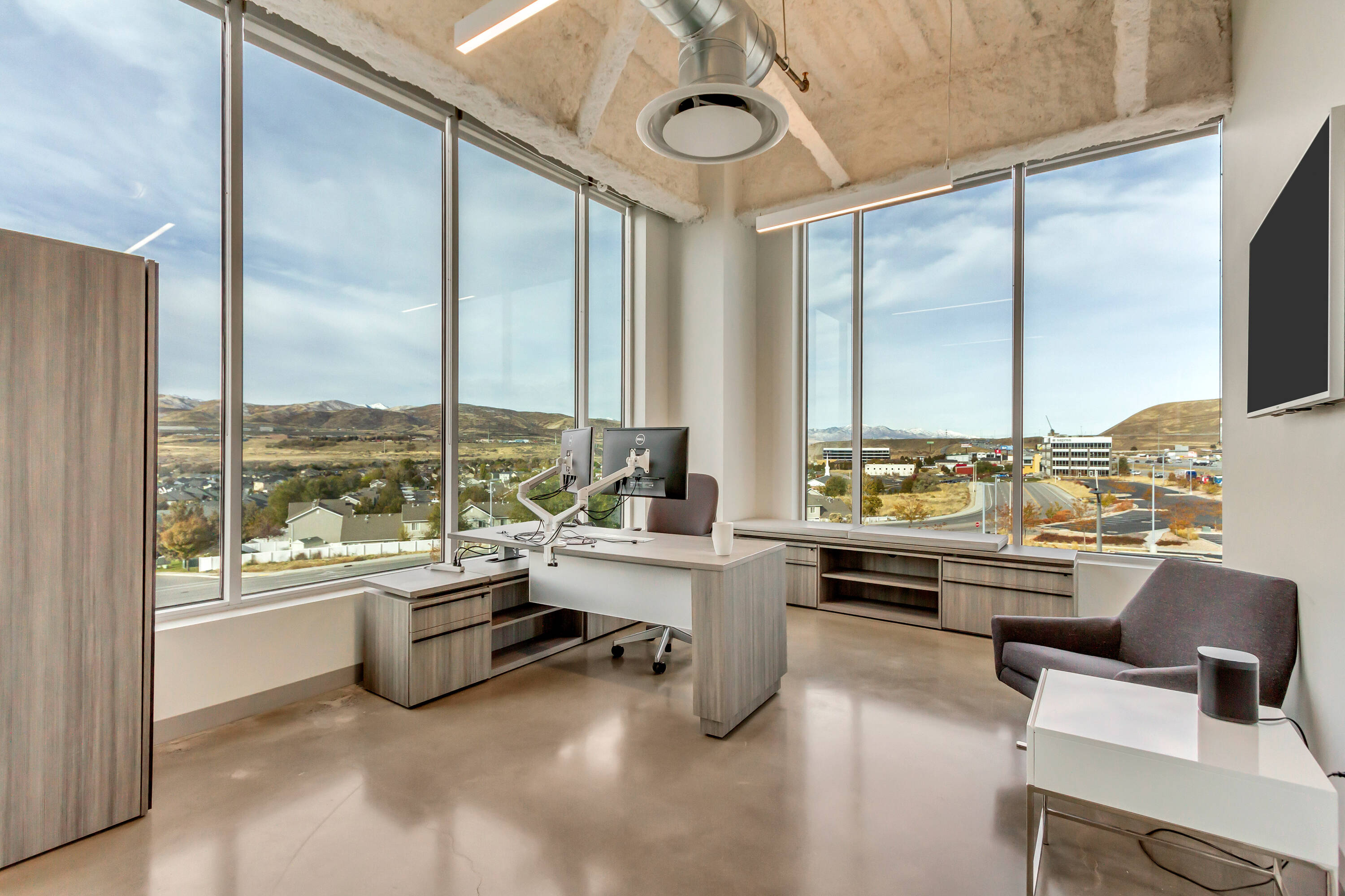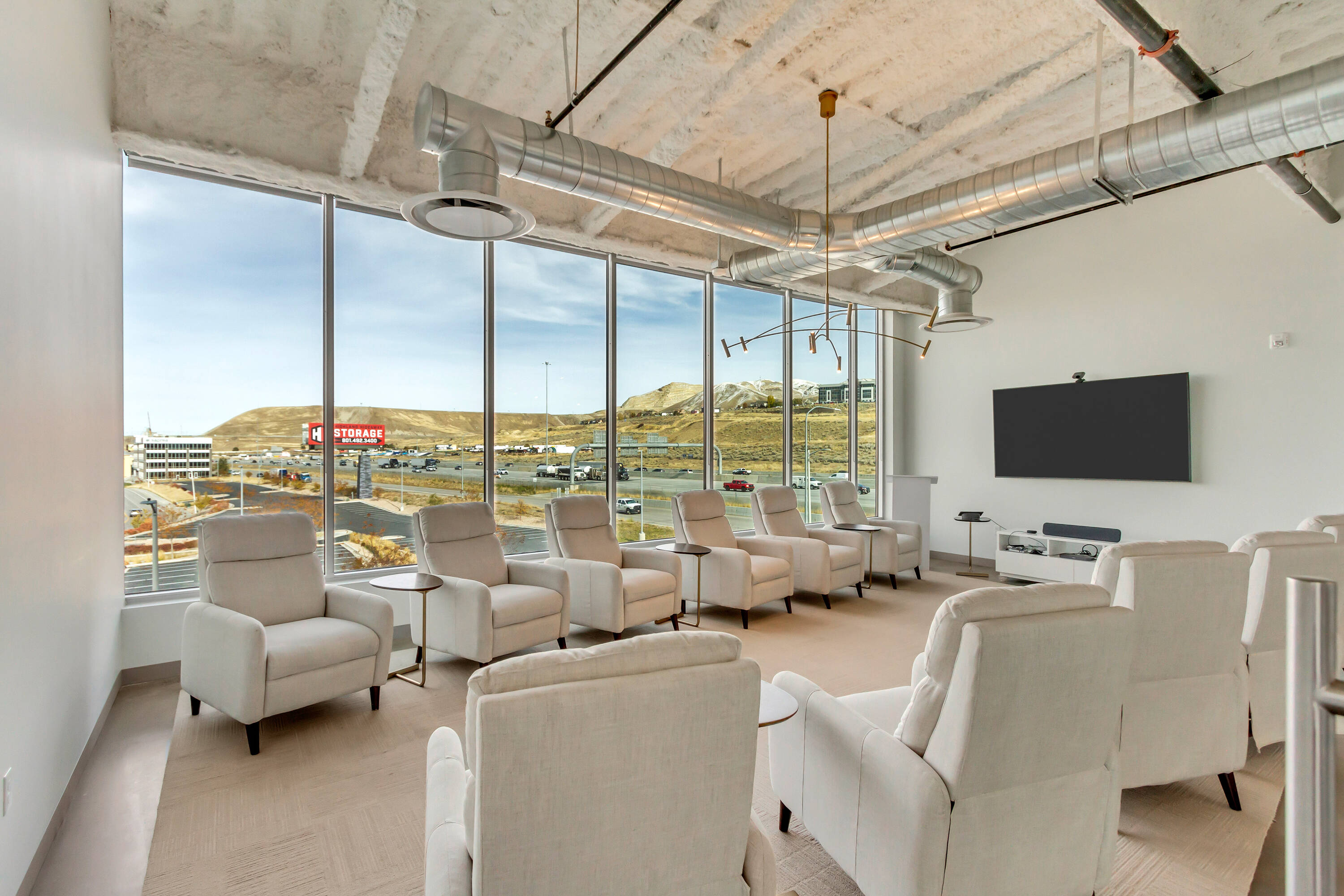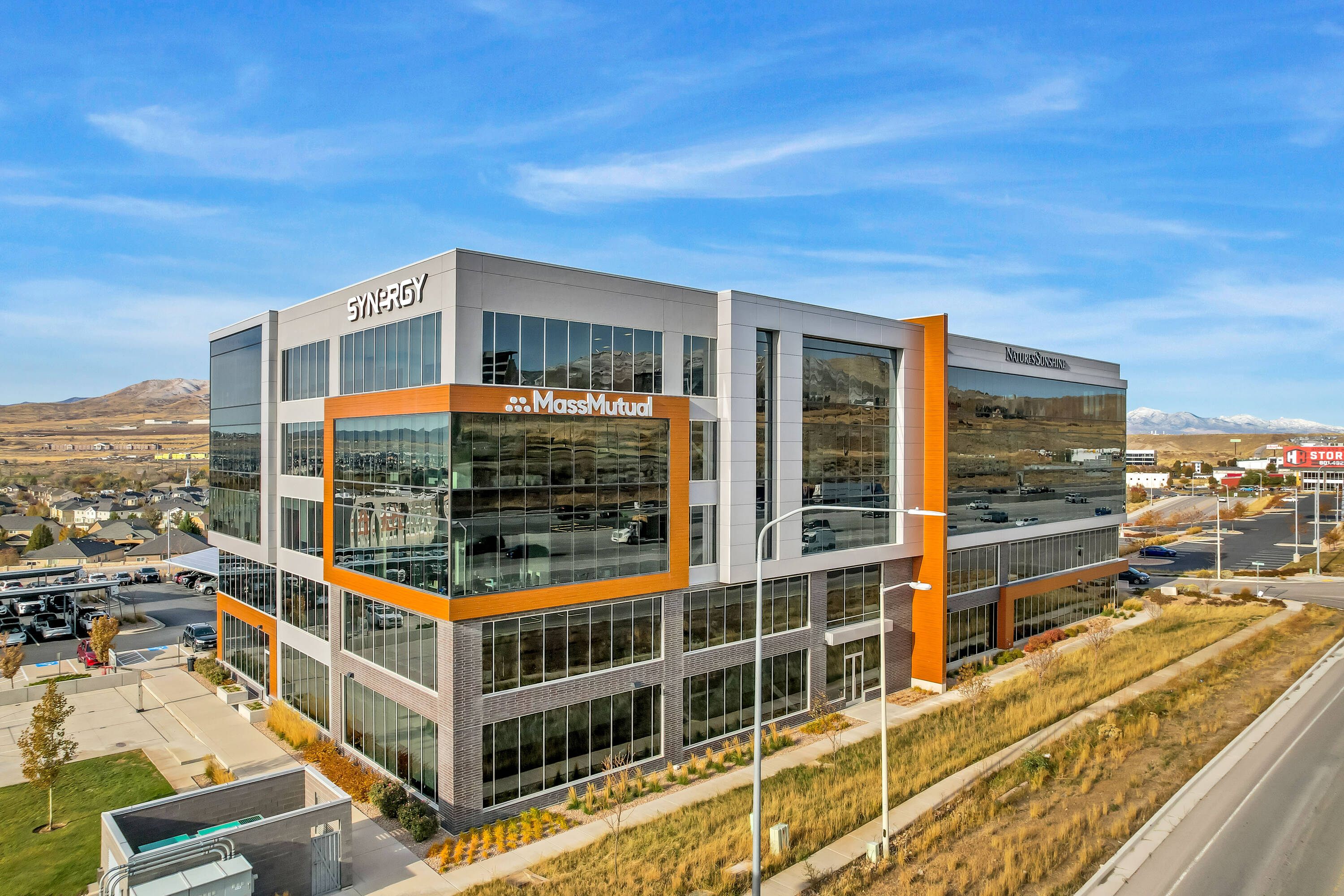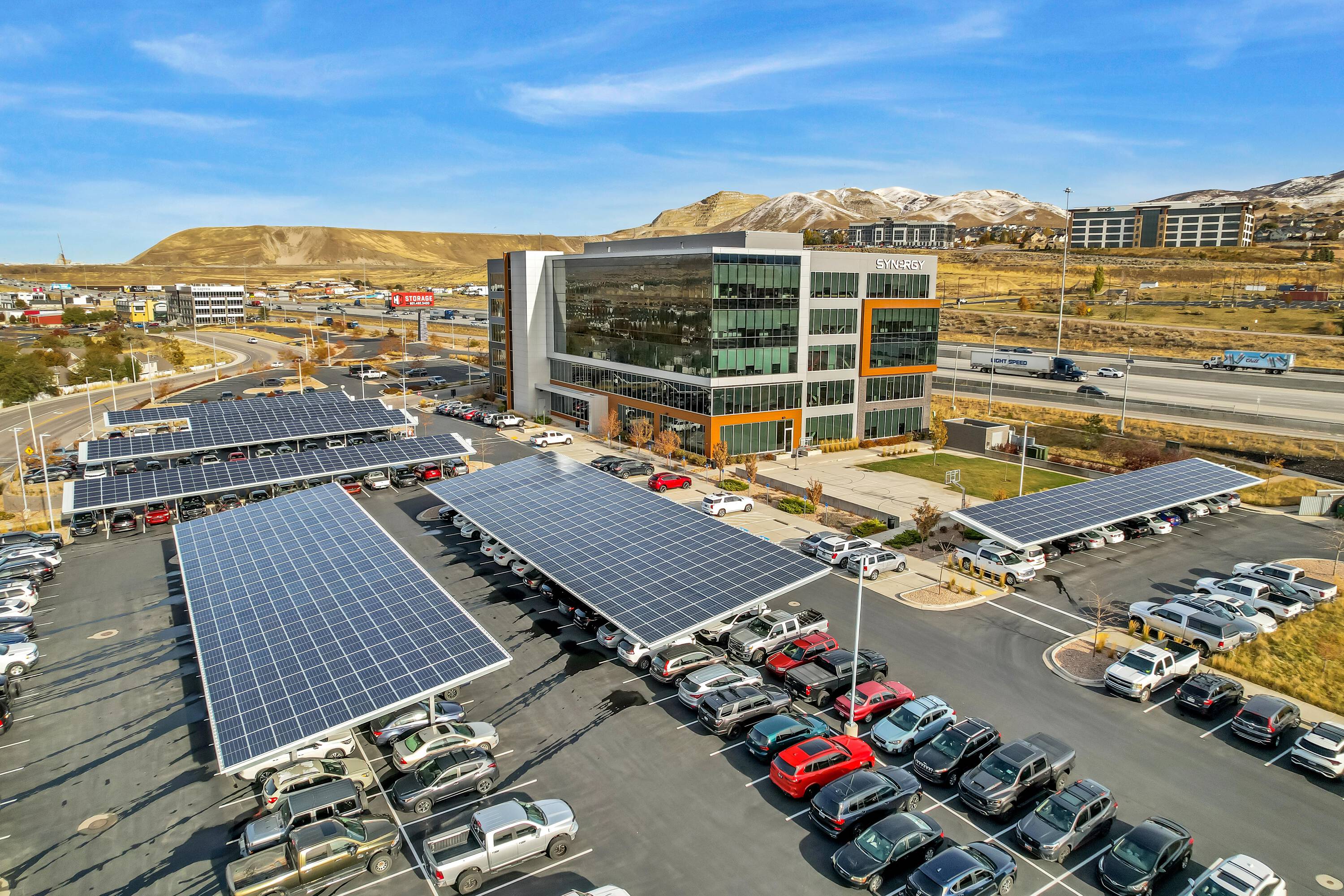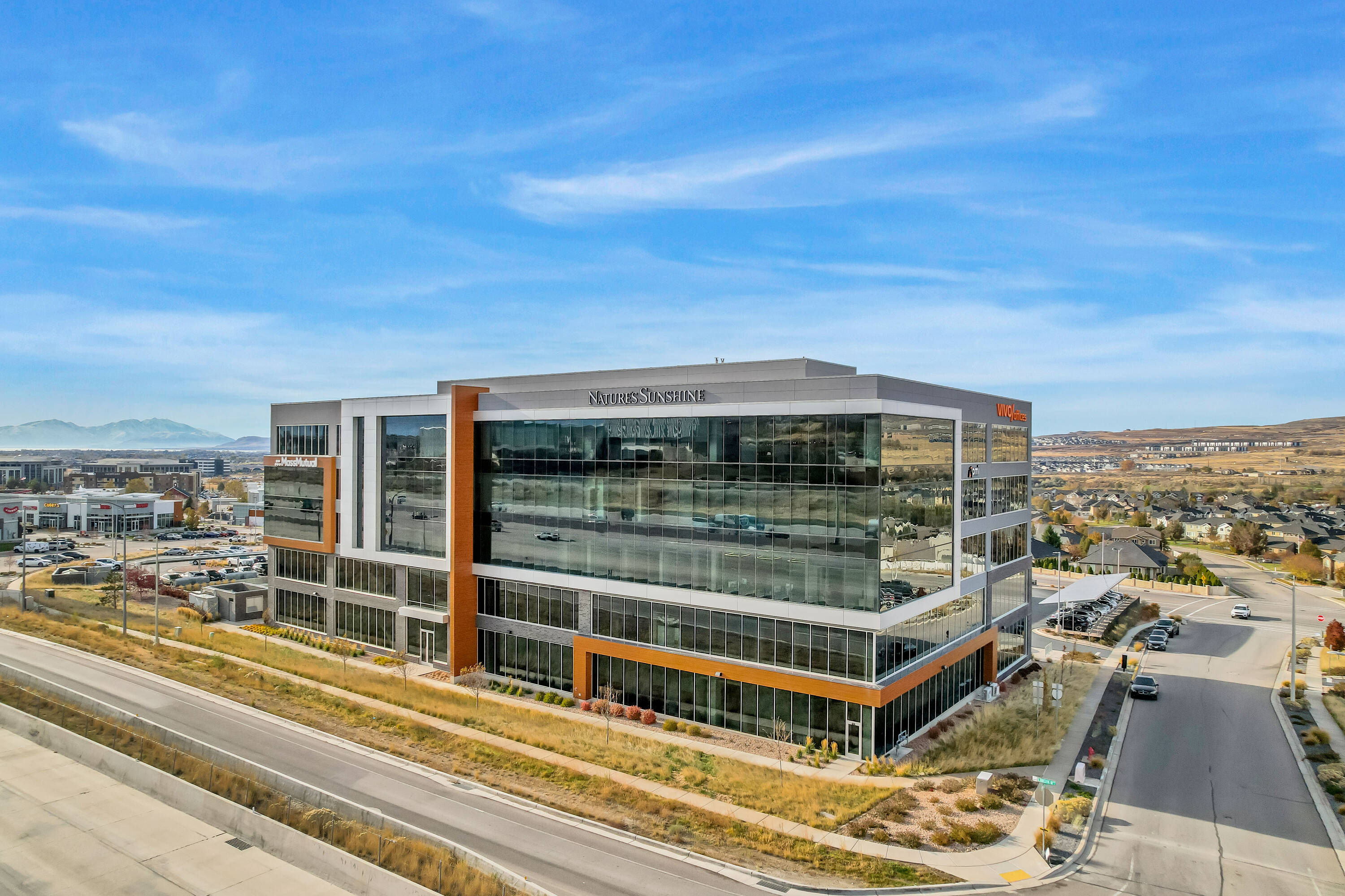 The office space at Lone Peak Plaza features modern finishes and is designed for efficiency. The building is solar-powered and includes floor-to-ceiling glass windows that provide ample natural light and a contemporary aesthetic. Parking is available at a ratio of 4.5 spaces per 1,000 square feet, with covered parking options. This property is suitable for businesses seeking a professional and sustainable environment, combining functionality with sophisticated design.