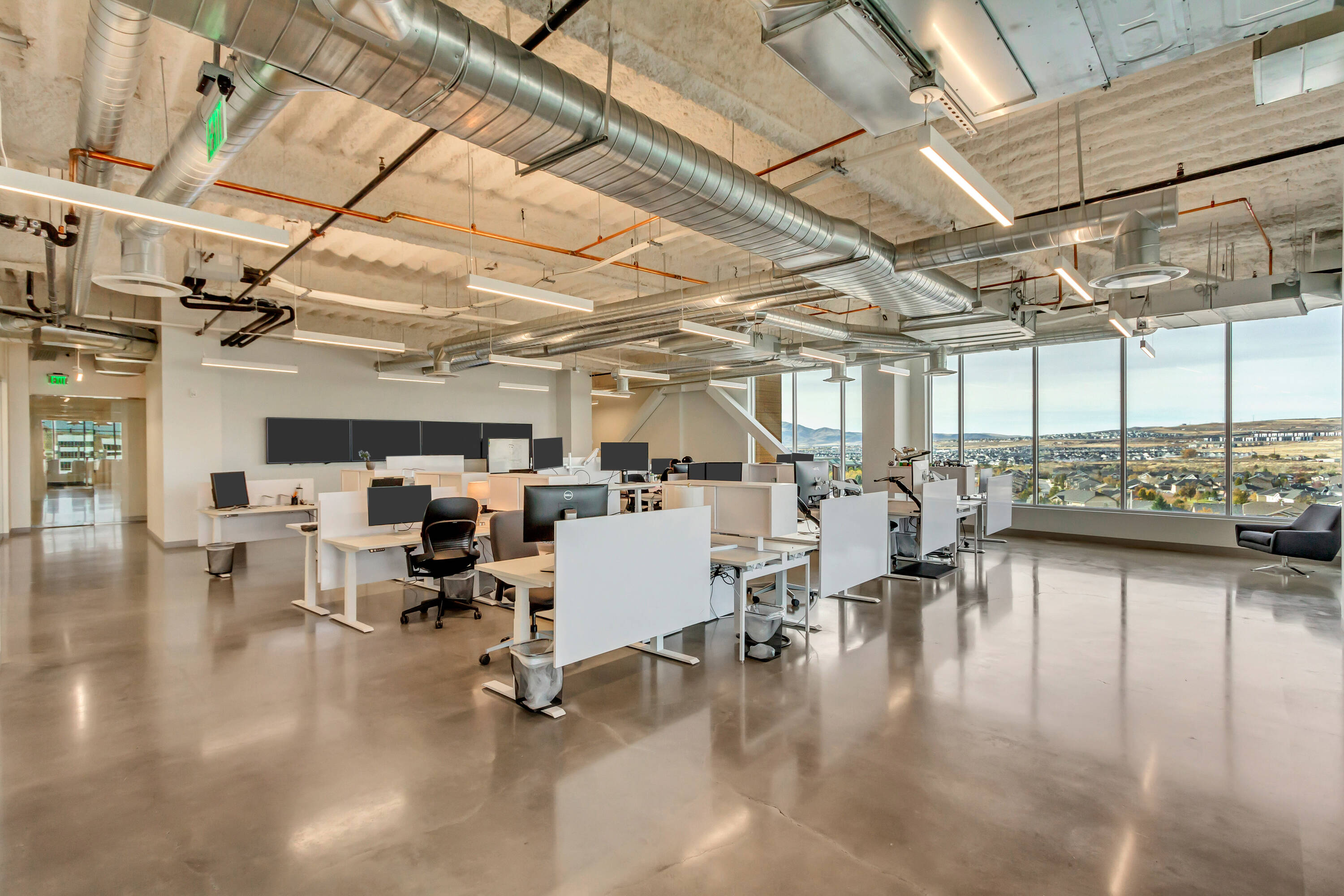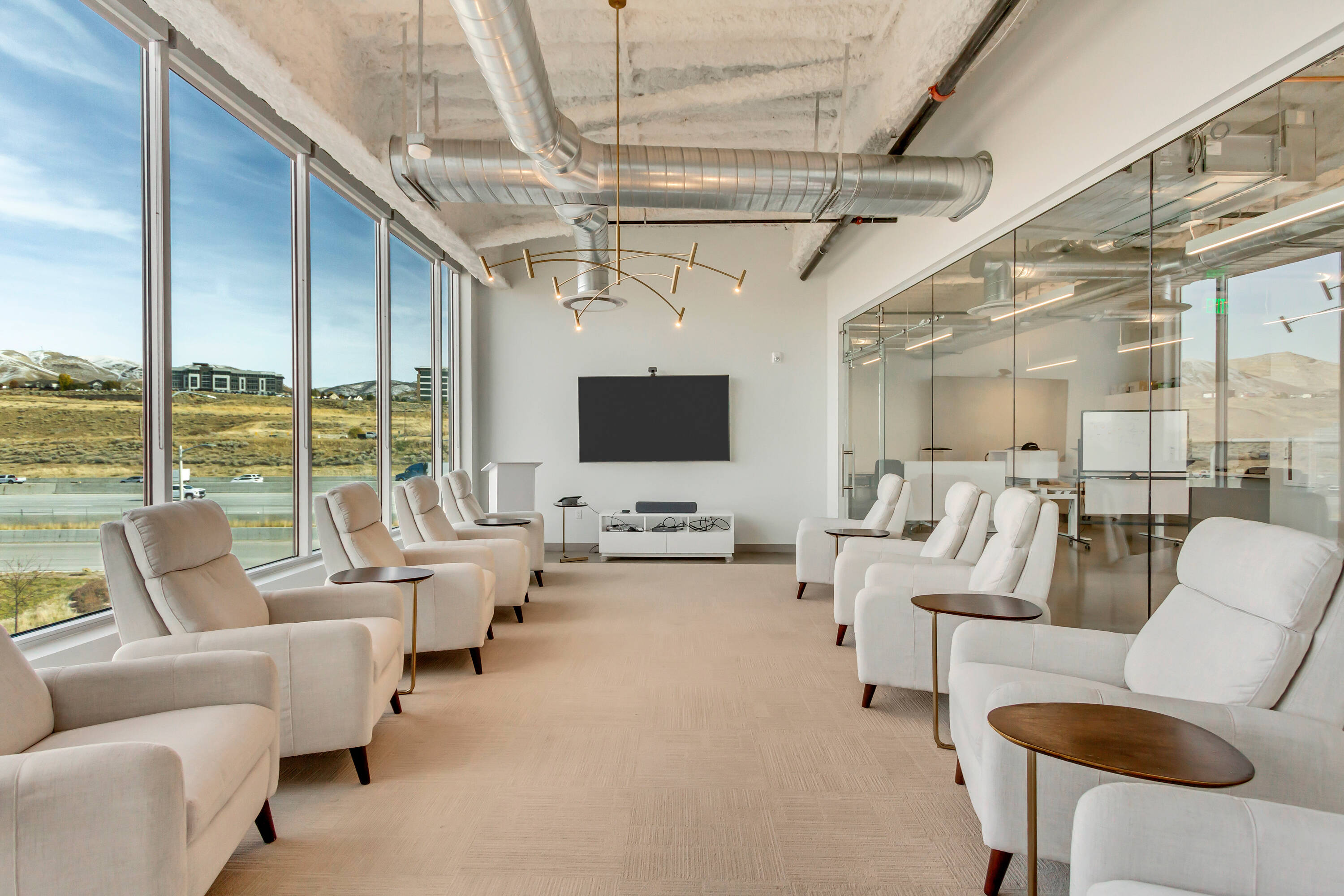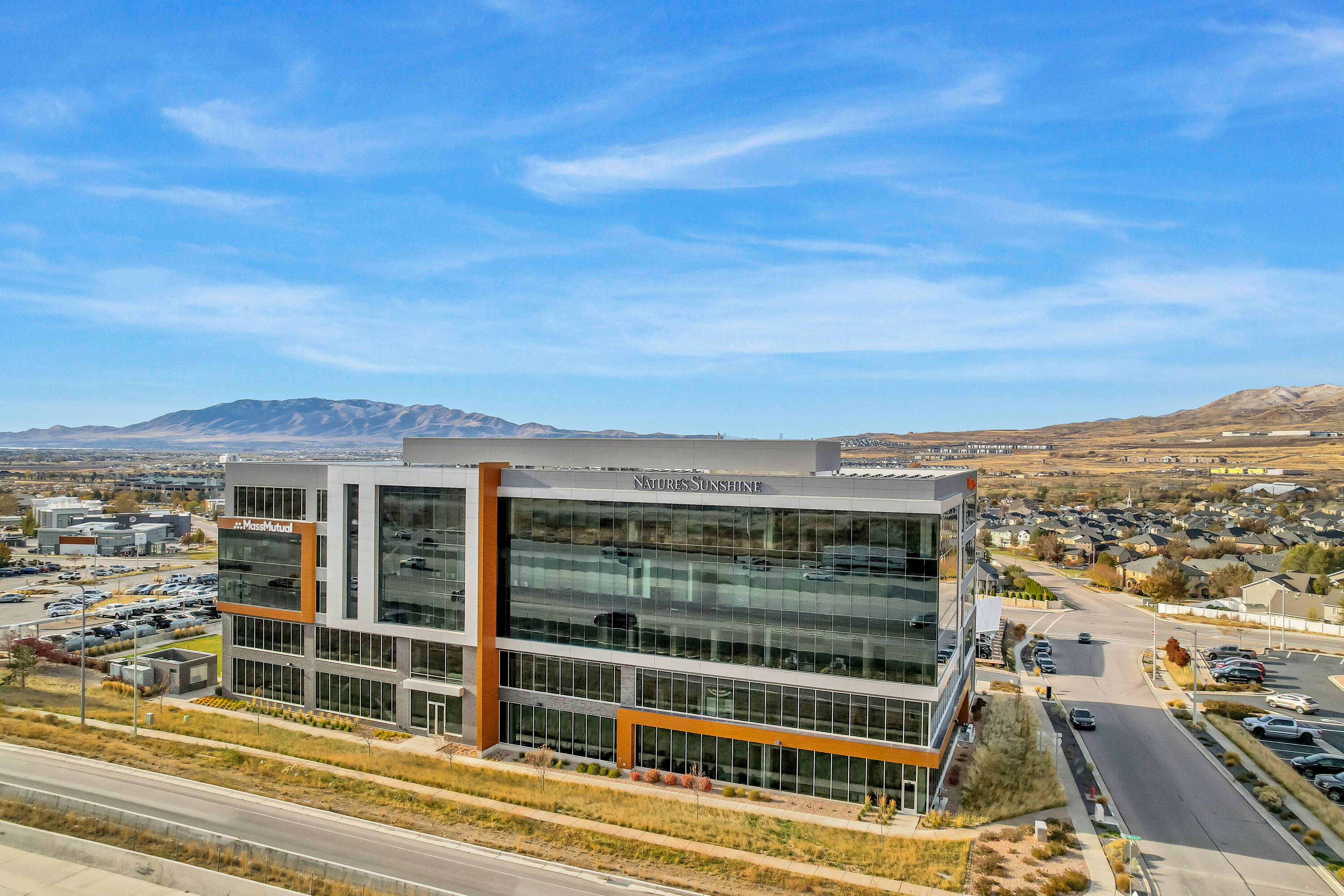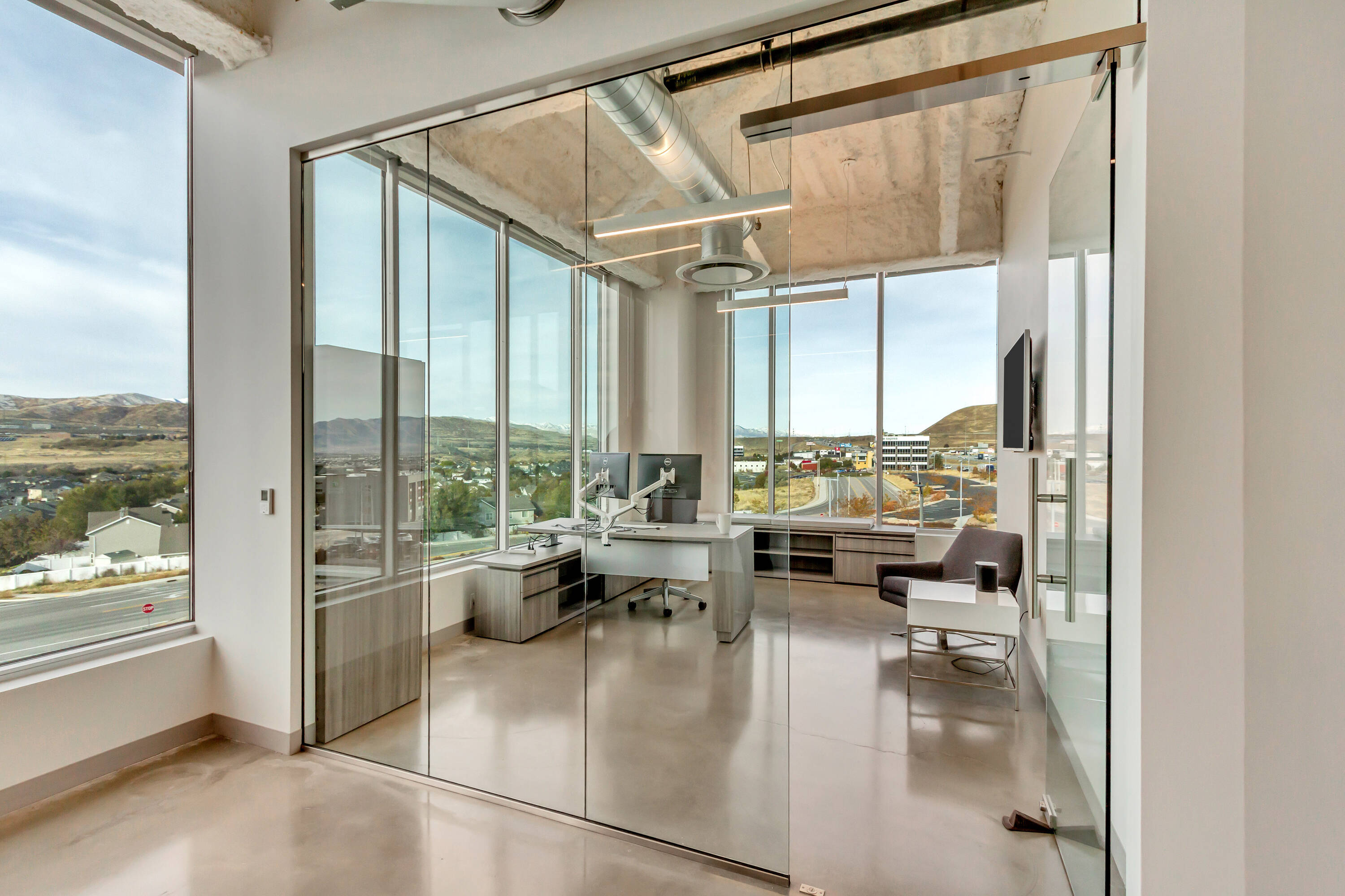 The office space at Lone Peak Plaza features modern finishes and is designed for efficiency. The building is solar-powered and includes floor-to-ceiling glass windows that provide ample natural light and a contemporary aesthetic. Parking is available at a ratio of 4.5 spaces per 1,000 square feet, with covered parking options. This property is suitable for businesses seeking a professional and sustainable environment, combining functionality with sophisticated design.