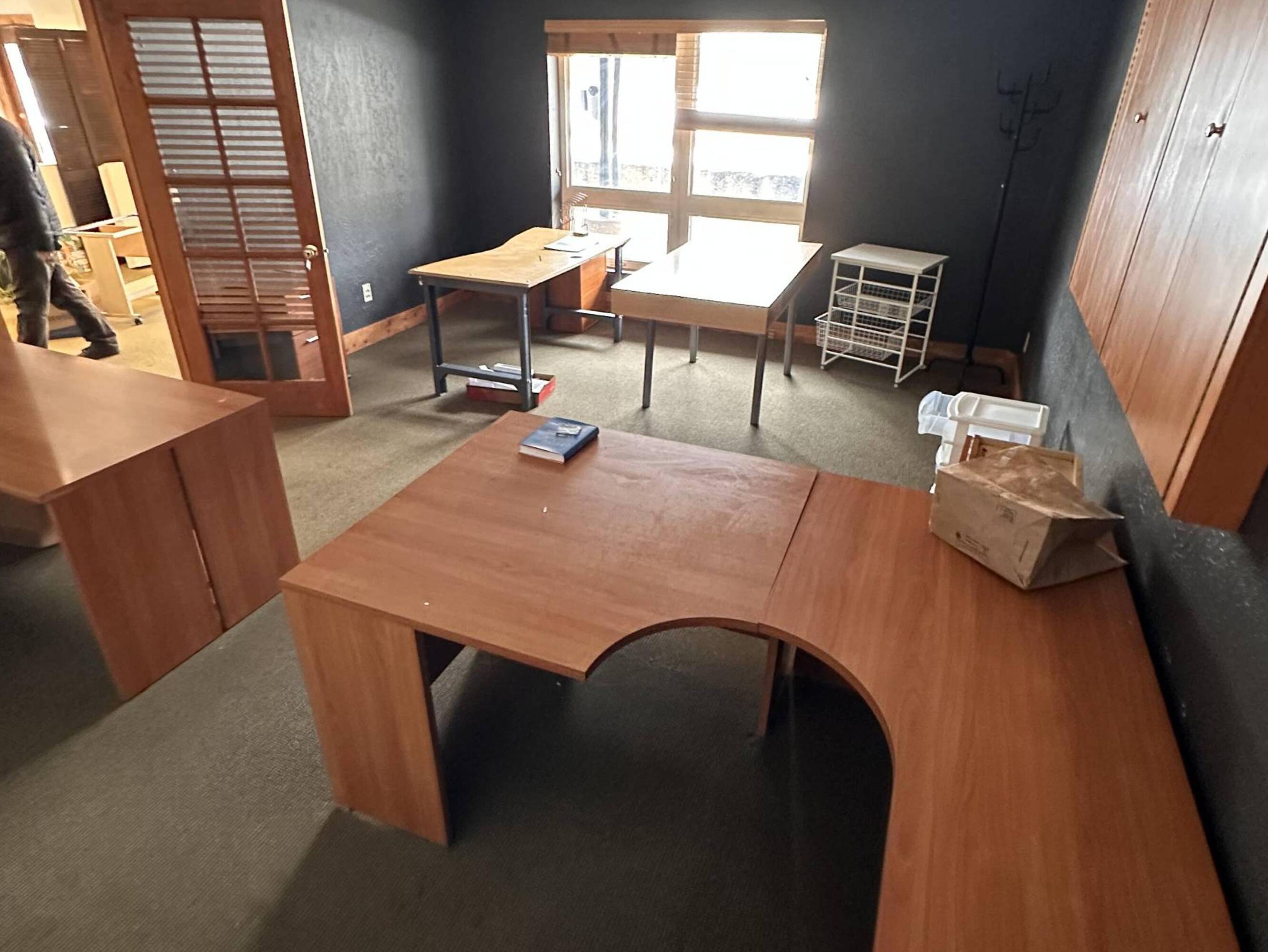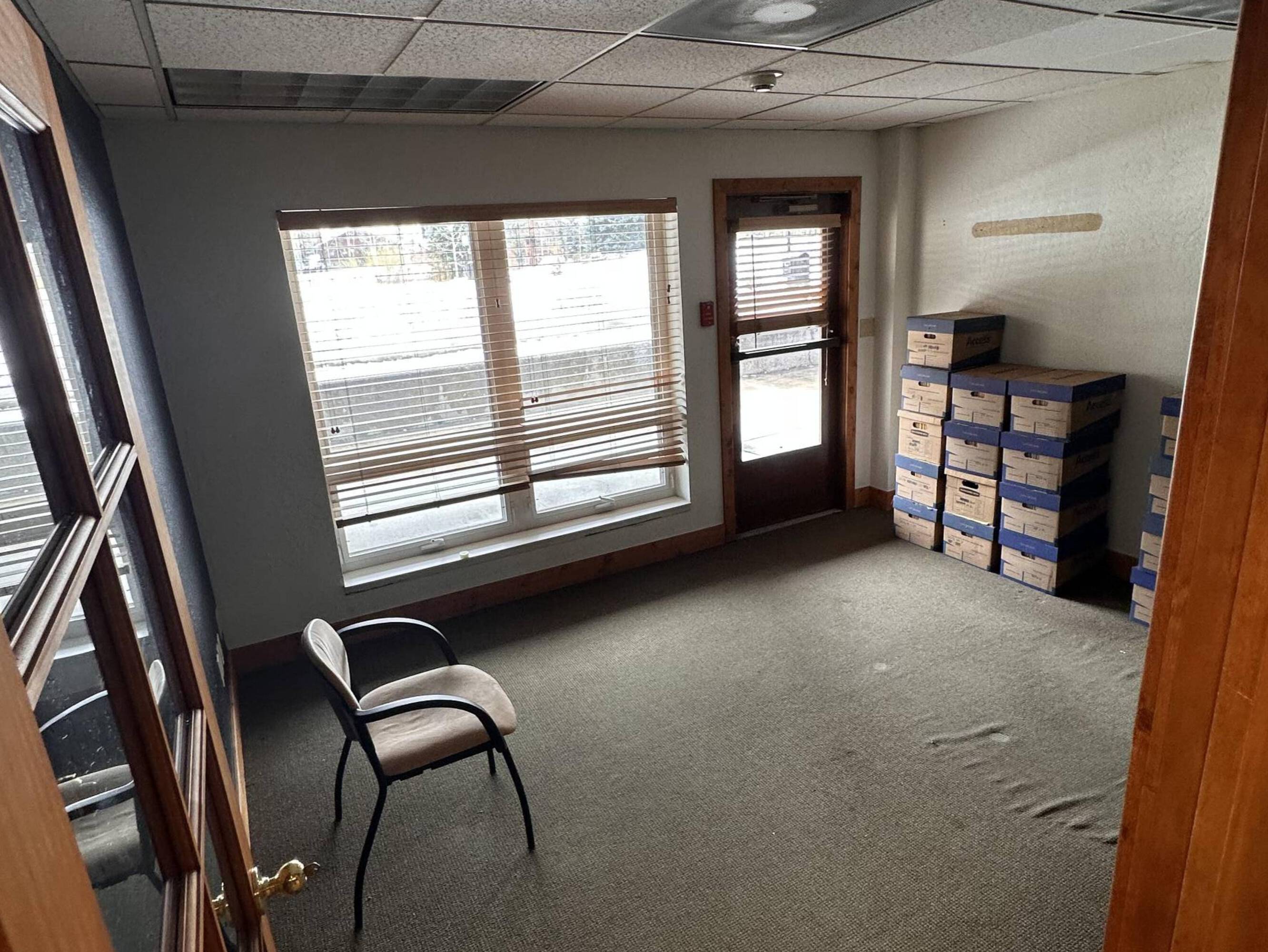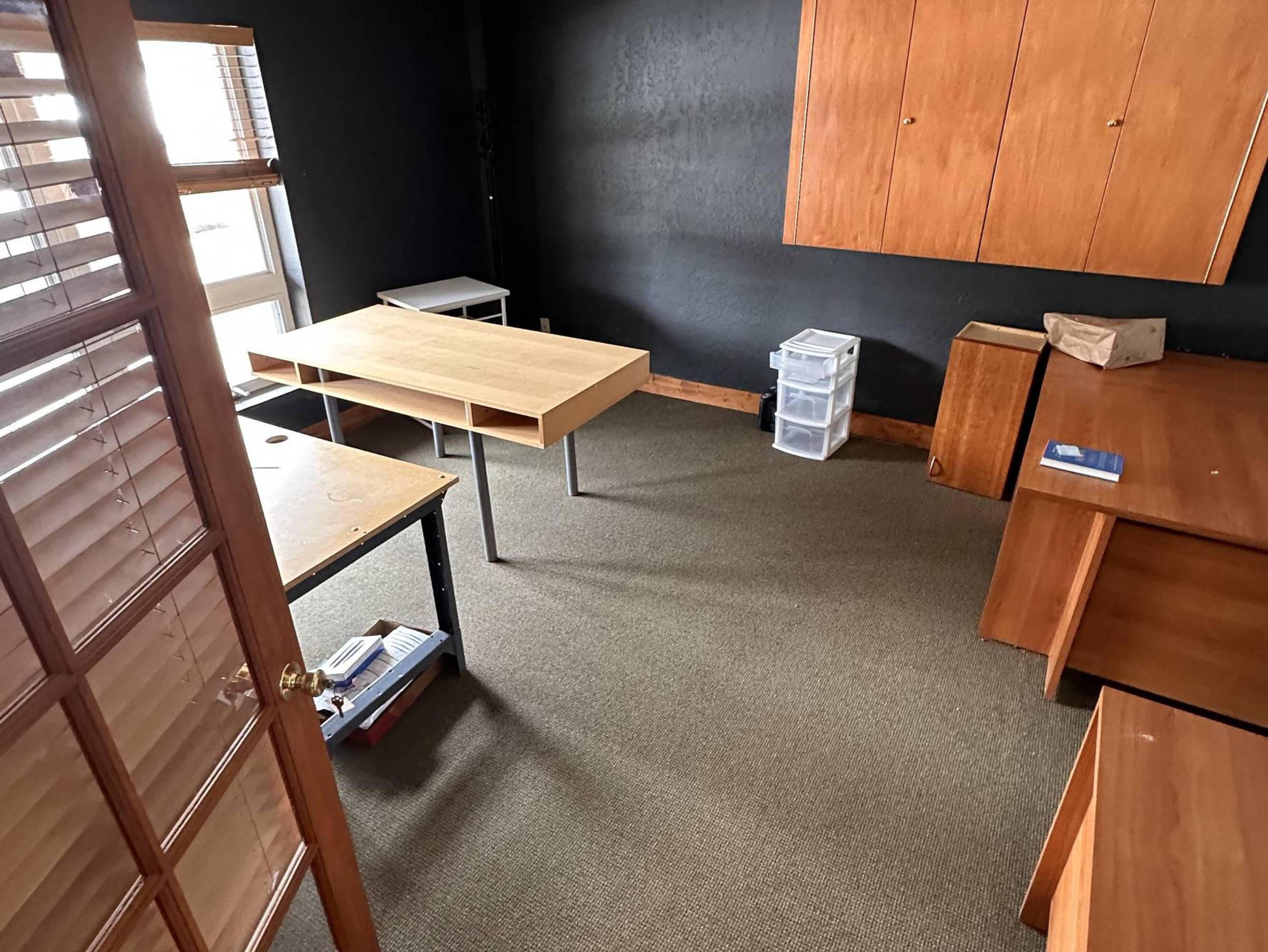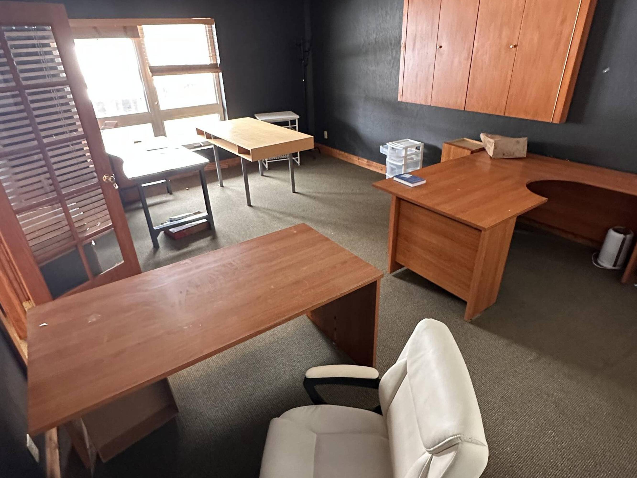 Office space with private deck and heated garage access.