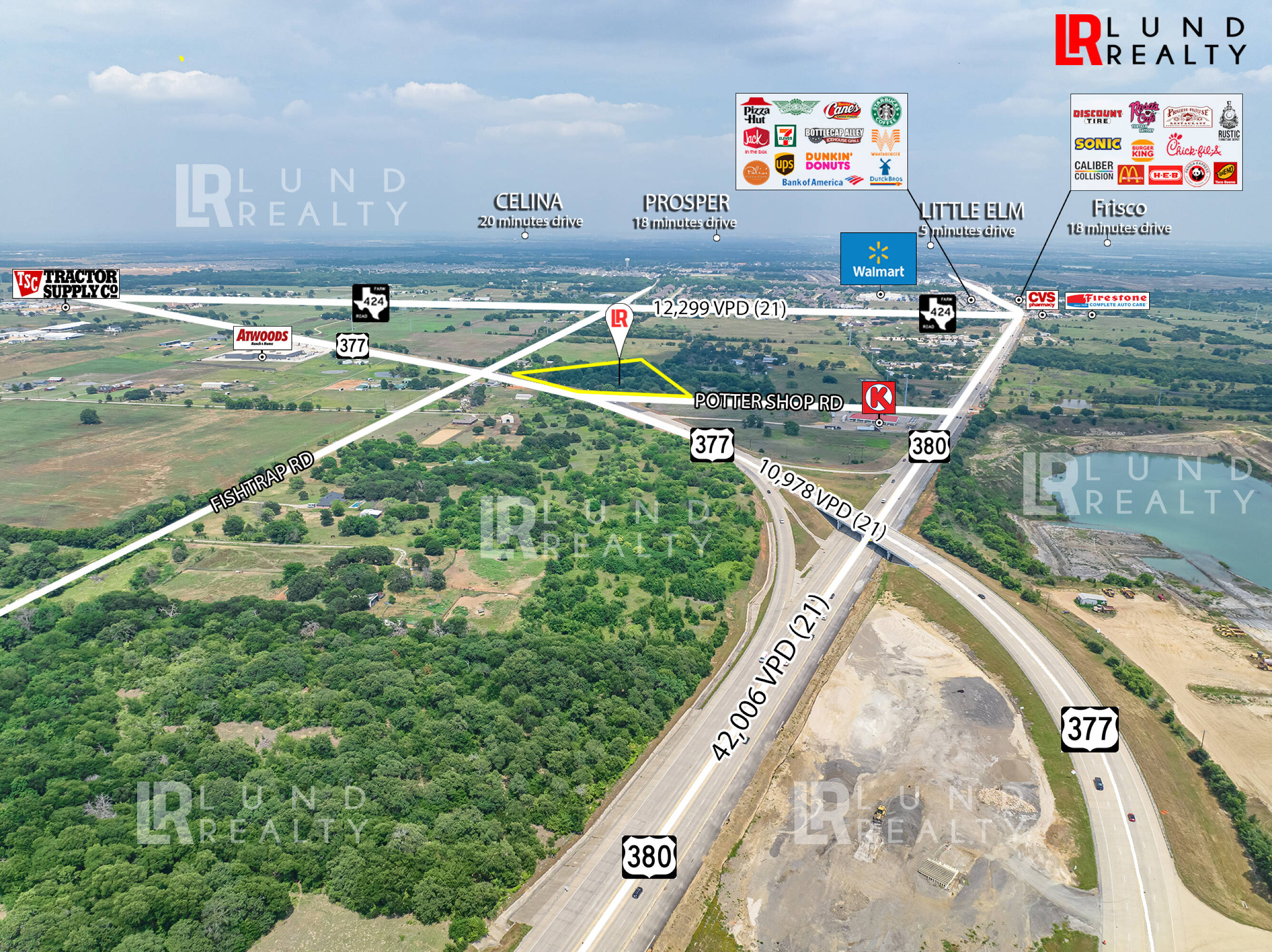 This prime retail and multi-use hard corner lot is situated in the high-growth area of North DFW, at the intersection of Highway 377 and Highway 380. These two highways are planned to become 6-lane roads. The city has proposed retail zoning for the property. The lot features approximately 453 feet of frontage on Highway 377 and 305 feet on Potter Shop Road, with access driveways from both streets. It offers easy access to Highway 380. Traffic counts from 2022 show 10,978 vehicles per day on Highway 377 and 43,715 vehicles per day on Highway 380. The property is located approximately 1 mile from major retailers such as Walmart, Starbucks, CVS, Bank of America, and McDonalds. This location presents a fantastic opportunity for development or to add to a land-hold portfolio.
