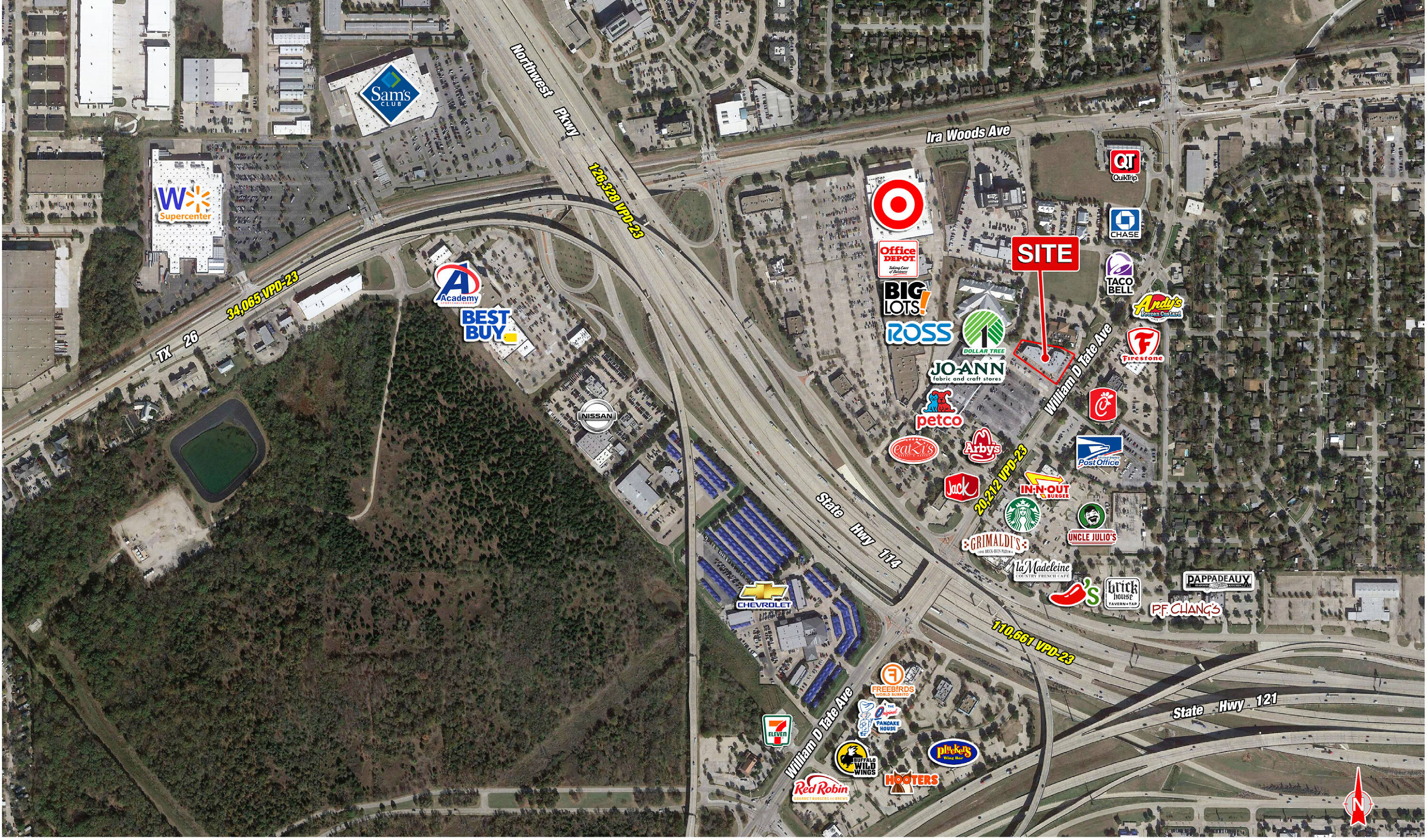 Retail opportunities are available near the intersection of William D. Tate Ave and Hwy 114, northwest of DFW International Airport. The completion of the Hwy 114 Connector has increased traffic in the area.