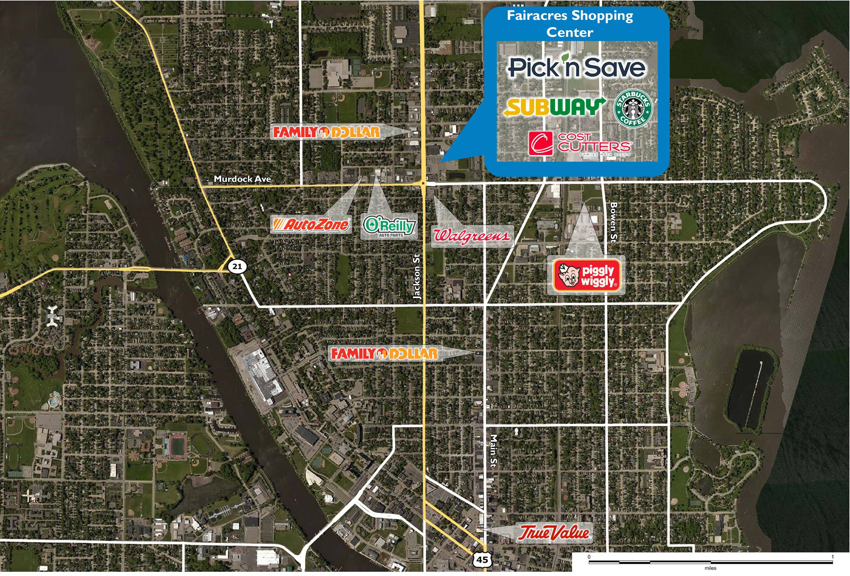 Fair Acres Shopping Center offers retail space for lease. The shopping center is anchored by Pick 'n Save and is the only grocery-anchored shopping center north of the river. The property is located less than two miles from The University of Wisconsin Oshkosh.