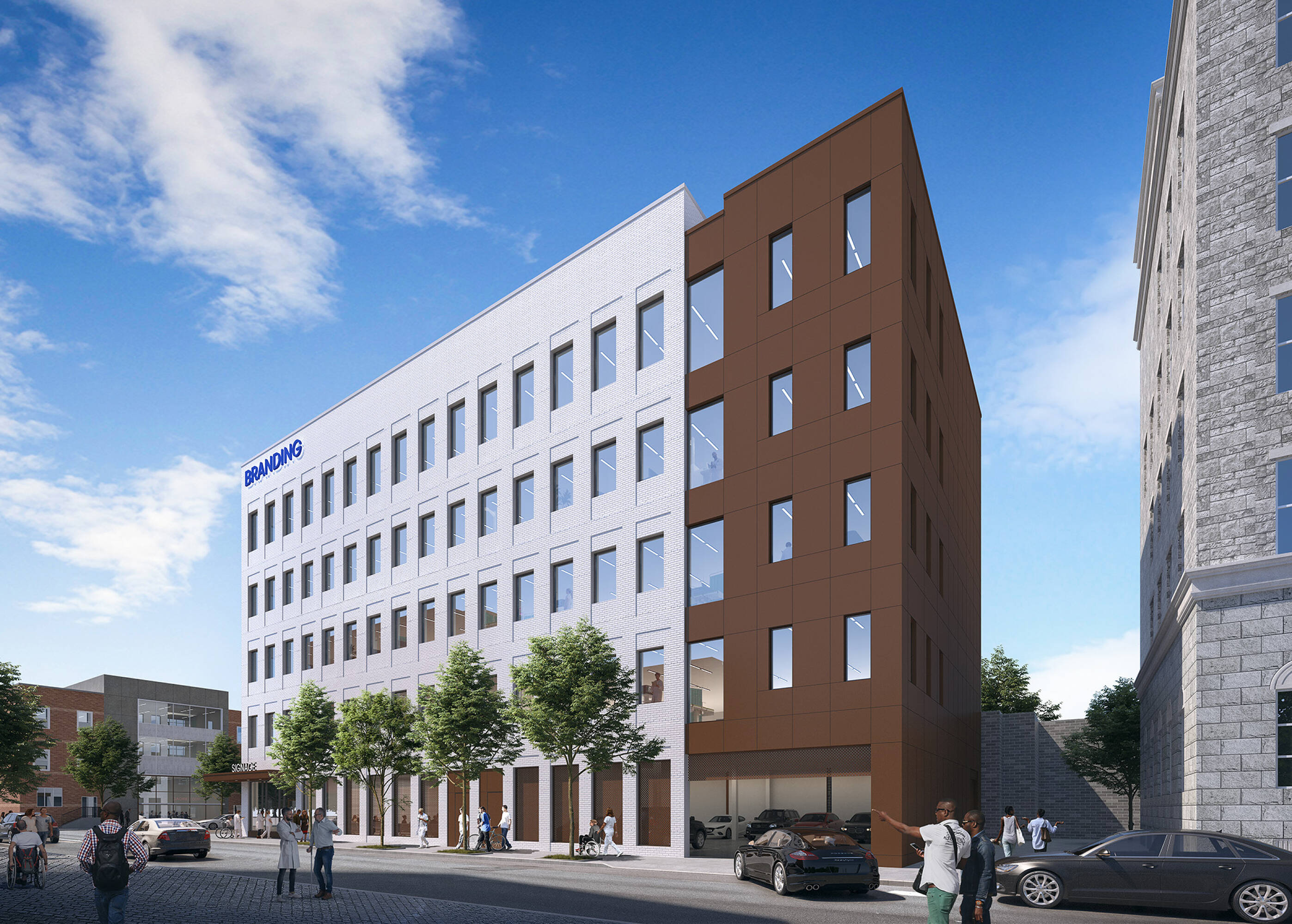 Built-to-suit office building with high visibility and transit access.