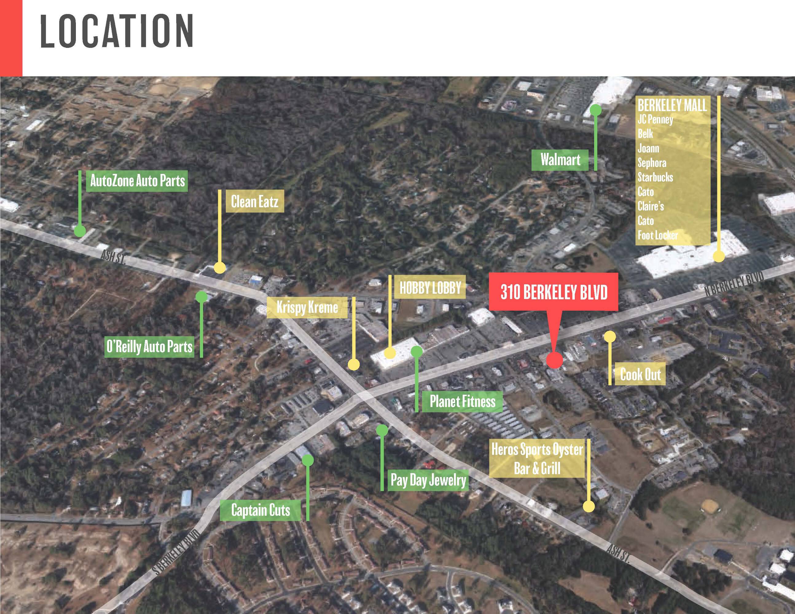 This commercial land is located in the Berkeley Boulevard/Highway 13 retail corridor, approximately 1/2 mile from Seymour Johnson Air Force Base and Berkeley Mall.