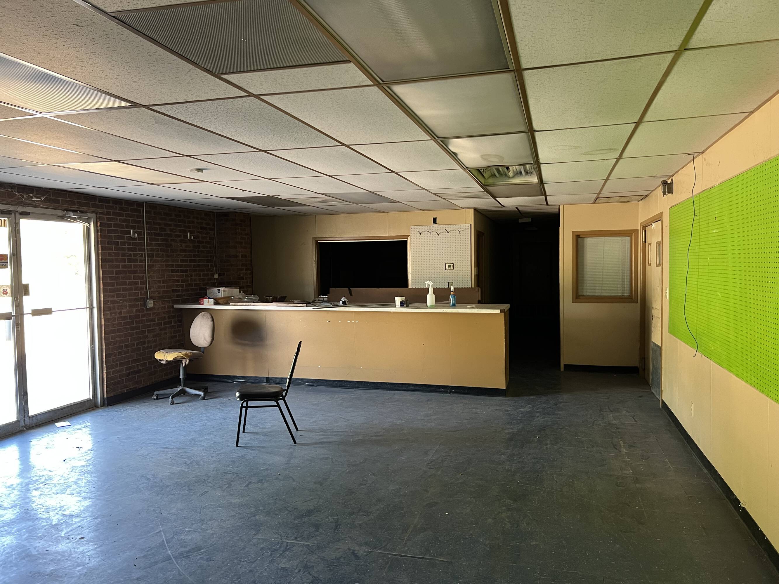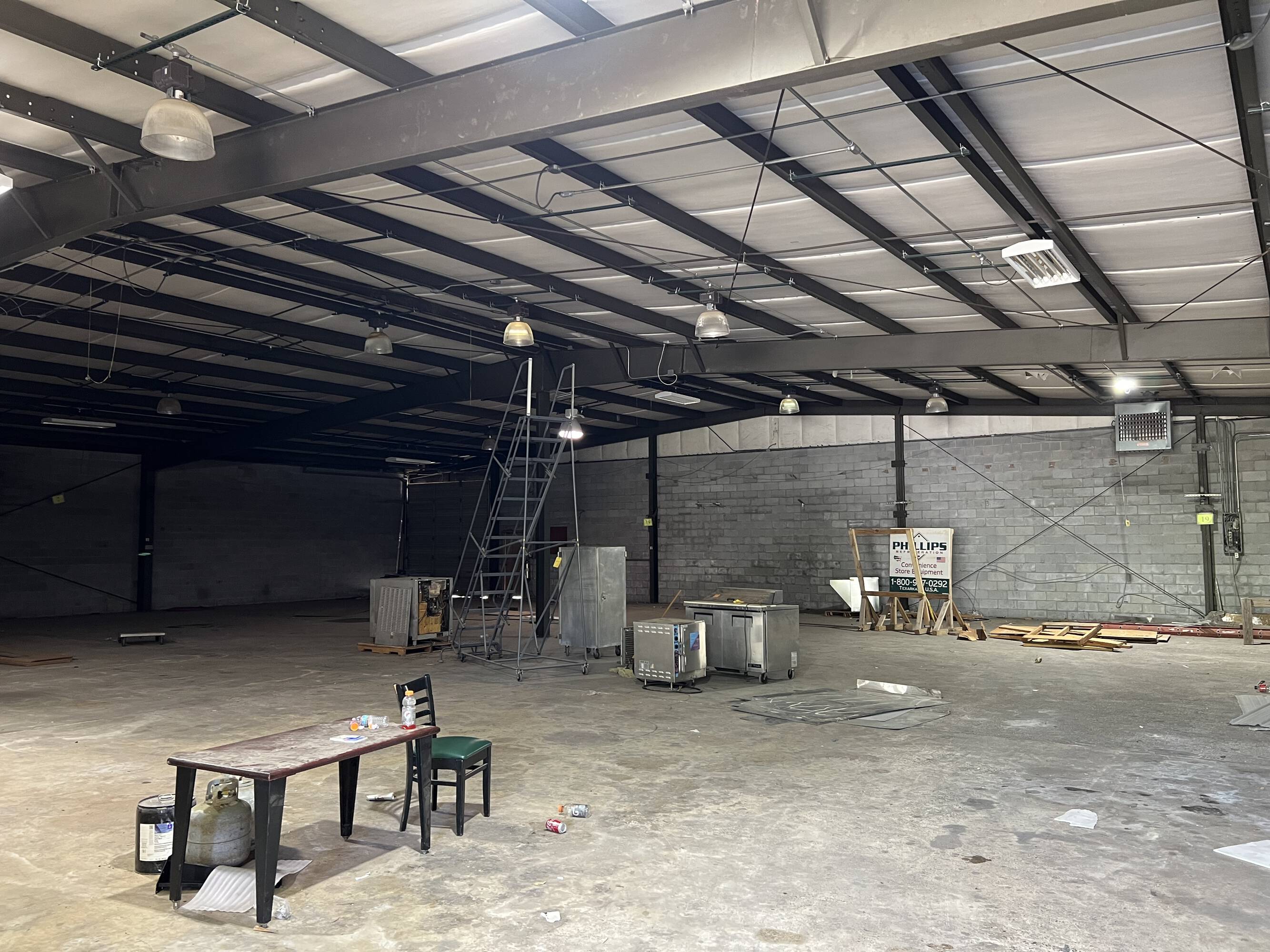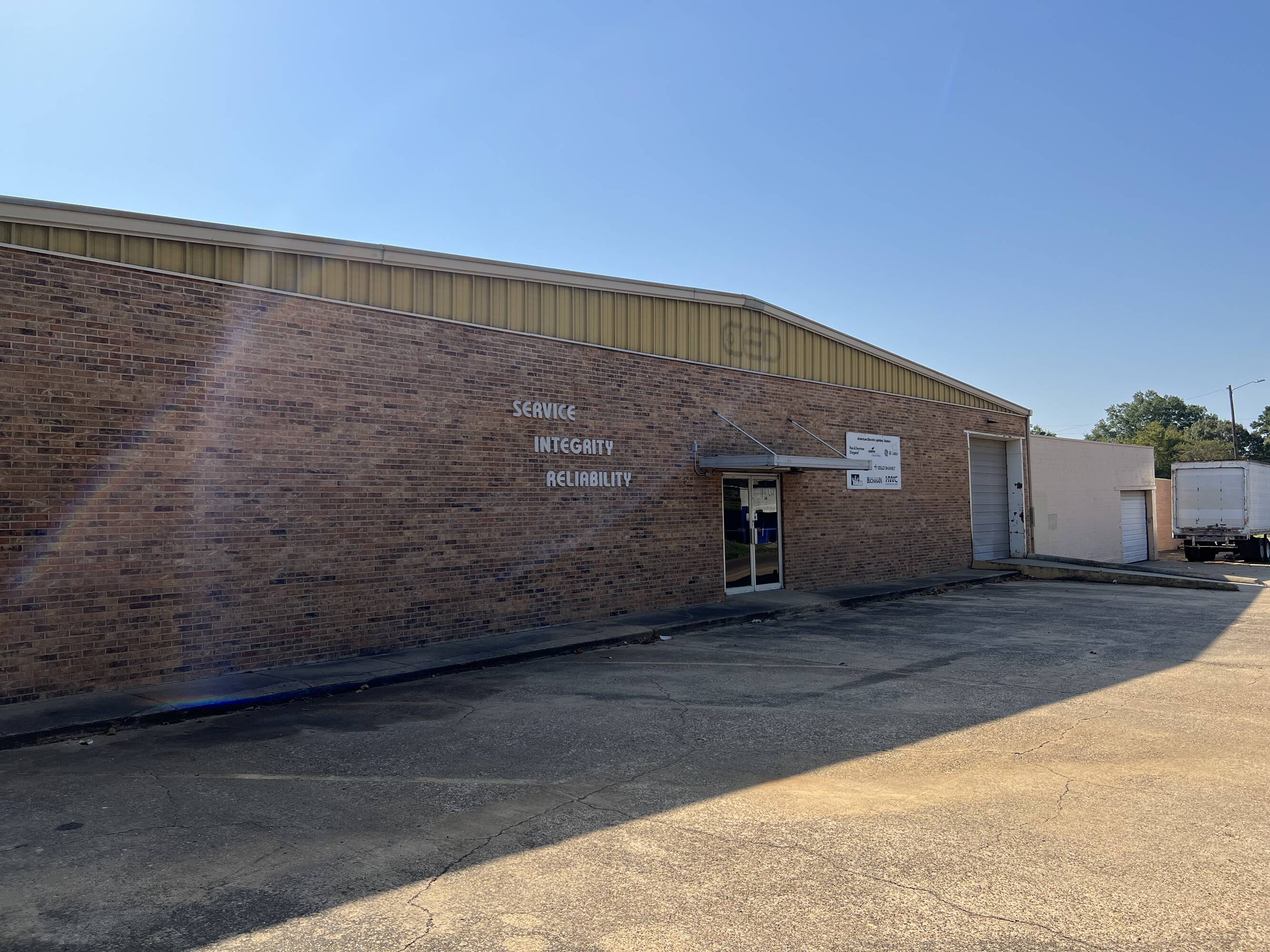 Warehouse with roll-up doors, loading dock, and office space.