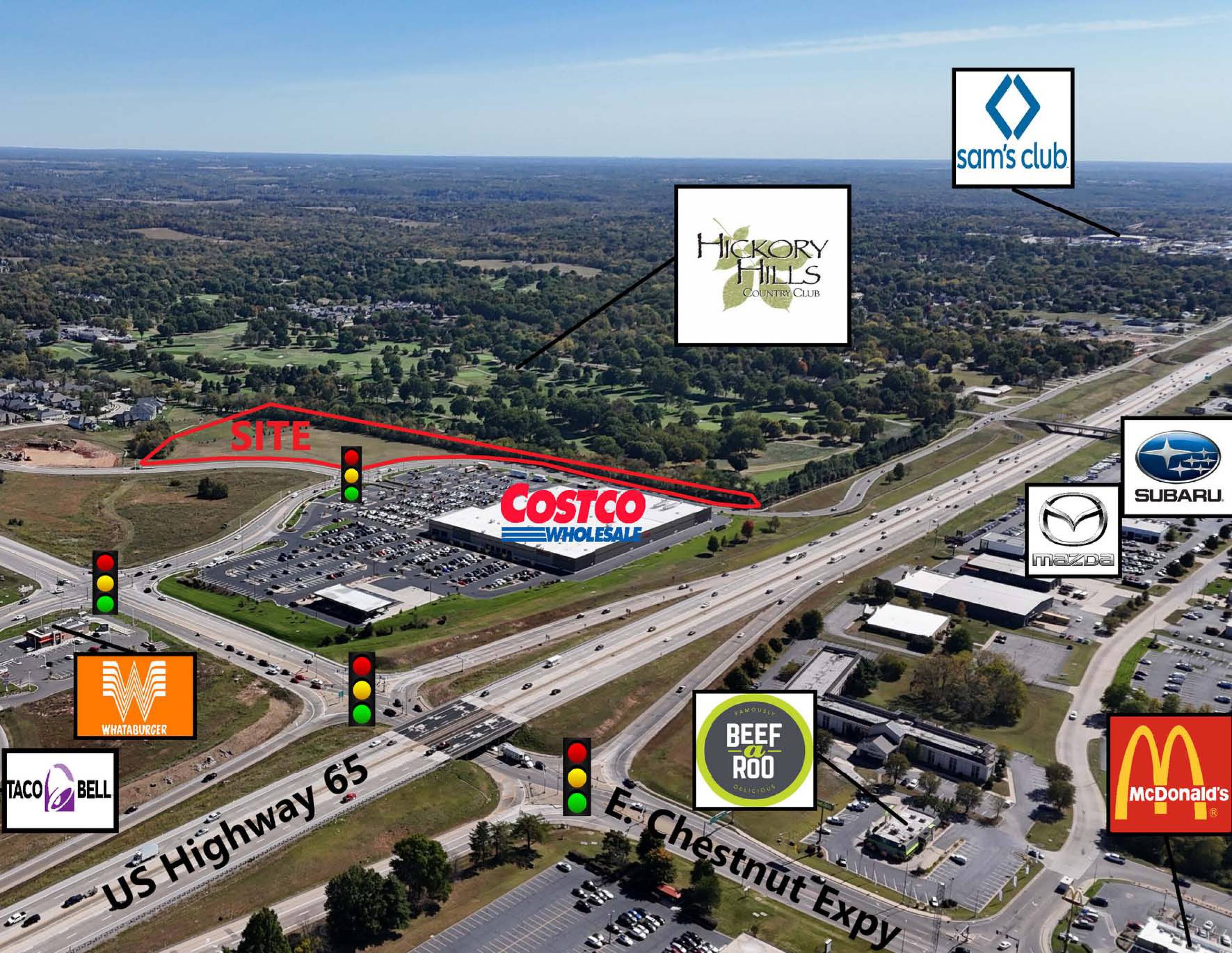 This property features: Prime location directly east of Costco Wholesale and other national retailers.; High traffic exposure: Over 33,887 vehicles per day on E Chestnut Expressway and over 60,000 vehicles per day on US Highway 65.; 11.53‑acre tract can be sold as‑is or subdivided into smaller tracts (2.99‑4.53 acres).