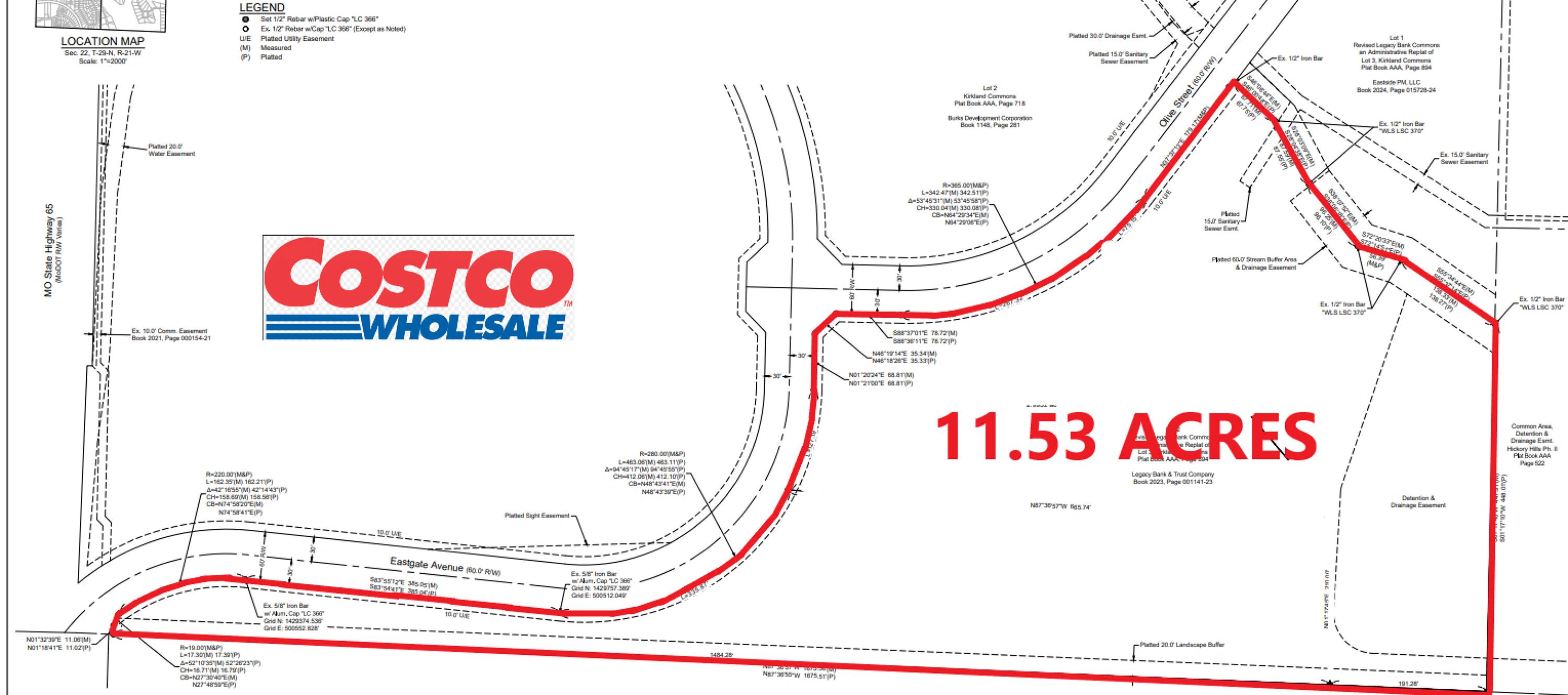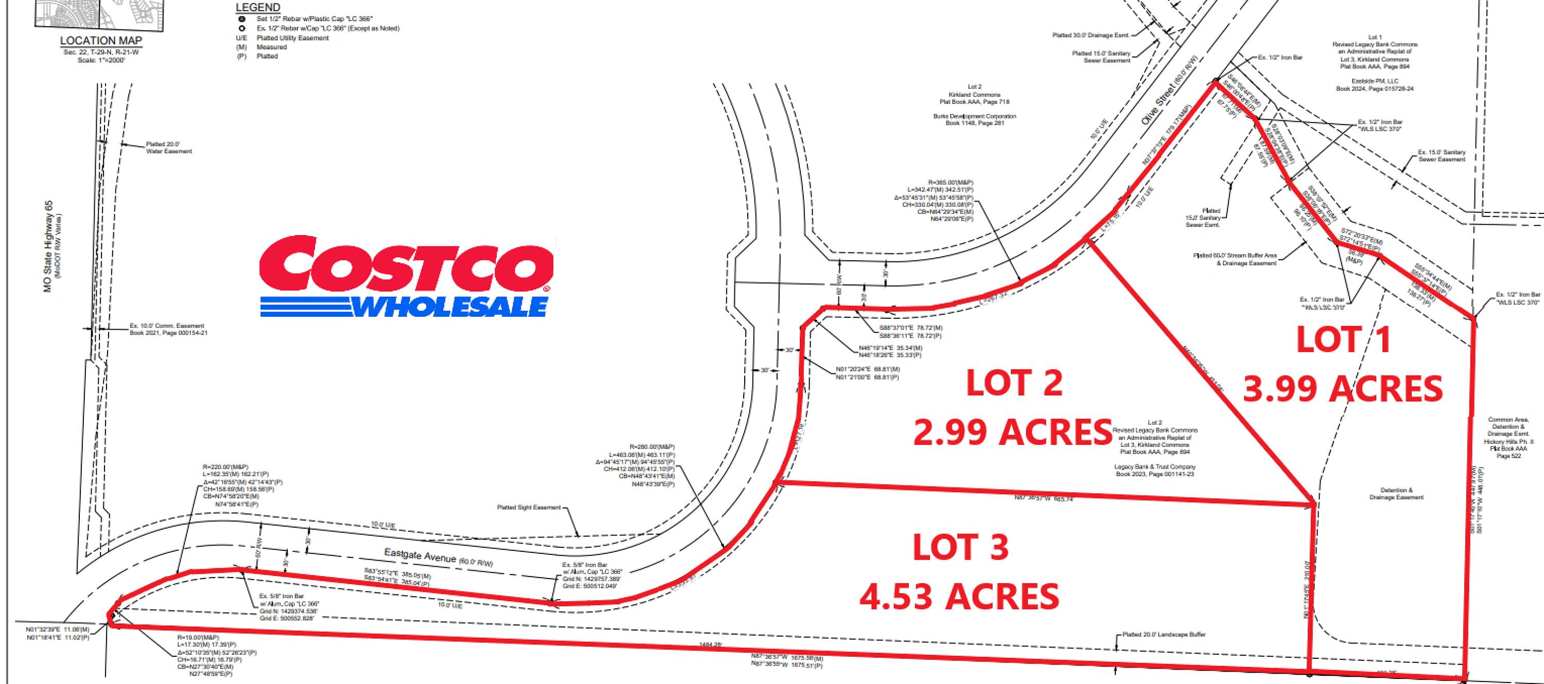 This 11.53-acre retail development lot is available for sale at the signalized corner of Olive Street and Eastgate Ave in Springfield, MO. The tract can be sold as-is or subdivided into smaller tracts ranging from 2.99 to 4.53 acres. The property is in a highly desirable location directly east of Costco Wholesale and other national retailers, with access and exposure to over 33,887 vehicles per day on E Chestnut Expressway and over 60,000 vehicles per day on US Highway 65. The site is zoned Planned Development 298. A preliminary site layout showcasing up to 135,000 SF of buildable square footage & parking garage has been completed. The location is near many local and national retailers, restaurants, wholesalers, and other businesses, with immediate access to major thoroughfares including US Highway 65 and E. Chestnut Expressway. Neighboring businesses include Costco Wholesale, Menards, Mister Car Wash, Jiffy Lube, Domino's Pizza, Taco Bell, McDonalds, Beef-a-Roo, and Whataburger. Permitted uses and use restrictions are available from the listing broker.