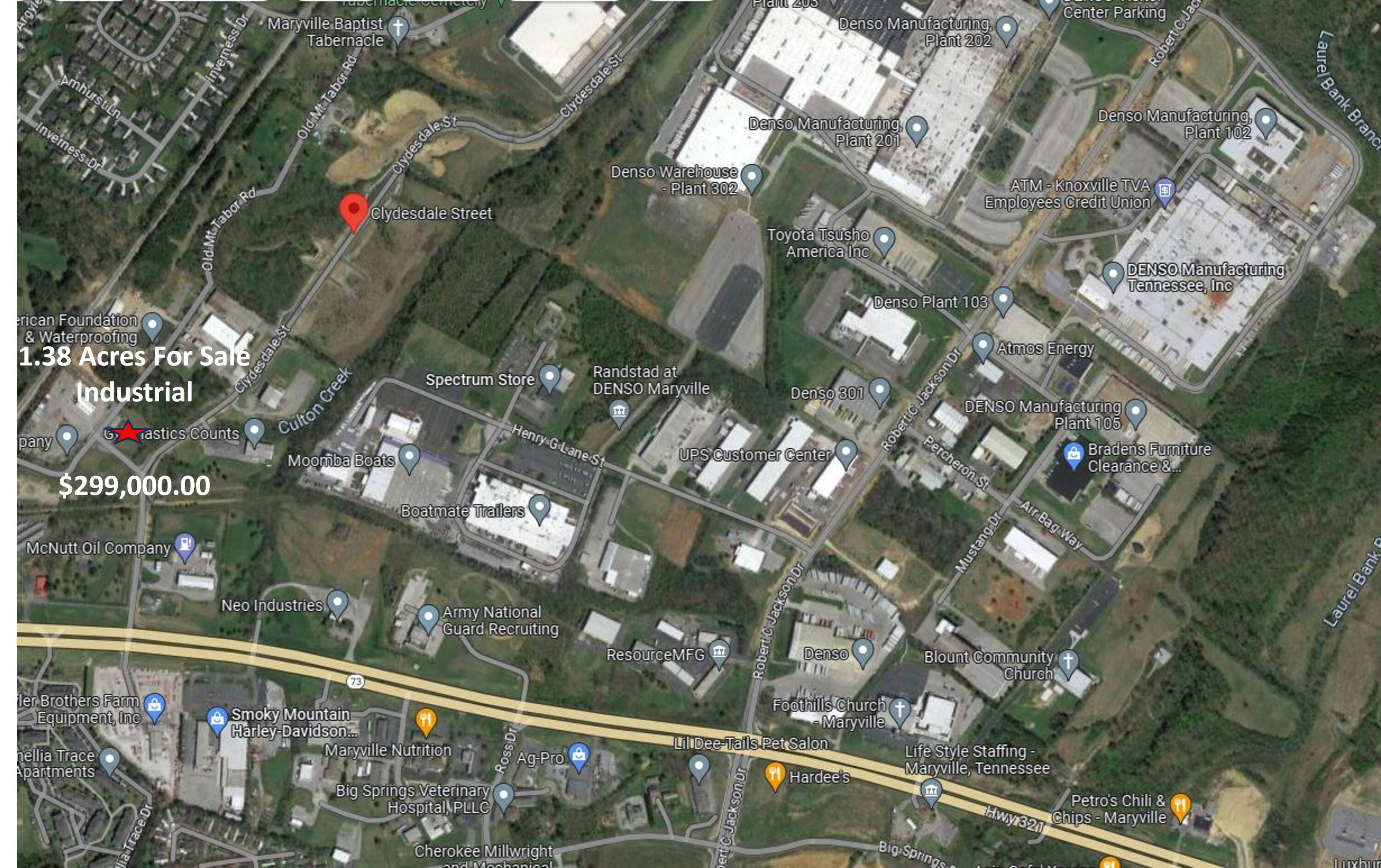 Available for sale is approximately 1.38 acres of industrial land, which the owner is willing to subdivide from the current parcel. The site has the ability for a buyer to construct an approximately 10,000 square foot warehouse. The land is suitable for building and all utilities are available, with the exception of public gas. Access to the property is provided by a public road. The area is zoned for industrial use, and several industrial buildings are located in the immediate vicinity. The property is located in the City of Maryville, just off Route 321 in west Maryville. Nearby businesses include McNutt Oil Company, US Tanks, Macawber Engineering, Gymnastics Counts, and Empire Distributors. Denso is located within 1.0 mile of the property. The owner is willing to provide owner financing and build-to-suit options.