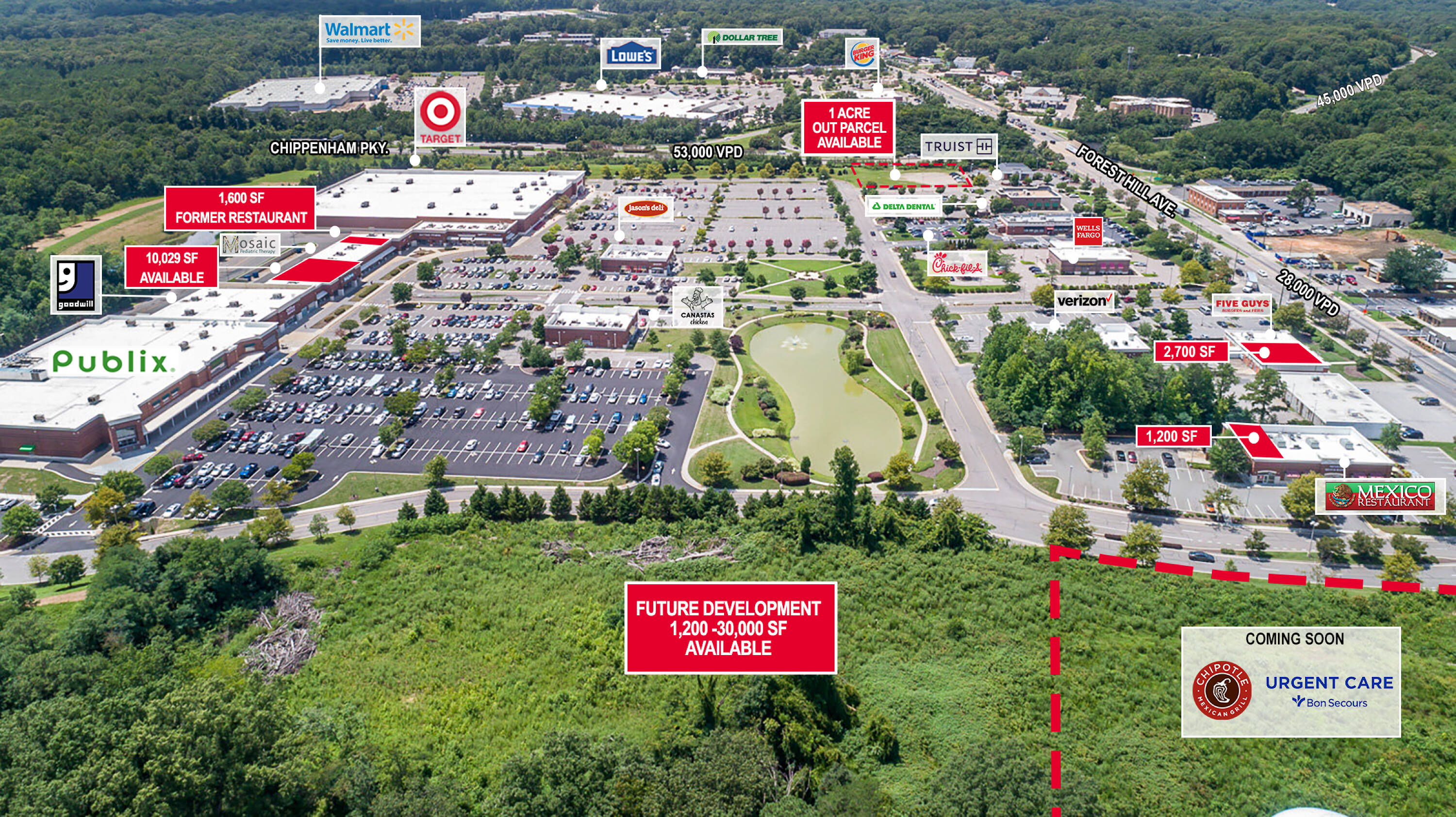 Several retail spaces and outparcels are available for rent near 7101 & 7045 Forest Hill Ave, Richmond, VA 23225. The location is near Publix and Target.