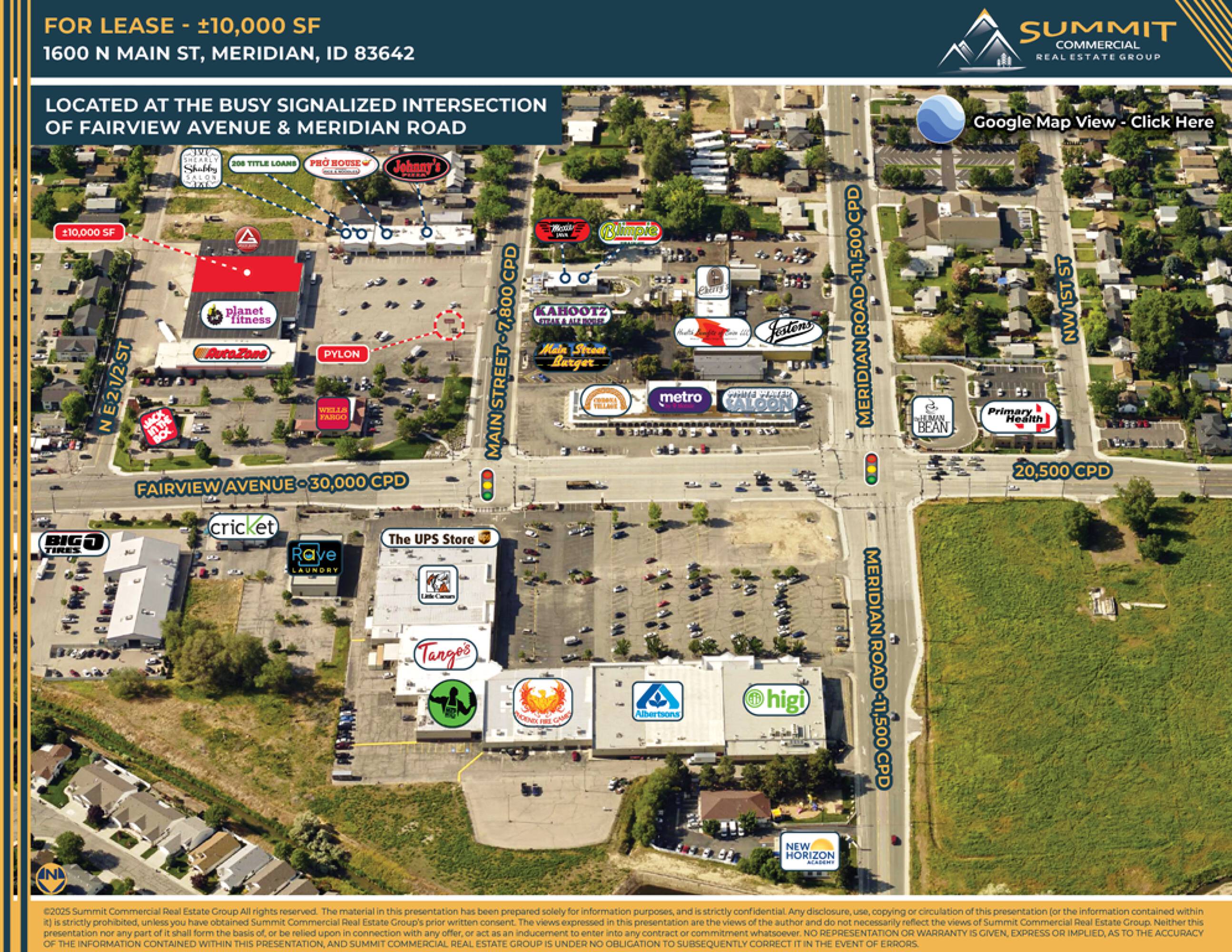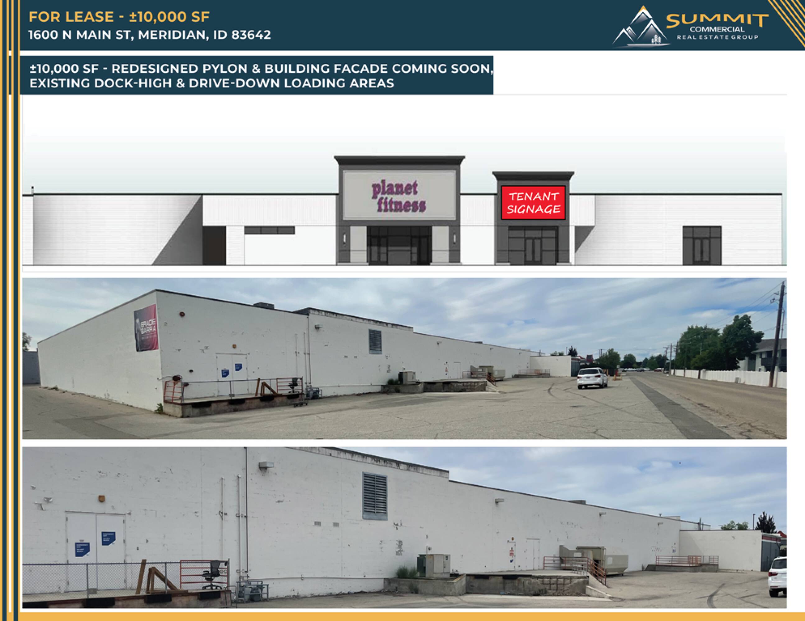 A retail space is available for lease at a redeveloped retail center located at 1600 N Main Street, Meridian, ID. The property, situated on a 2.72-acre lot, has 10,000 square feet of space remaining for lease, with 26,000 square feet already leased to Planet Fitness. Built in 1978 and remodeled in 1980, the property is scheduled for further remodeling in 2025. The location benefits from high traffic counts of 30,000 cars per day. The zoning is C-C. The property includes building and pylon signage, open and drive-down loading docks, and 102 parking stalls, equating to a ratio of 2.46 stalls per 1,000 square feet. Lease rates, terms, and tenant improvement allowances are negotiable.
