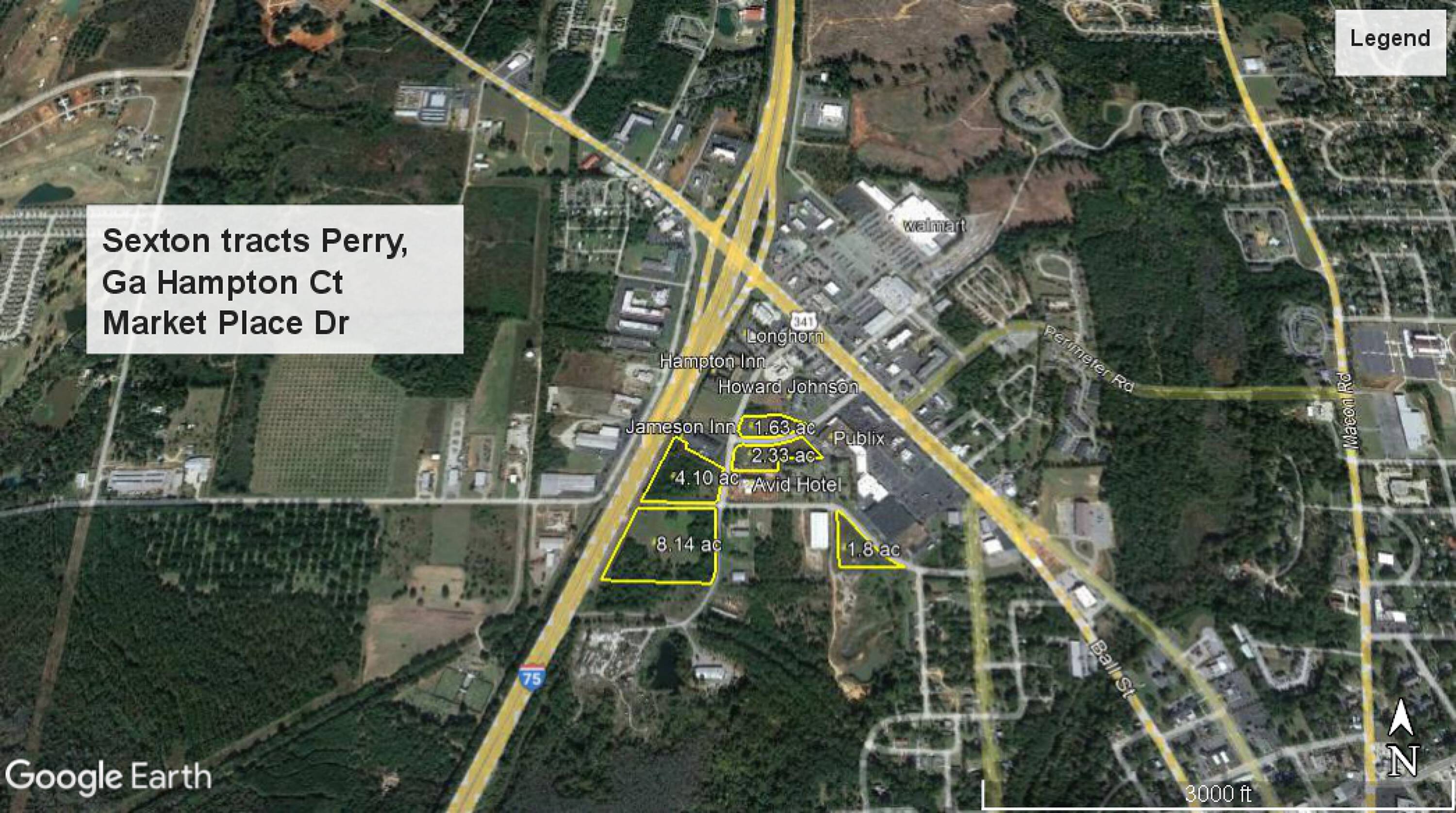 Multiple commercial outparcels are available in Perry, Georgia, offering high visibility and convenient access to I-75 via Sam Nunn Parkway. This corridor is a primary commercial area for retail, fast food, and hospitality businesses. The tracts are zoned C-2 and feature available utilities, paved road frontage, and flat topography. The parcels are cleared and come in varying sizes to accommodate different commercial uses. Available tracts include: 1.63 acres at 112 Market Place Drive; 2.33 acres on Market Place Drive; 4.1 acres at Hampton Court and Smith Road; 8.14 acres at Hampton Court and Smith Road; and 1.8 acres on Smith Road.