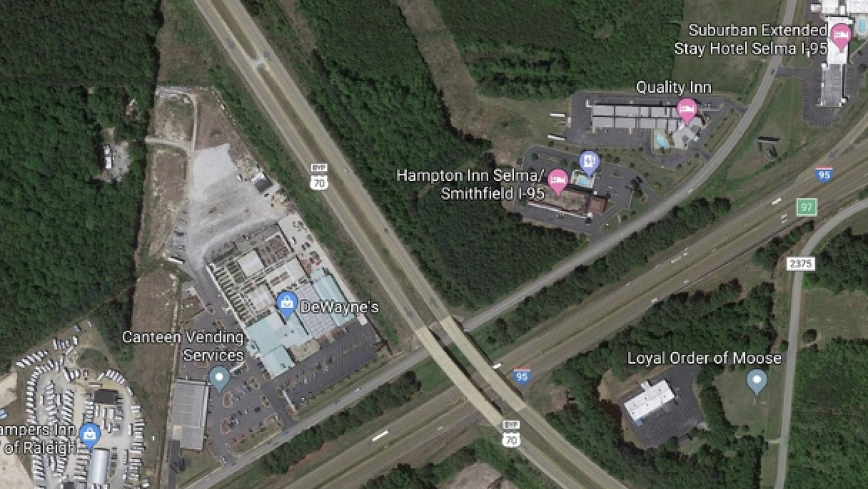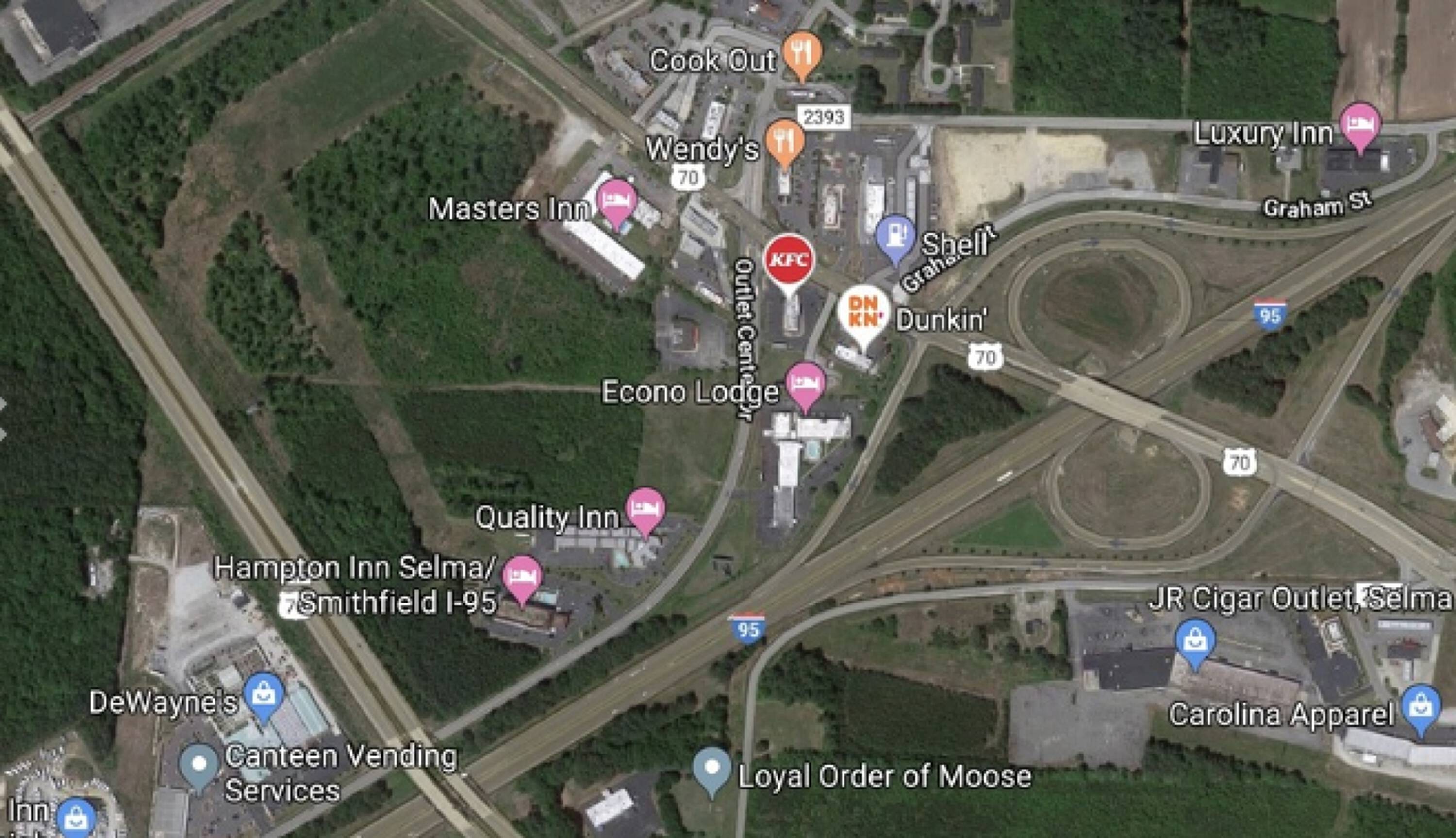 This 5.17-acre tract, comprising two parcels, is situated in a highly accessible location at the I-95/US 70 Interchange (Exit 97). The property is suitable for development into hotels, retail spaces, restaurants, or other commercial businesses. It is located next to La Quinta Inn & Suites and a quarter of a mile from the Carolina Premium Outlets, a shopping destination in Eastern North Carolina. The site is also 2.5 miles from Eastfield Business Park, approximately 30 minutes from Raleigh, and 30 minutes from Goldsboro. The property benefits from convenient access to I-95, Business 70, and Outlet Center Drive. The surrounding corridor is undergoing redevelopment and features a concentration of restaurants, including Dunkin Donuts, Kentucky Fried Chicken, Hardee’s, Popeye's, Wendy's, Cook Out, and Waffle House, as well as hotels such as Hampton Inn, La Quinta Inn, and Econo Lodge. Census reports indicate an annual visitation of 7 to 9 million people to the area.