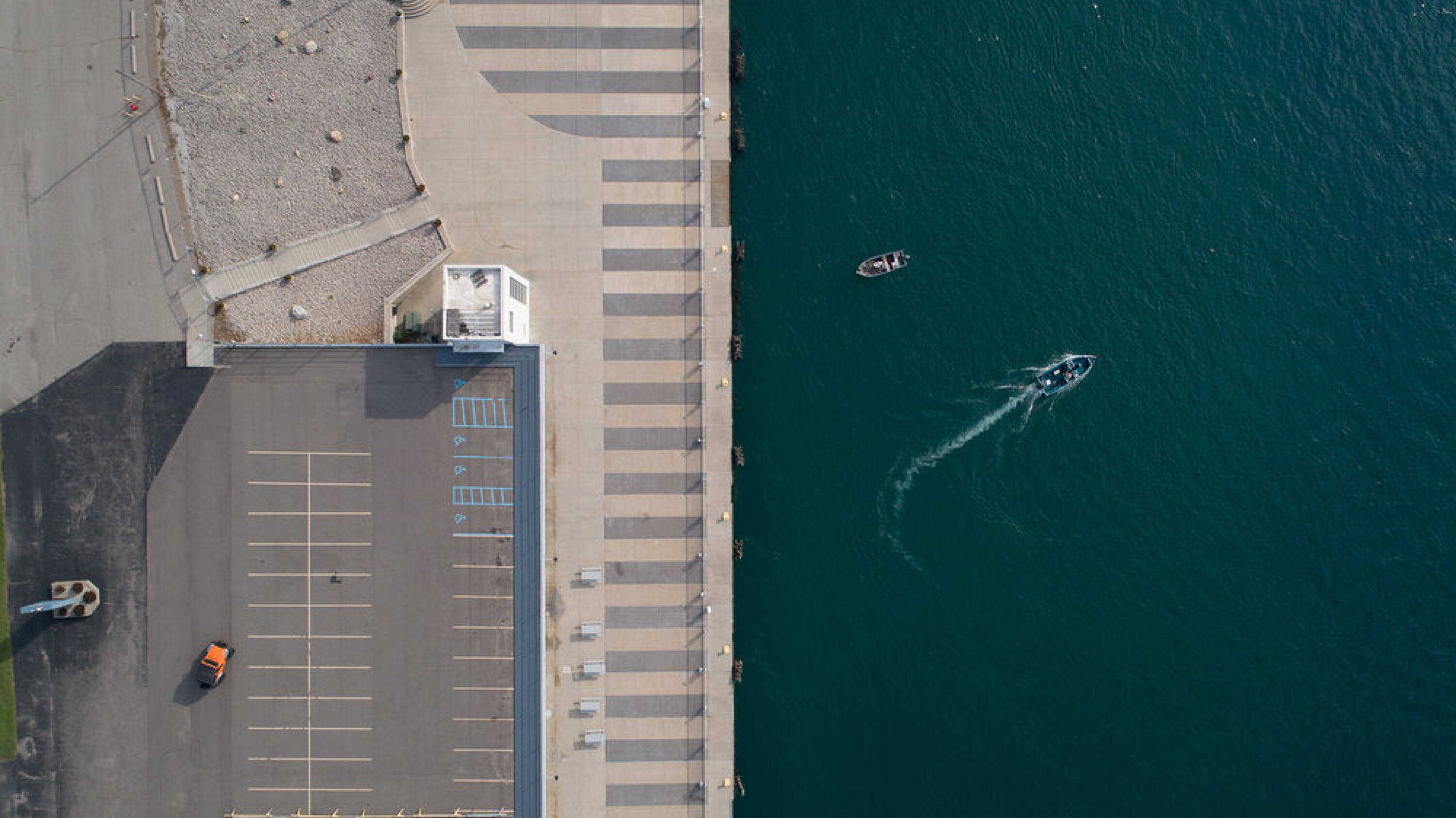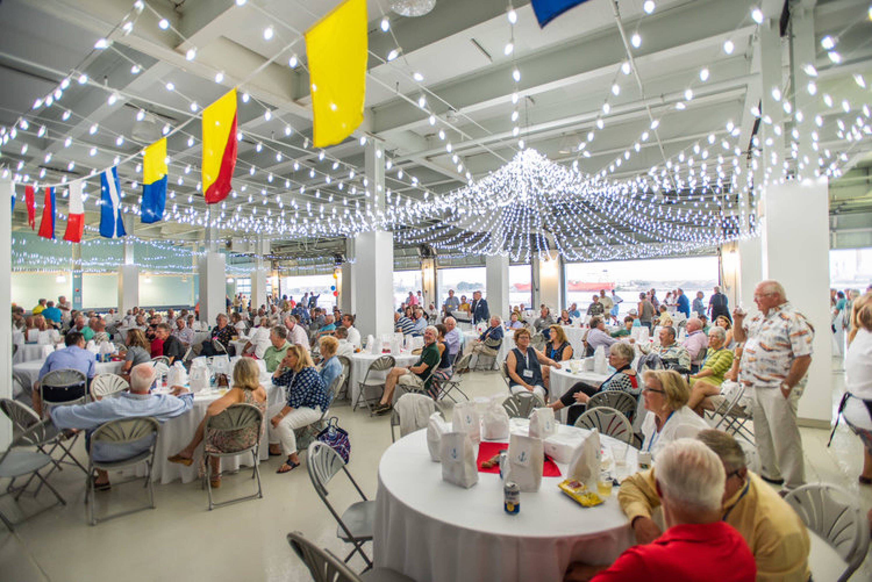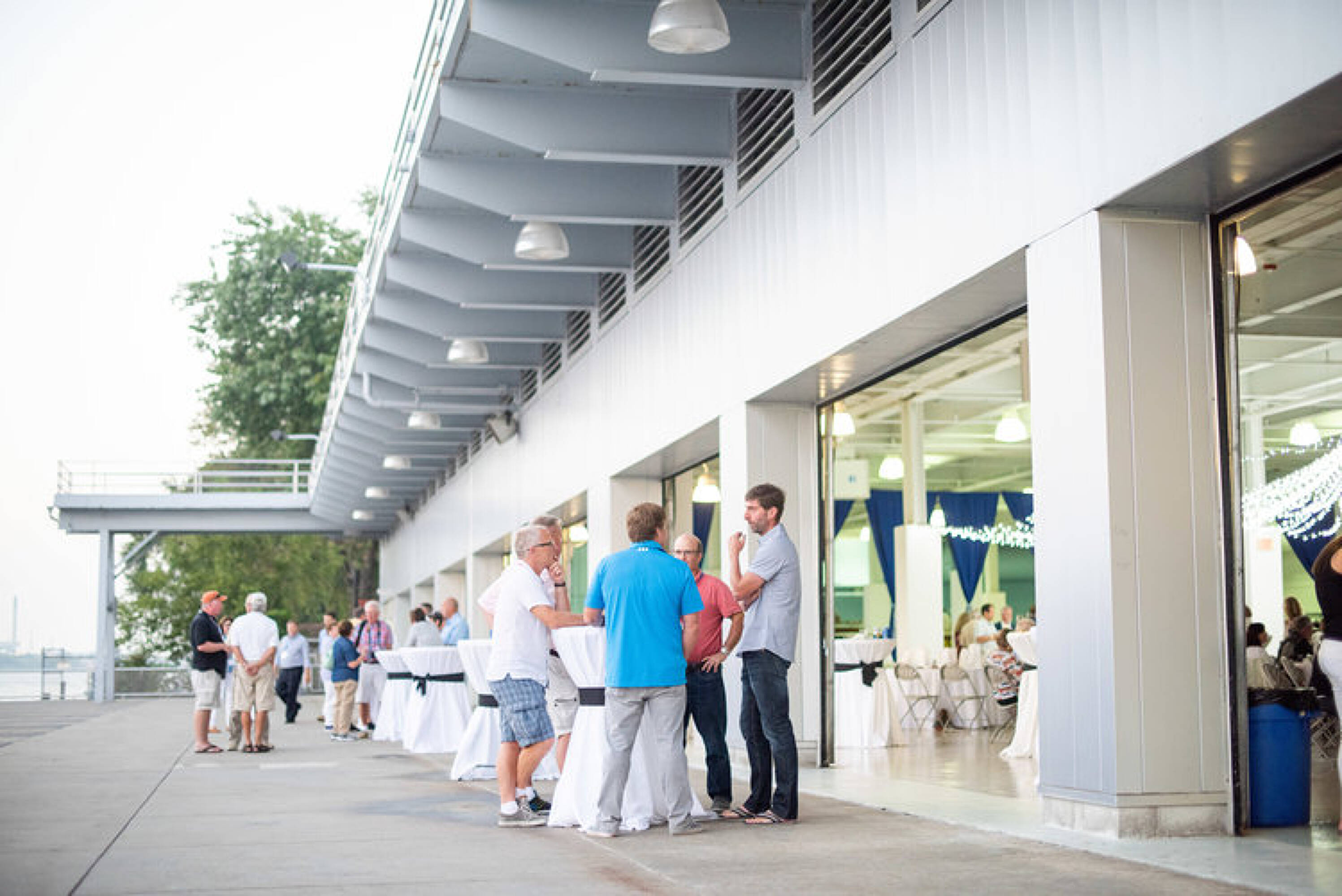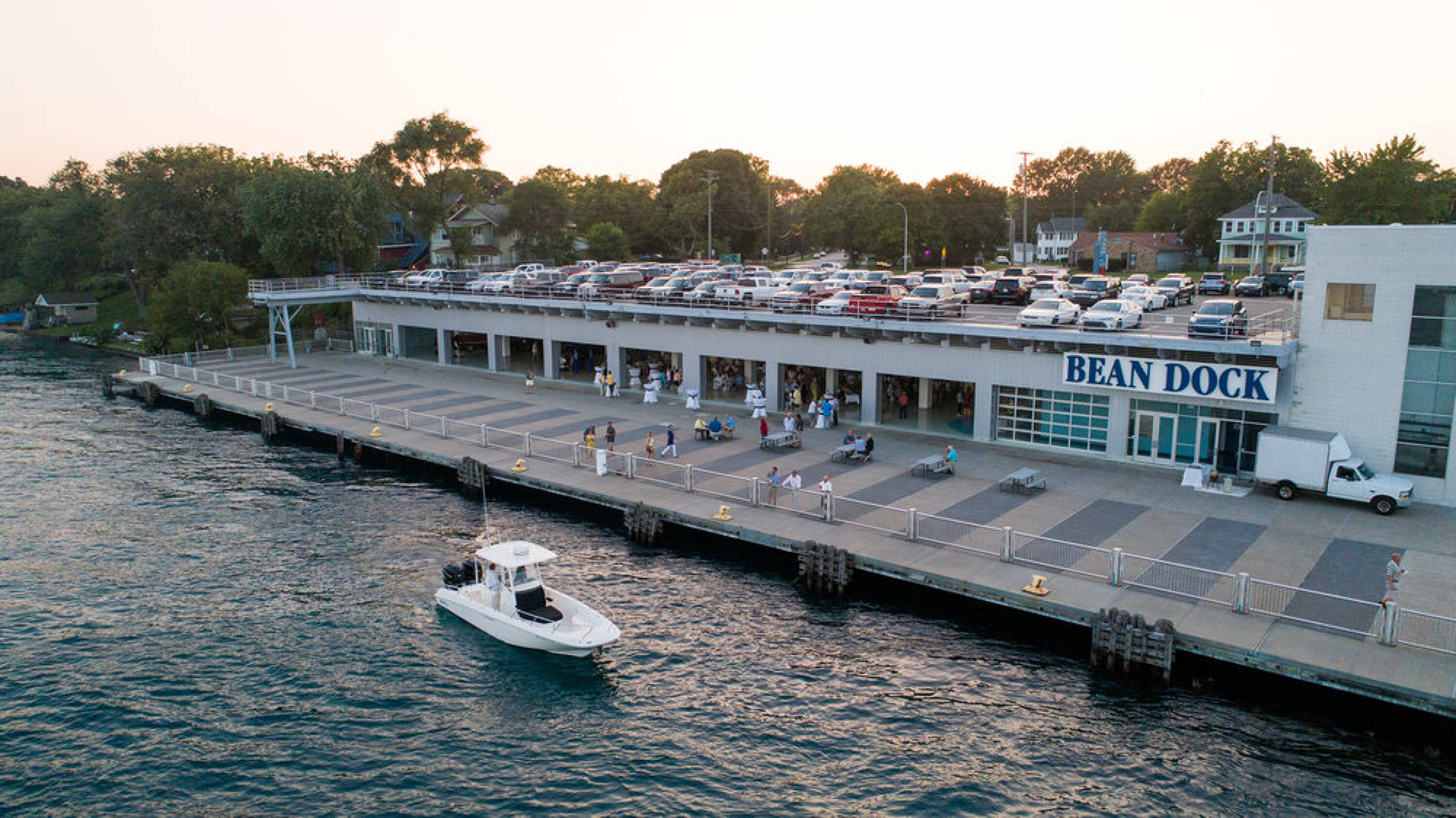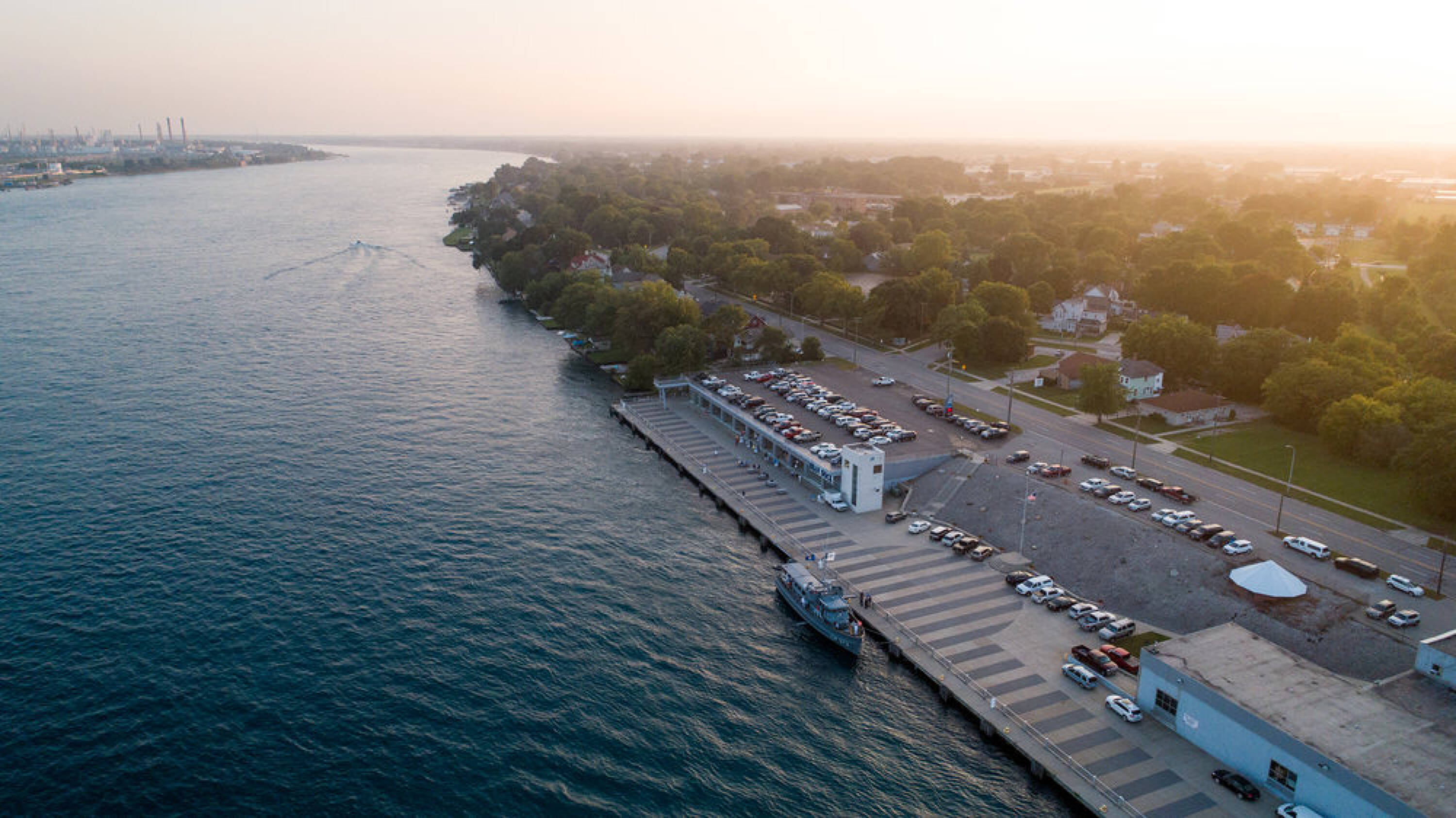 Waterfront terminal facility with docking for various vessels.
