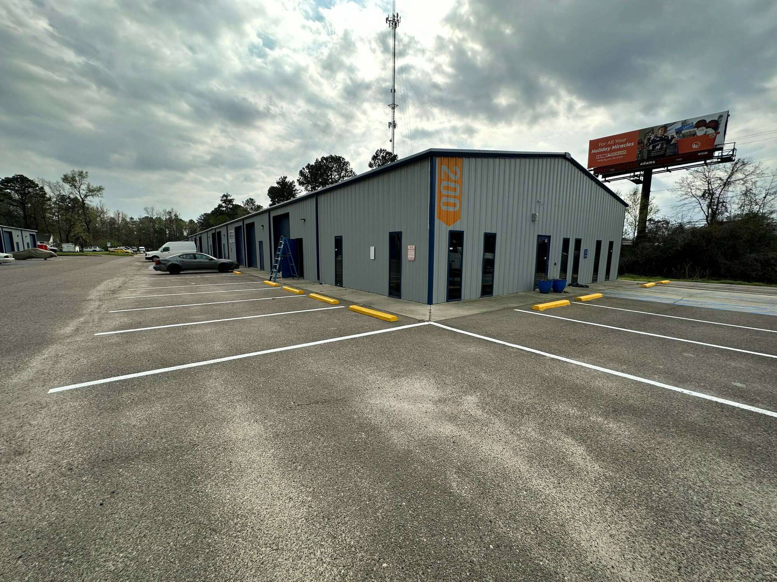 Flex space with office, storage, and highway visibility.