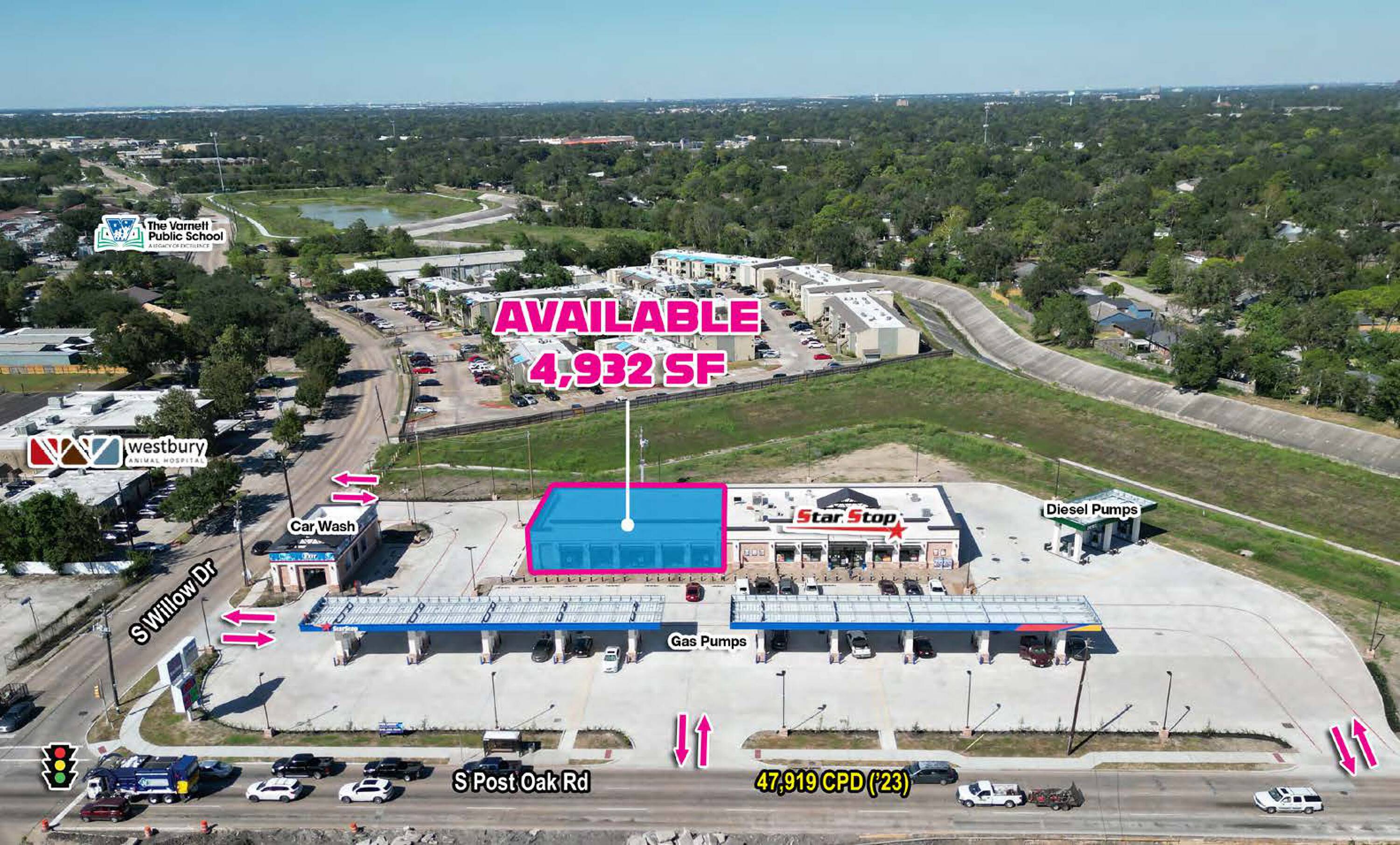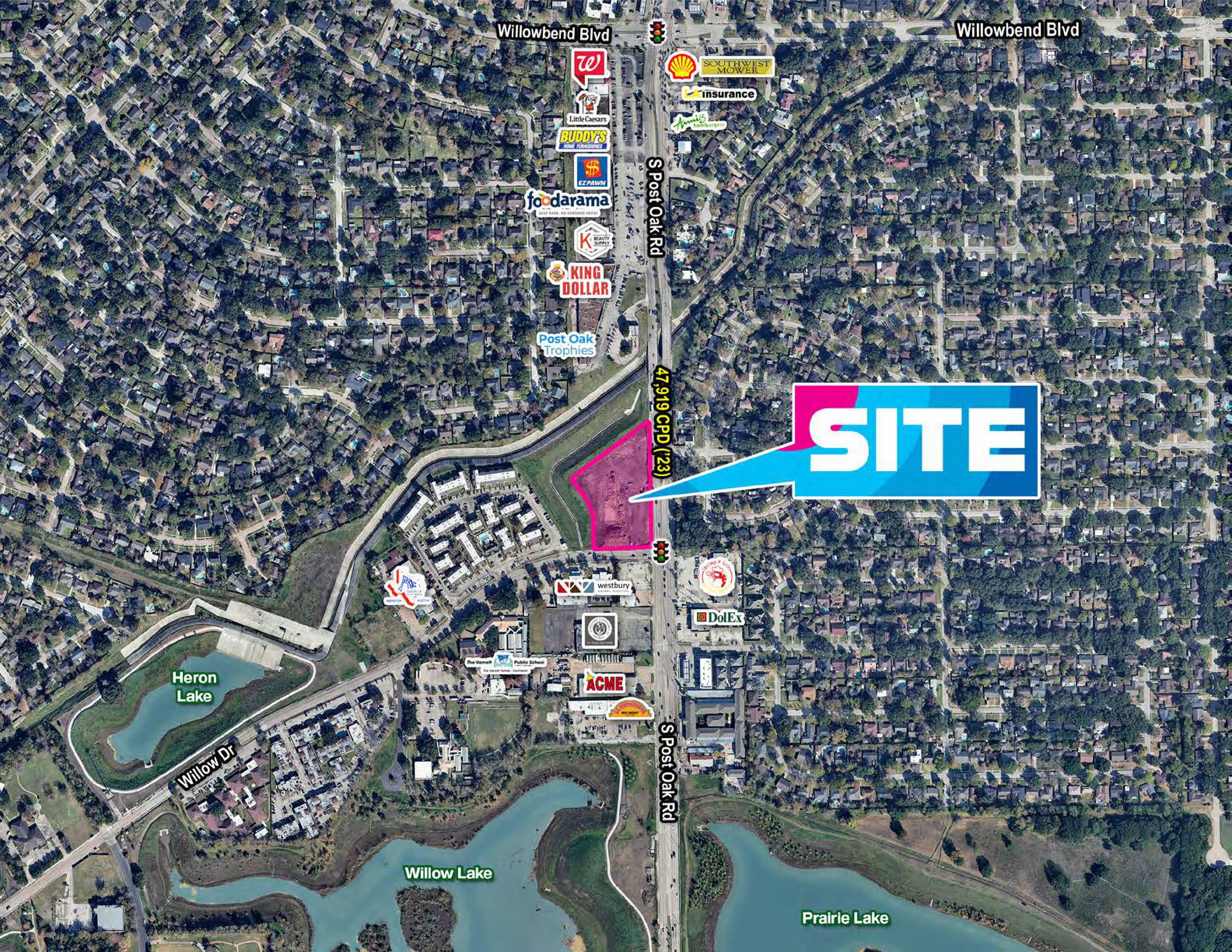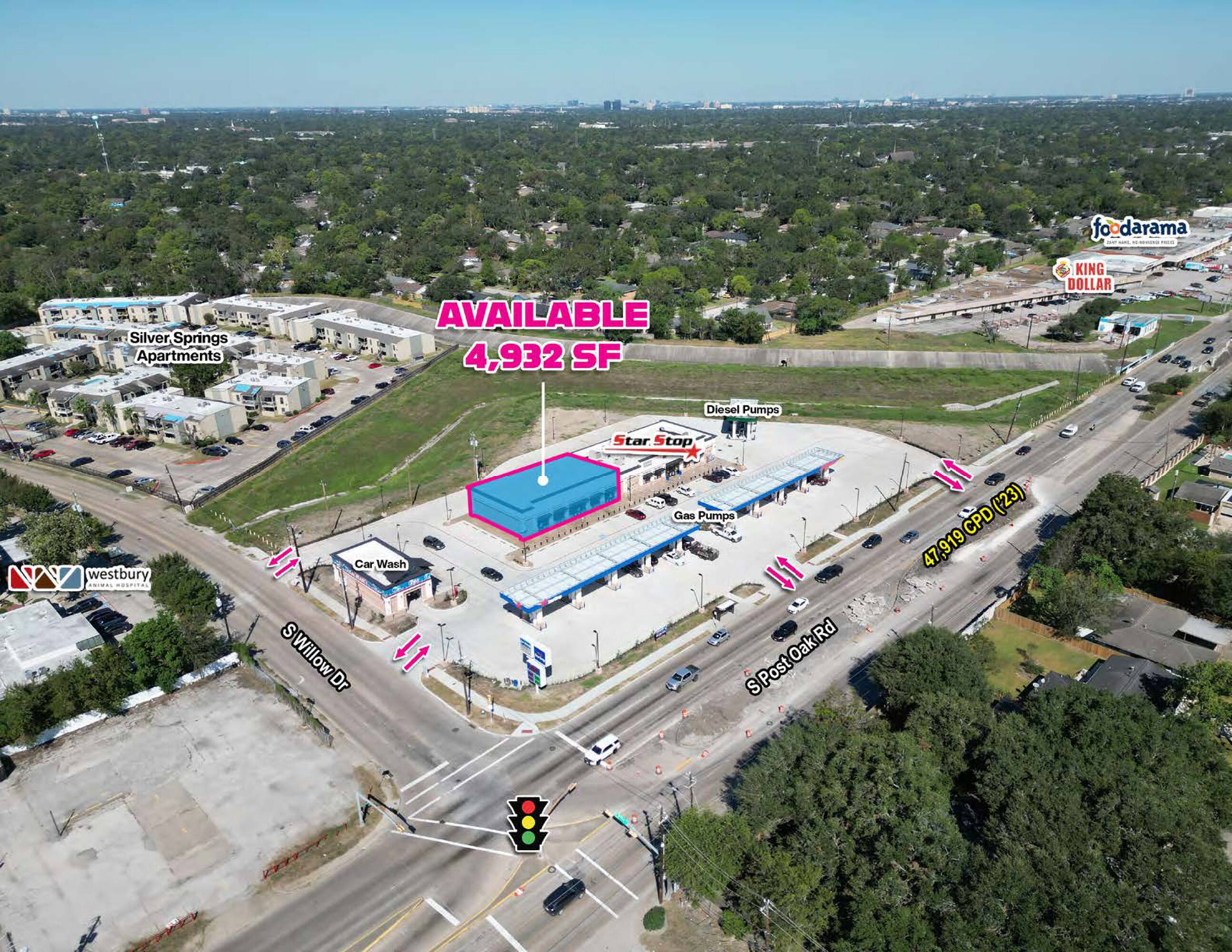 This property features: Brand new retail center adjacent to a high‑traffic Star Stop convenience store and gas station.; Located at a signalized intersection (S Post Oak Rd & S Willow Dr) with easy access to Hwy 90 Alt.; Positioned within a dense, established residential area.