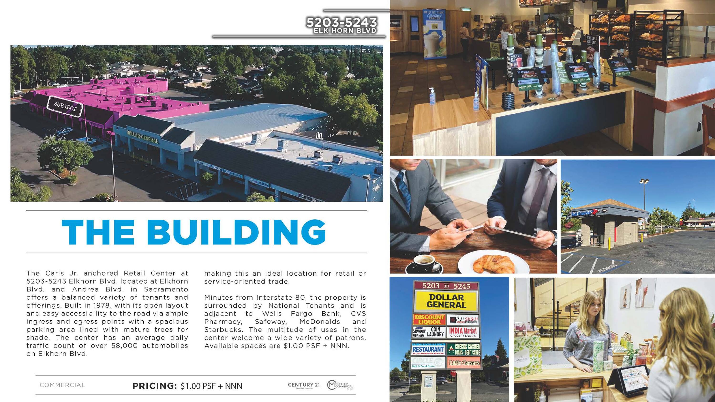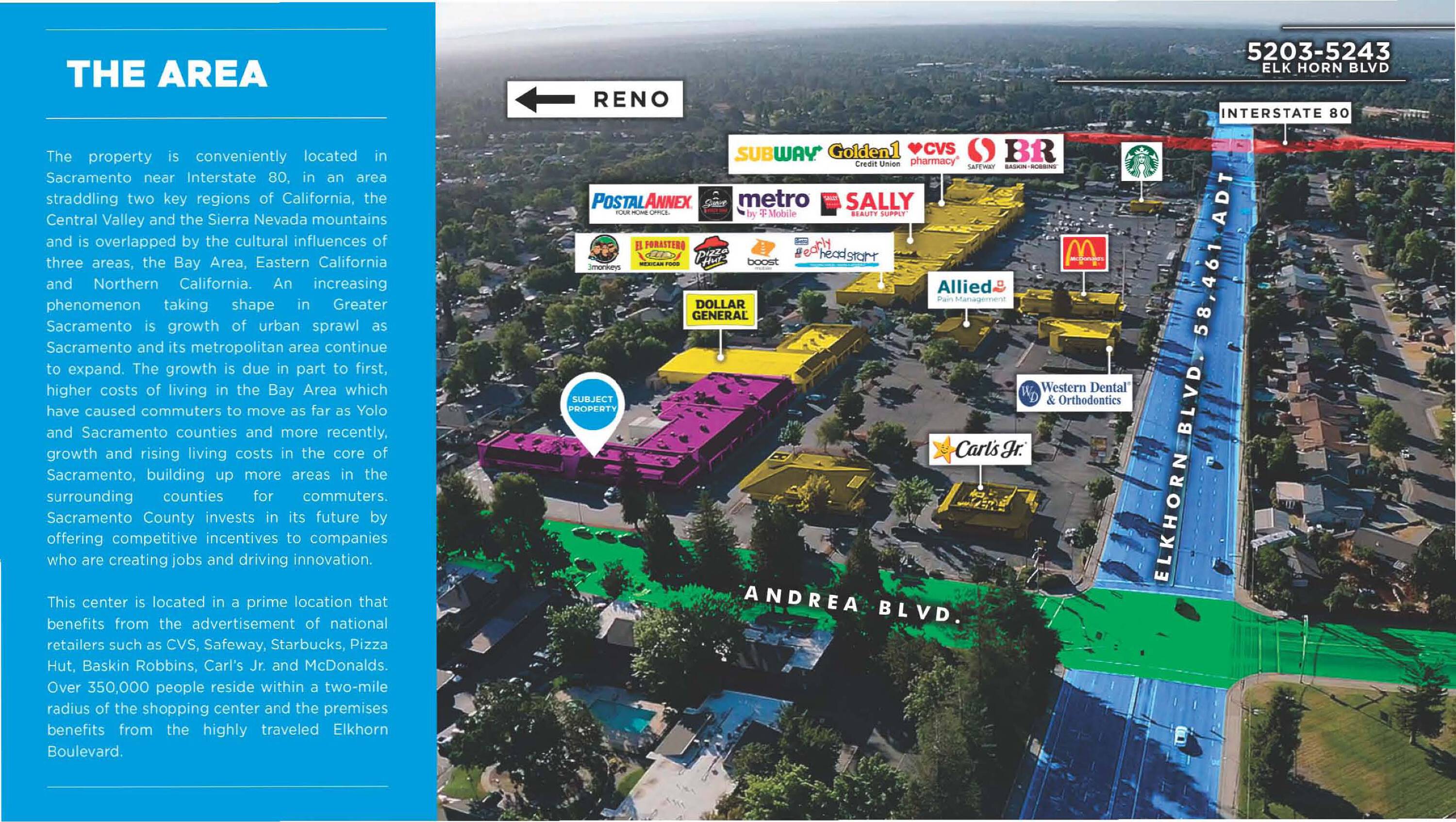 This property features: High traffic location: Over 58,000 average daily traffic count on Elkhorn Blvd.; Anchored Retail Center: Located in a retail center anchored by Carls Jr.; Excellent Accessibility: Ample ingress and egress points and spacious parking.