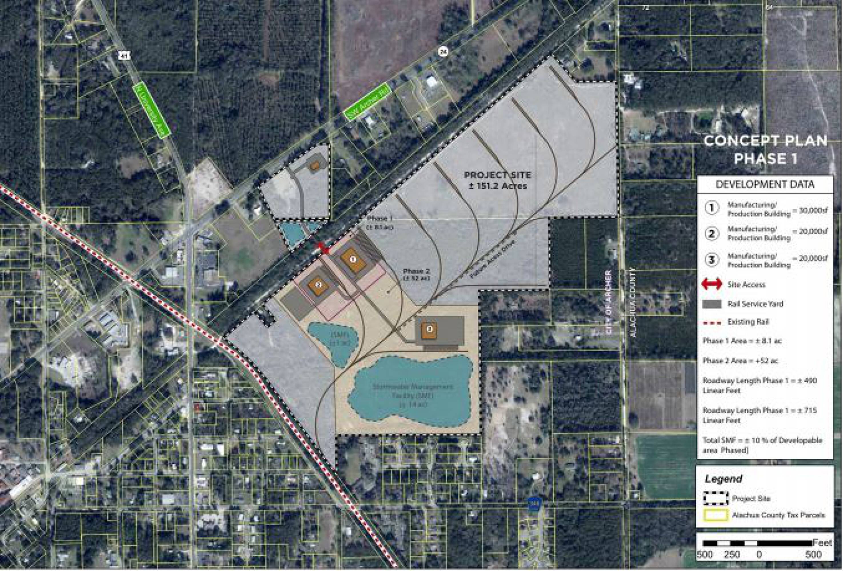 Two contiguous parcels, totaling 143.41 acres, are available in Archer, FL. Zoned for industrial use, the property has been certified "shovel ready". It is the only shovel ready site in Alachua County. The site is accessible by Class I rail service on the western boundary. Convenient highway connections to major highways and interstates provide easy access to airports and shipping ports. Florida Northern Railroad offers daily Class I rail and customized service on tracks located on the western boundary of the site, partnering with CSX to move raw materials and finished products. There is significant room for rail expansion including side tracks, spurs, and switches. The City of Archer and Alachua County support interested industrial use companies. Santa Fe College, offers educational, skilled, and vocational training from their campus in Archer. The University of Florida is located only 10 miles from Archer. Archer is located in the strategic northcentral portion of the State of Florida only 8 miles from I-75, and the City of Gainesville. Access to regional and multiple international airports and shipping terminals is easily available.