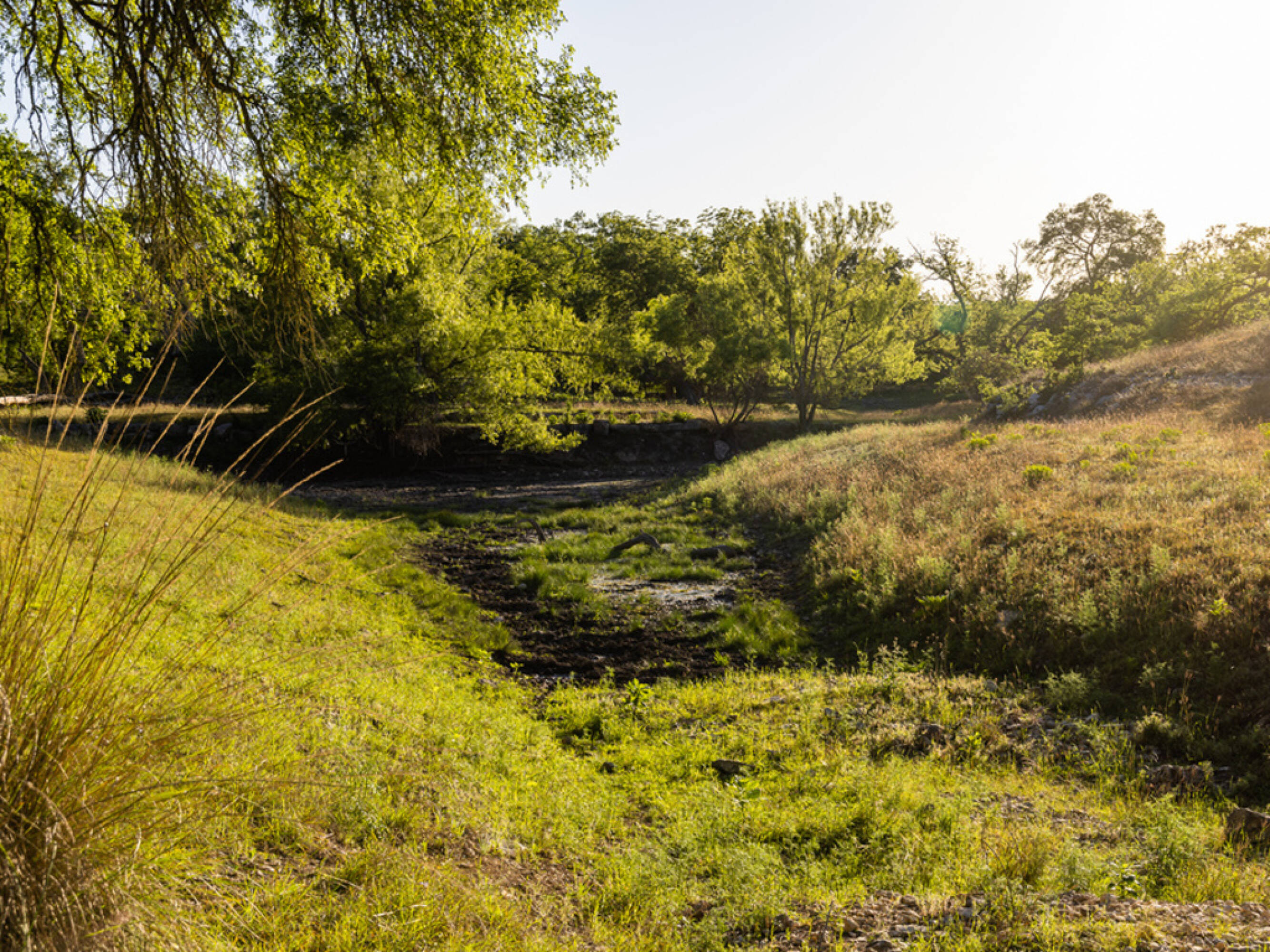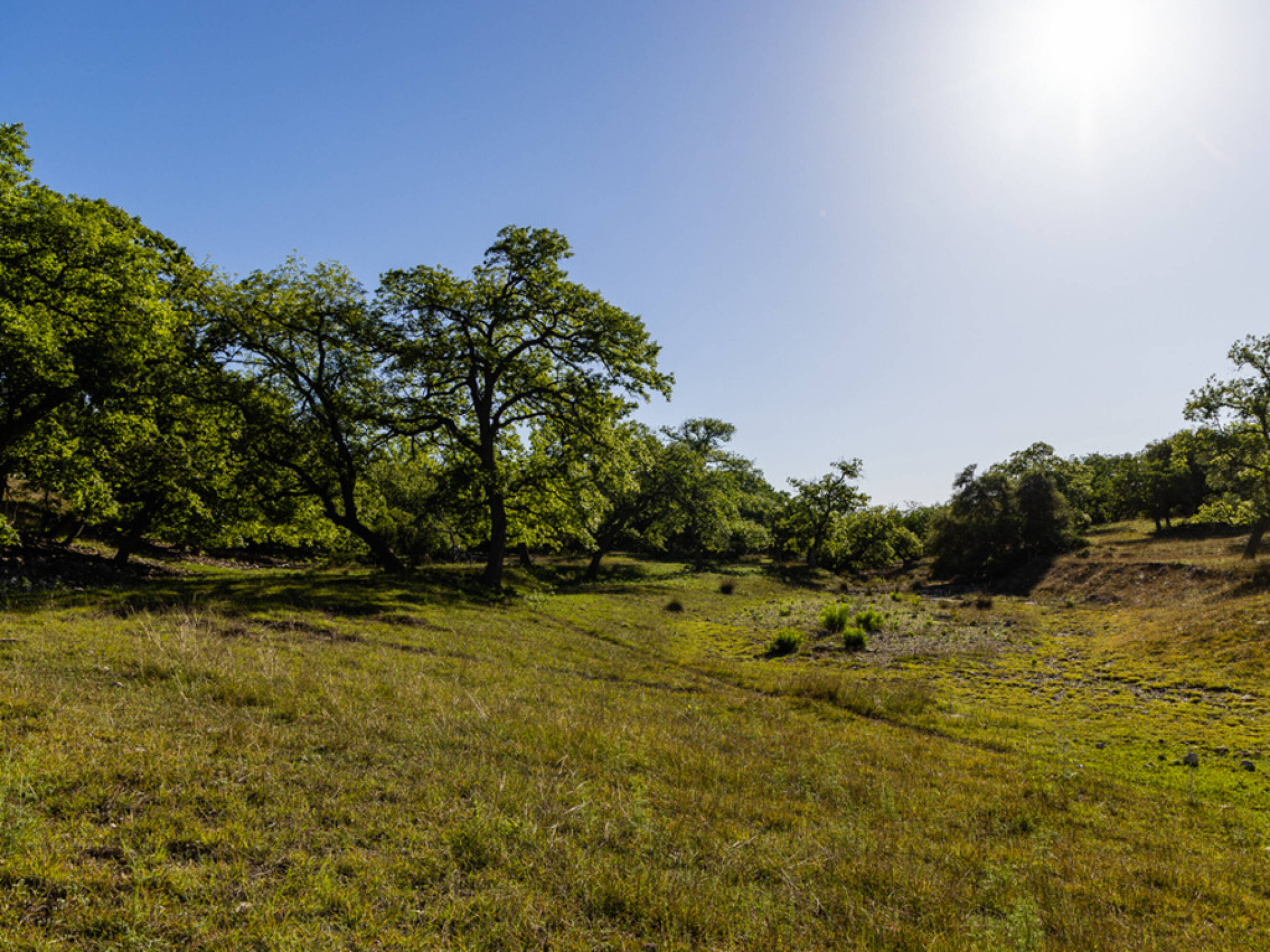 Ranch land with hardwood trees and long views.