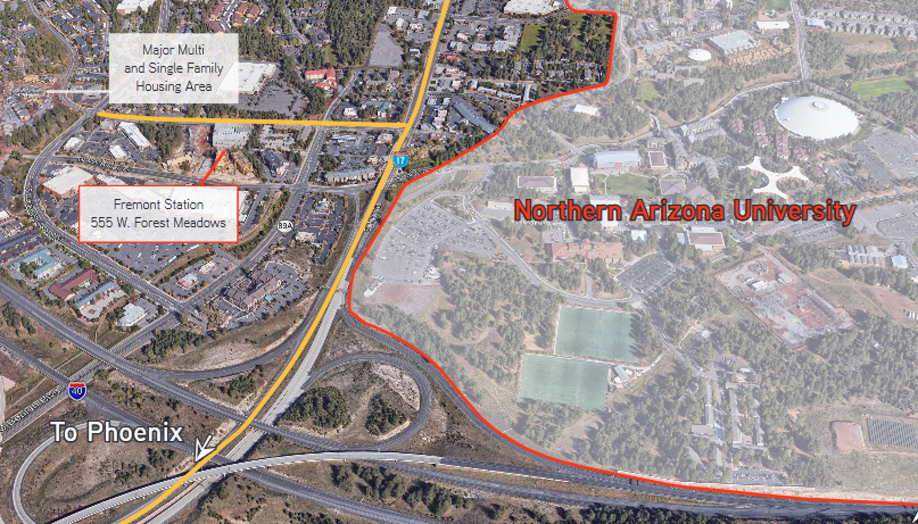 Fremont Station is a housing and retail project featuring luxury flats and townhouse apartments. Contemporary amenities include a 24-hour clubhouse, a fully equipped gym, a pool with two spas, stand-up tanning beds, an entertainment den, and study rooms. The project includes 12,829 square feet of high-end retail space available for lease. The complex is located two blocks from the Northern Arizona University campus. A tenant improvement allowance may be available from the landlord, subject to negotiation.