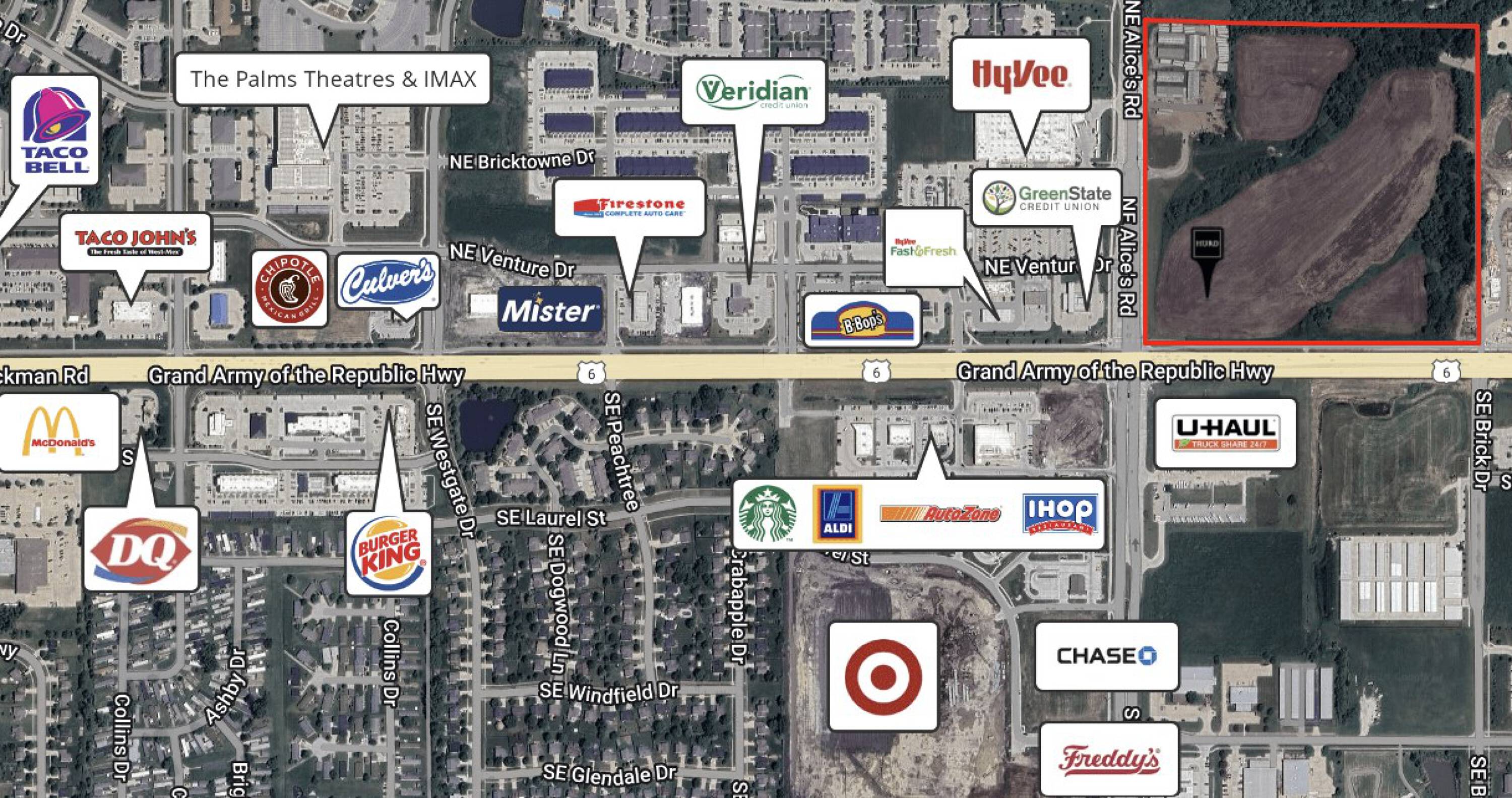 This property represents a new retail development opportunity by Hurd Realty, situated at the northeast corner of Hickman Road and Alice's Road in Waukee, Iowa. Development sites are available for ground lease or build-to-suit construction.