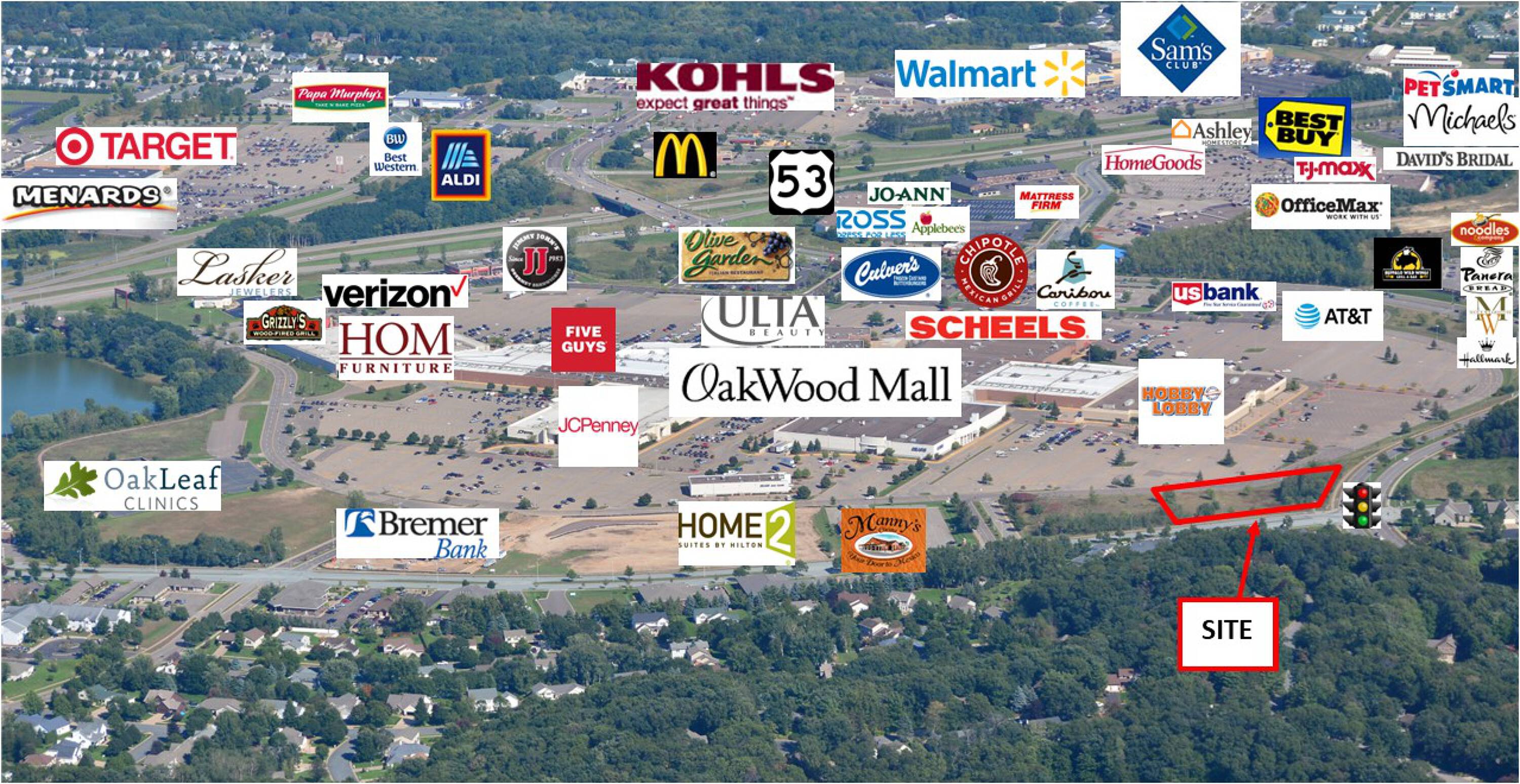 This premier commercial lot presents a build-to-suit or purchase opportunity. The property is located across from Oakwood Mall, a regional retail hub for Northwest Wisconsin. The lot offers great visibility and easy access, combined with high daytime populations.