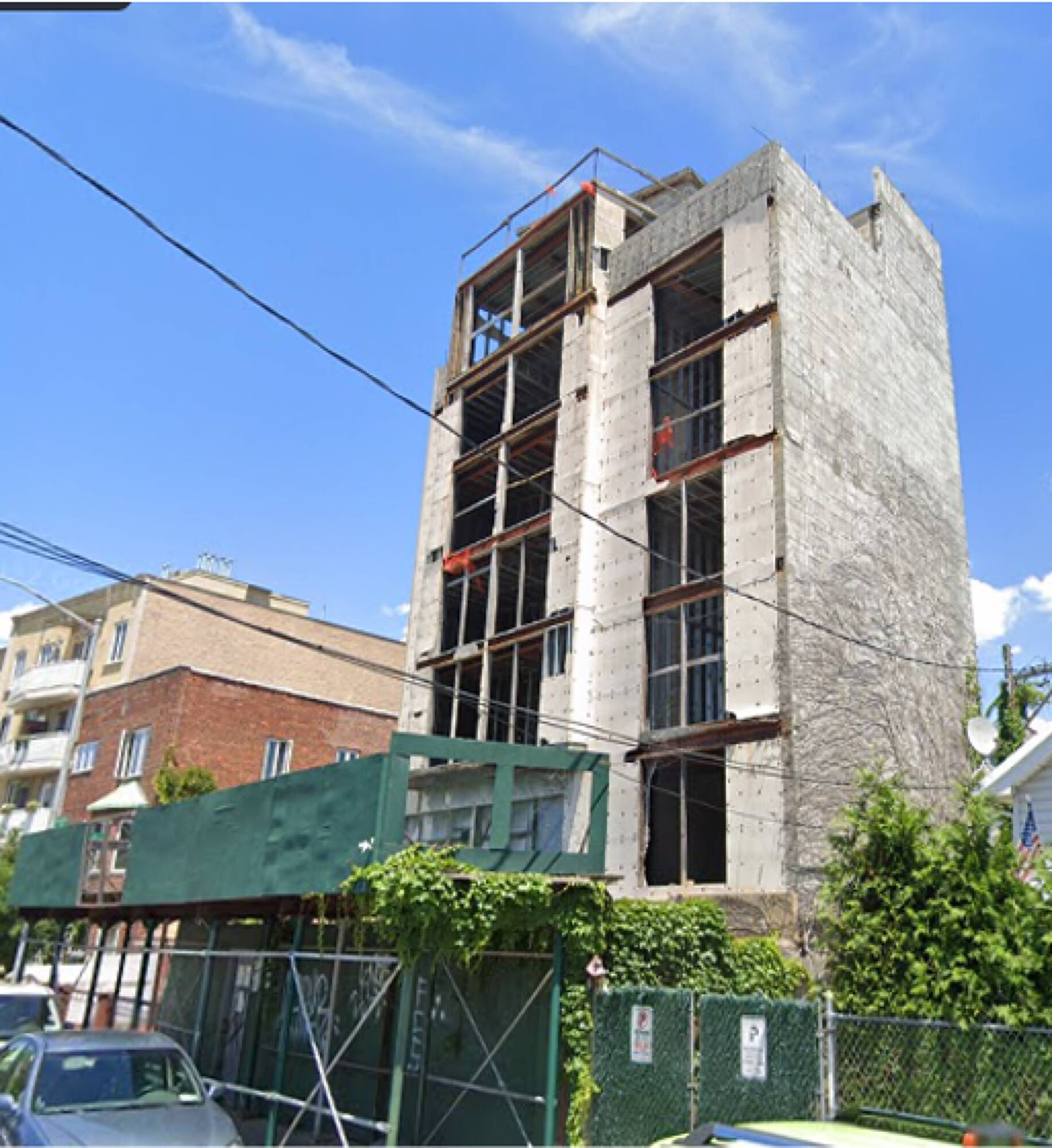 Partially completed elevator building with approved plans for six units.