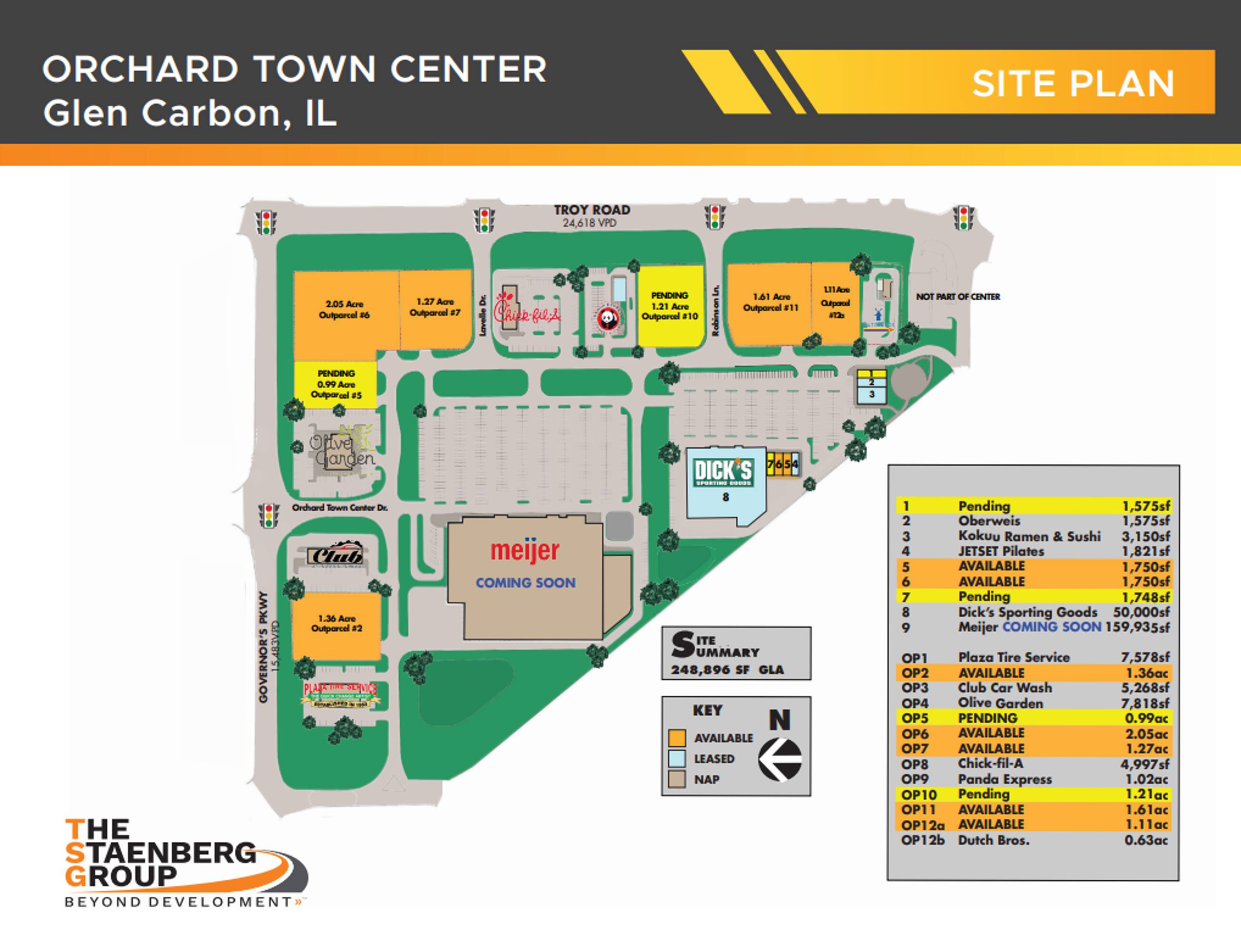 Orchard Town Center is a new development located in Edwardsville/Glen Carbon, Illinois. The center is anchored by a Meijer grocery store. There are 12 outparcels situated along Troy Road, which experiences a traffic volume of 23,500 vehicles per day, and Governors Parkway, with a traffic volume of 13,500 vehicles per day. Inline retail opportunities are available next to a 50,000 square foot Dick's Sporting Goods.
