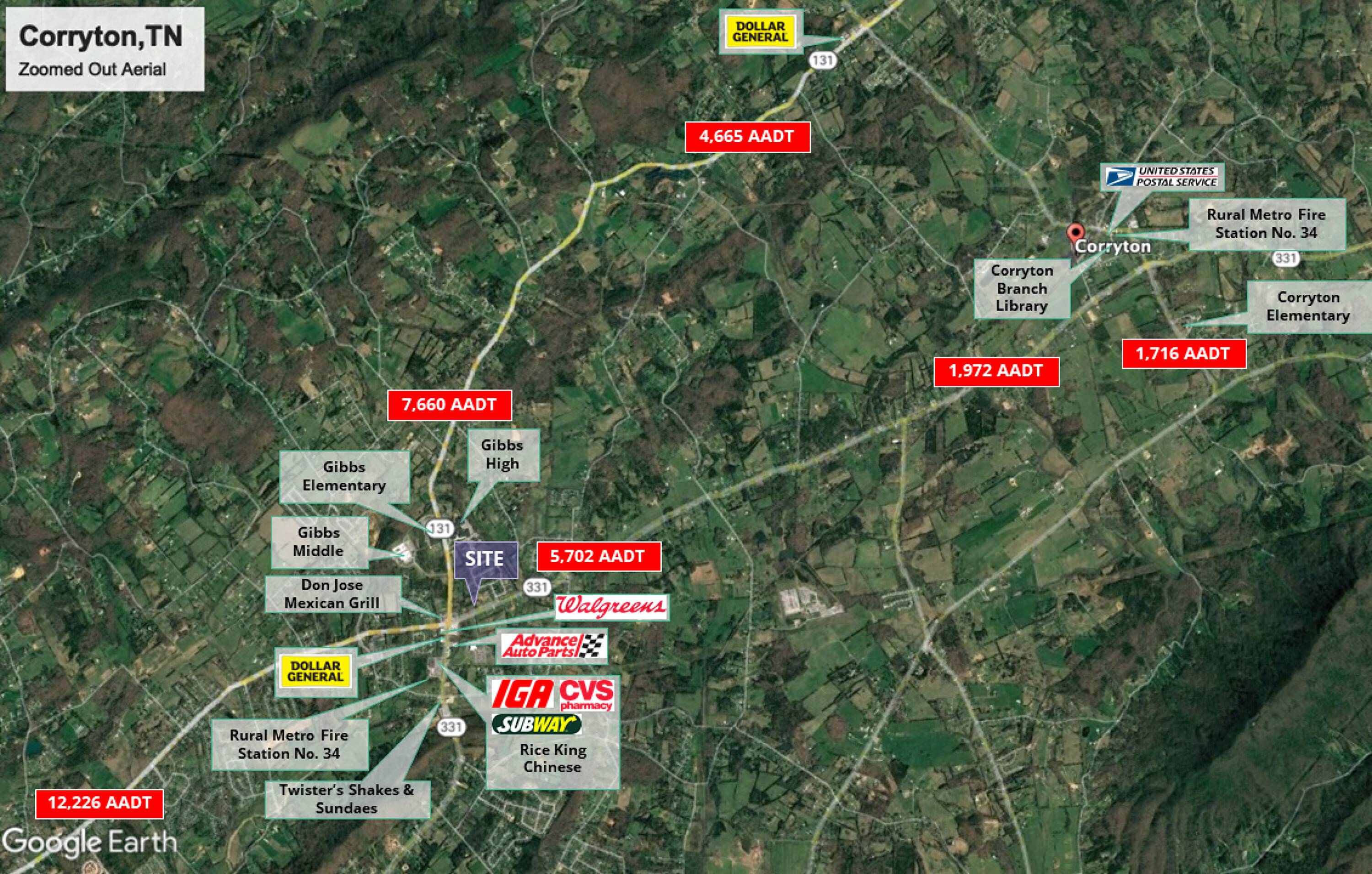 This 1.37-acre commercial land parcel is located at the corner of E Emory Rd. and Tazwell Pk. in Corryton, TN. The property is situated one block from the intersection of Emory Rd. and Tazwell Pike, approximately 10 miles northeast of I-75 on Emory Rd. It is positioned just south of Gibbs High School and Elementary, which has a combined student enrollment of 1,600. Retail neighbors include Walgreens, Dollar General, Advance Auto Parts, and IGA, offering a location with established commercial presence.