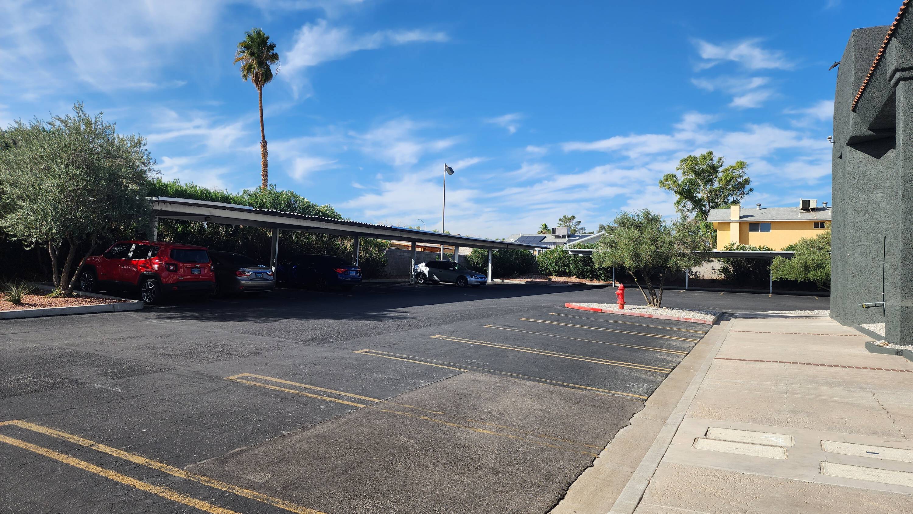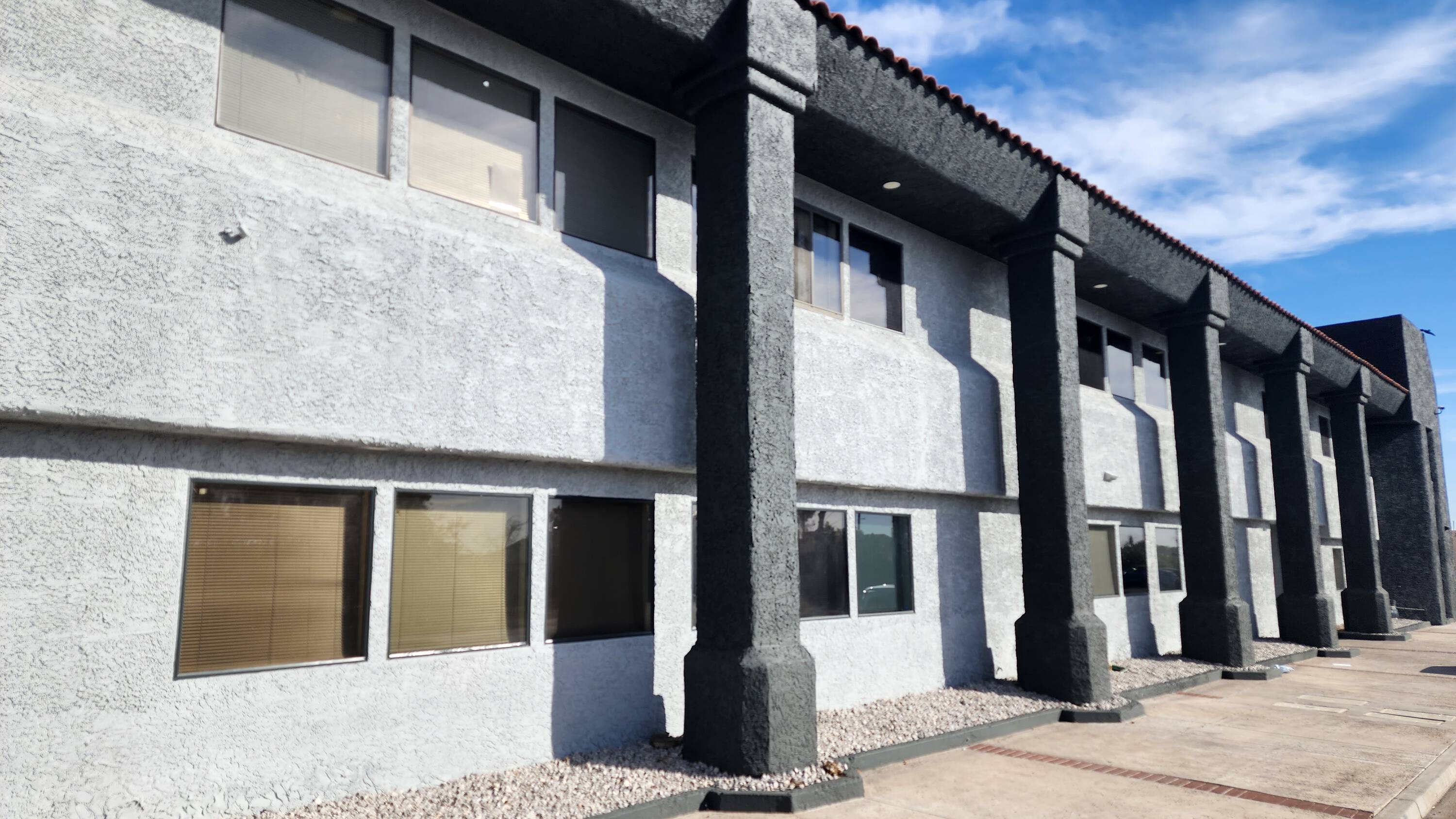 Two-story office complex with courtyard and ample parking.