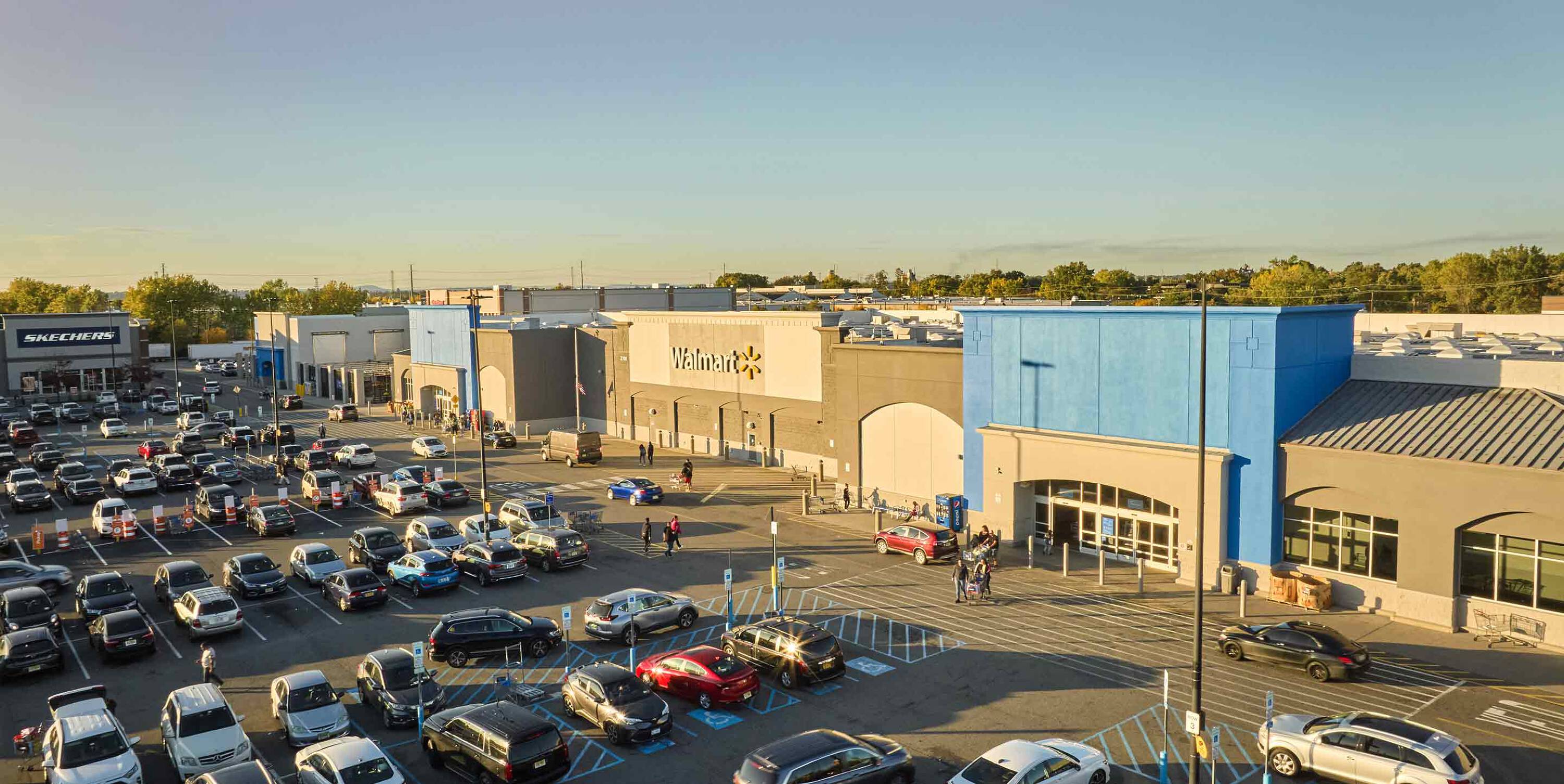 Open-air shopping center anchored by Walmart and BJ's Wholesale Club.