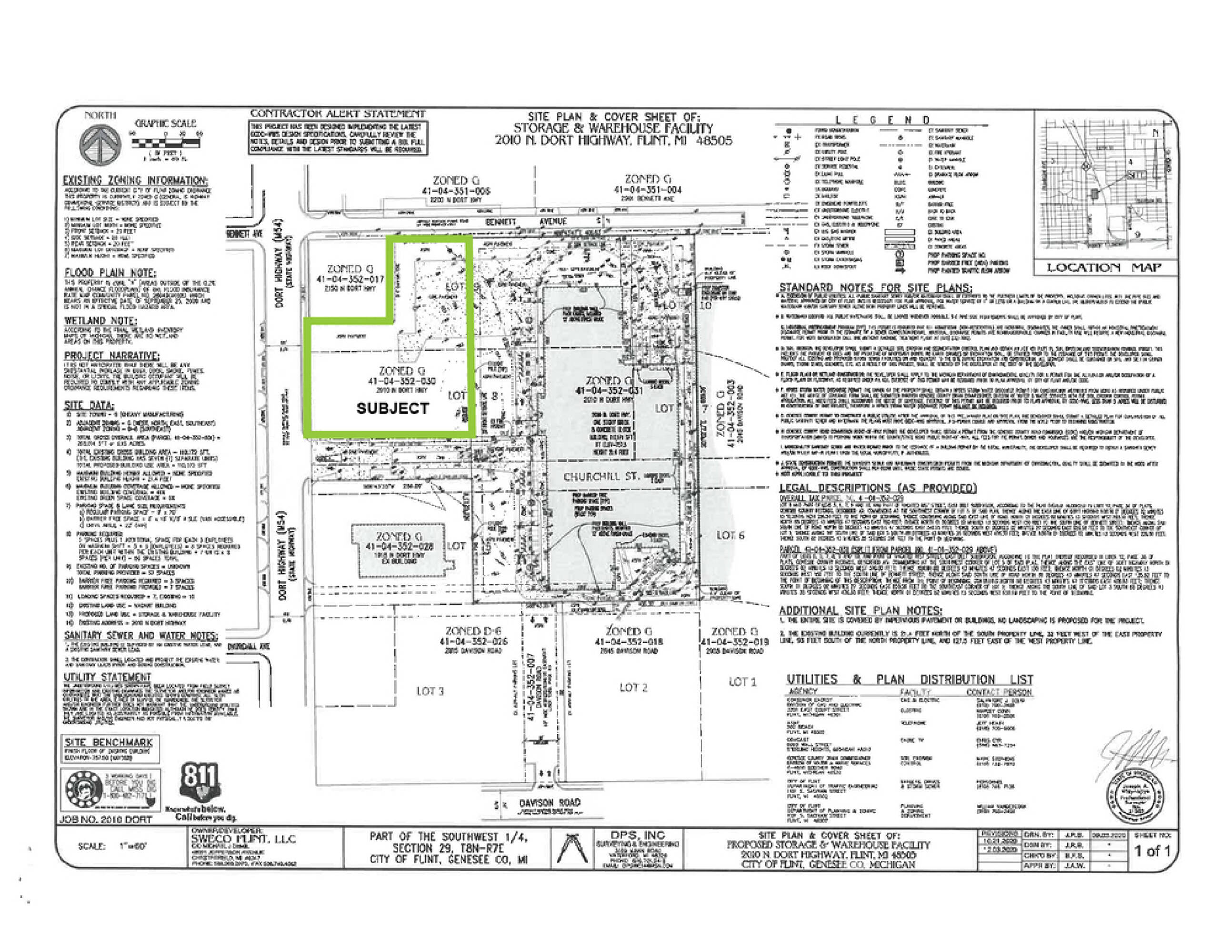 This property features 2.3 acres of land with a concrete and asphalt surface, suitable for parking uses. The site is zoned D-6, which is a high-density location that allows for commercial and industrial uses. It has 283 feet of frontage on Dort Highway and 132.62 feet on Bennett Avenue. City water and sewer services are available.