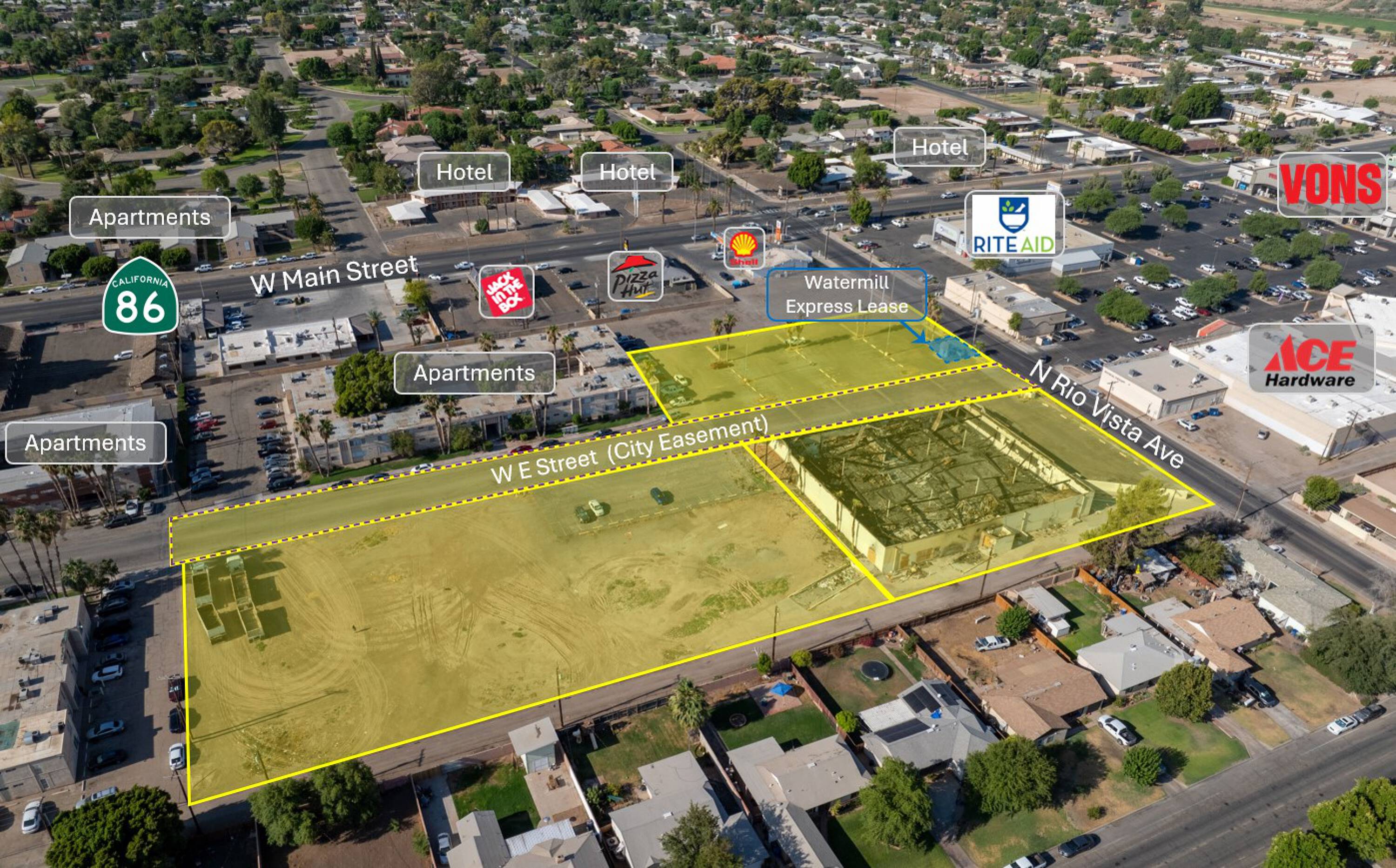 Four commercially zoned parcels with development potential in central Brawley.