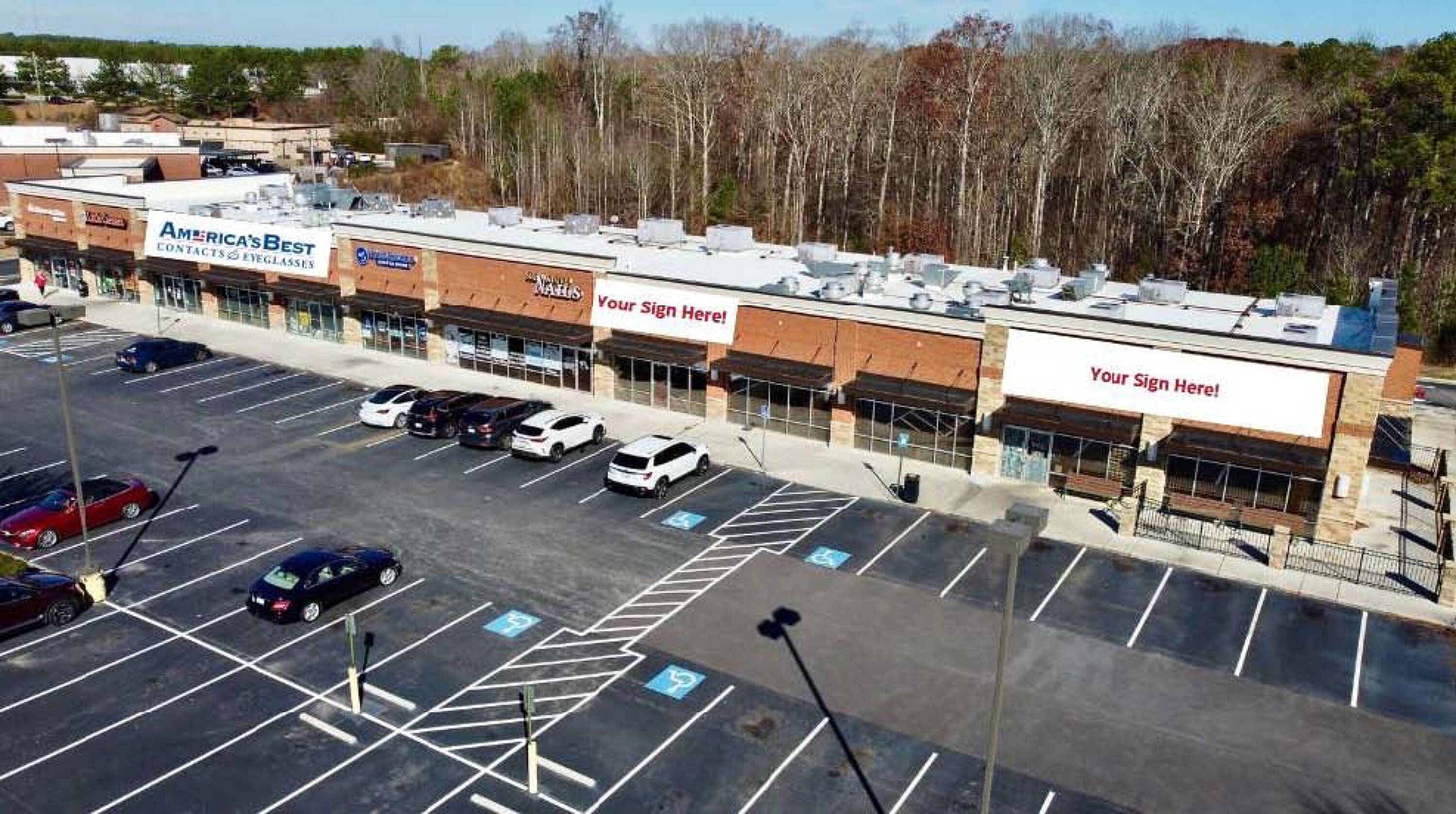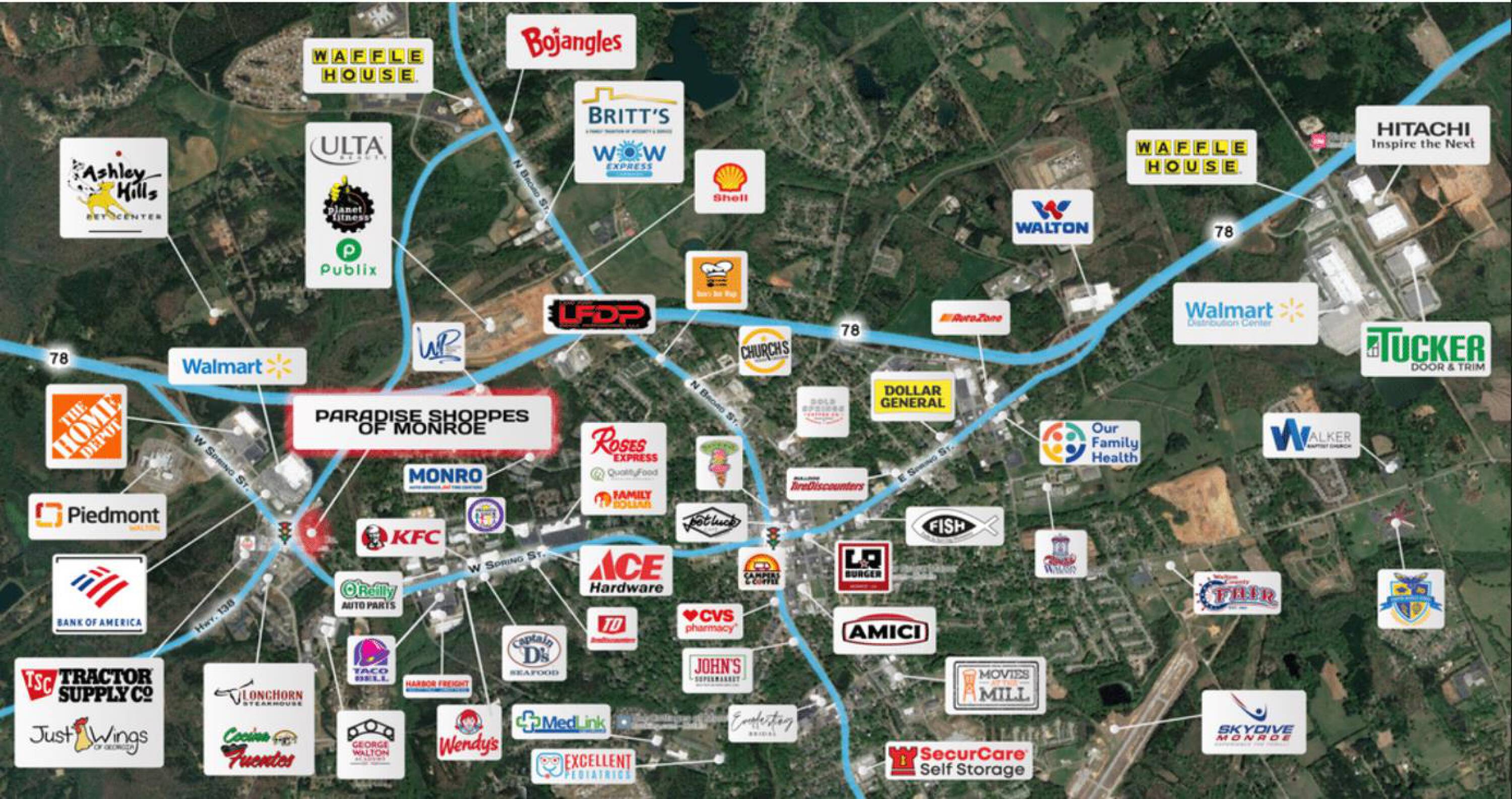 Retail and restaurant spaces for lease in Monroe, Georgia.