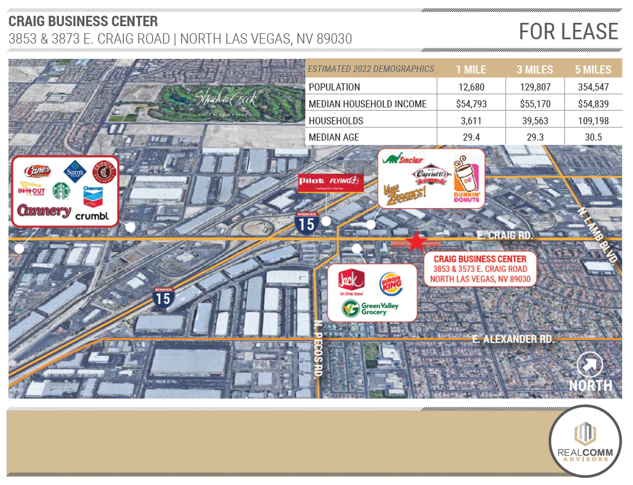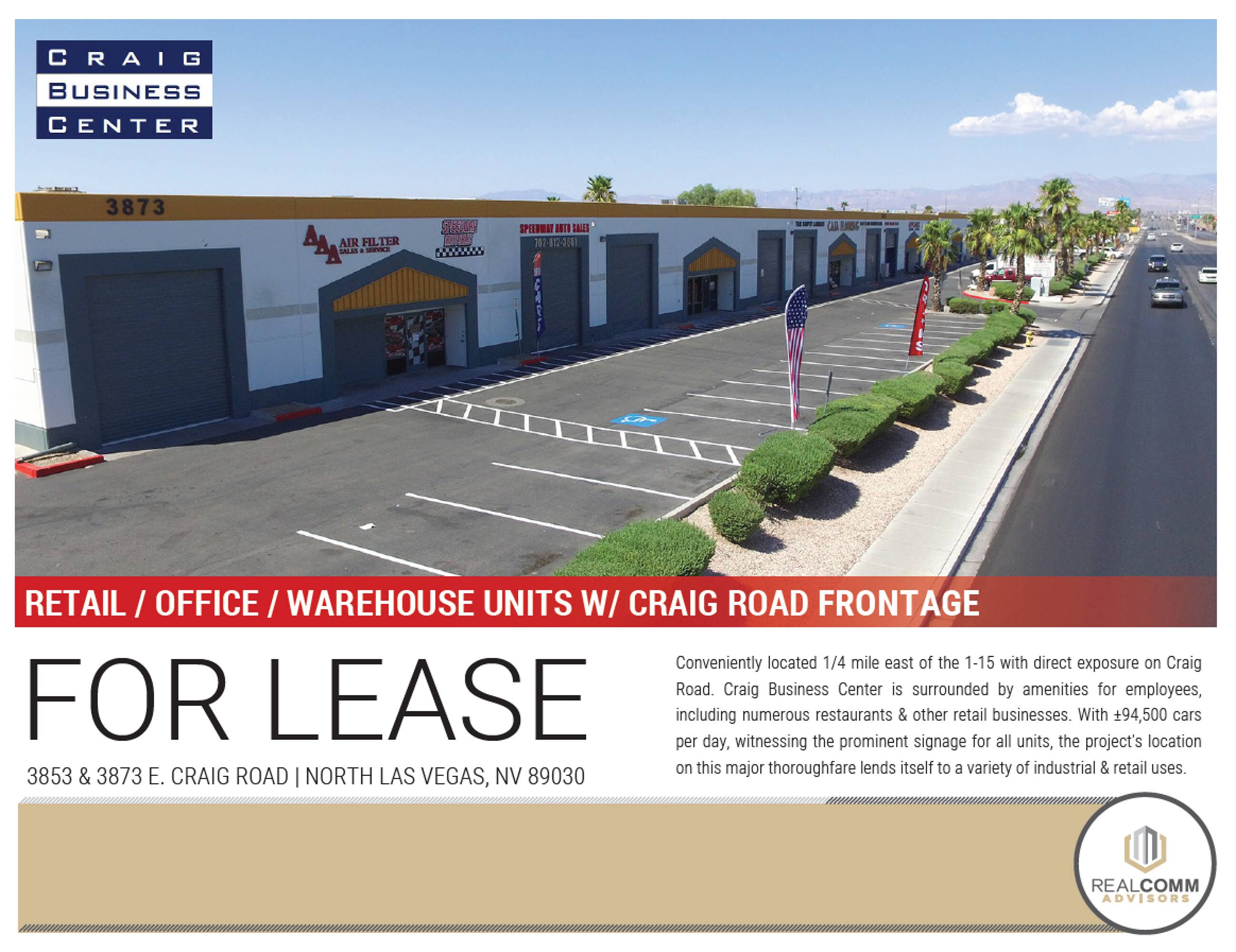 Retail and industrial spaces with high traffic exposure on Craig Road.