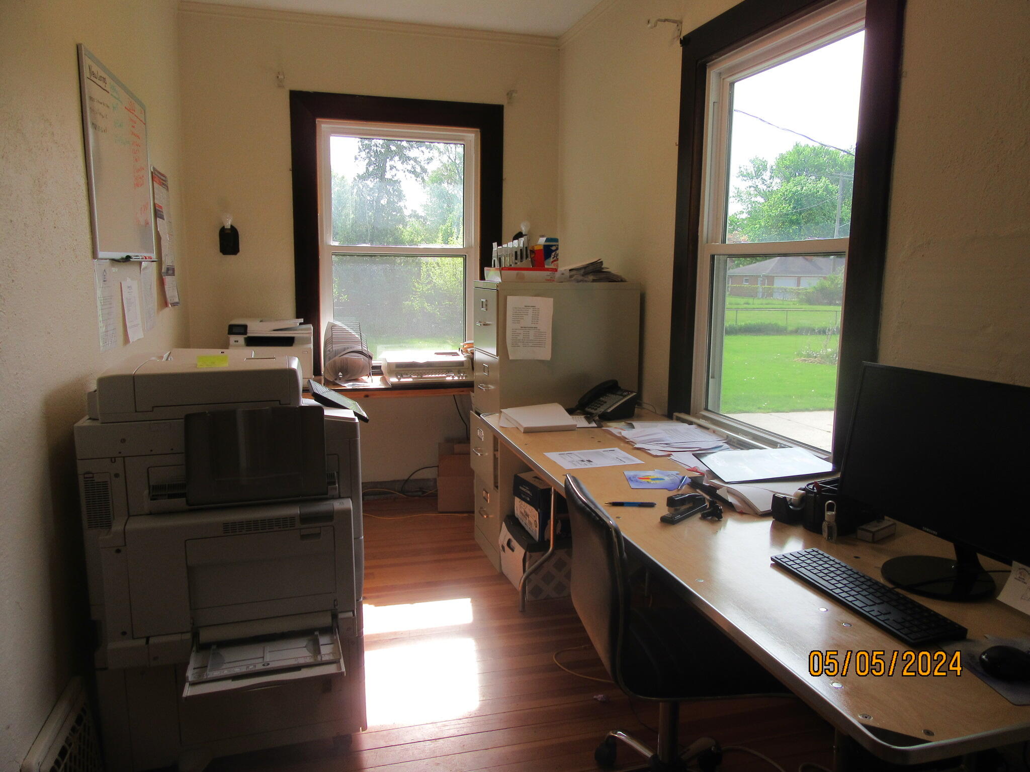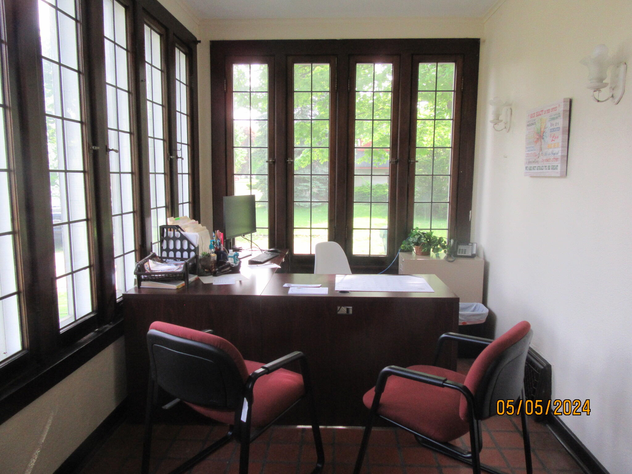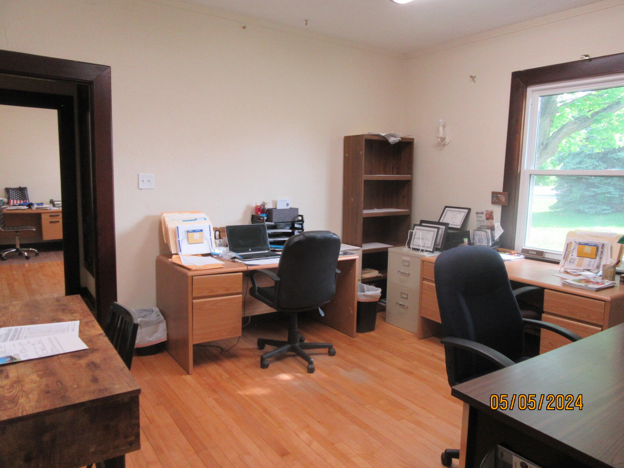 Office building with hardwood floors and a large carriage garage.