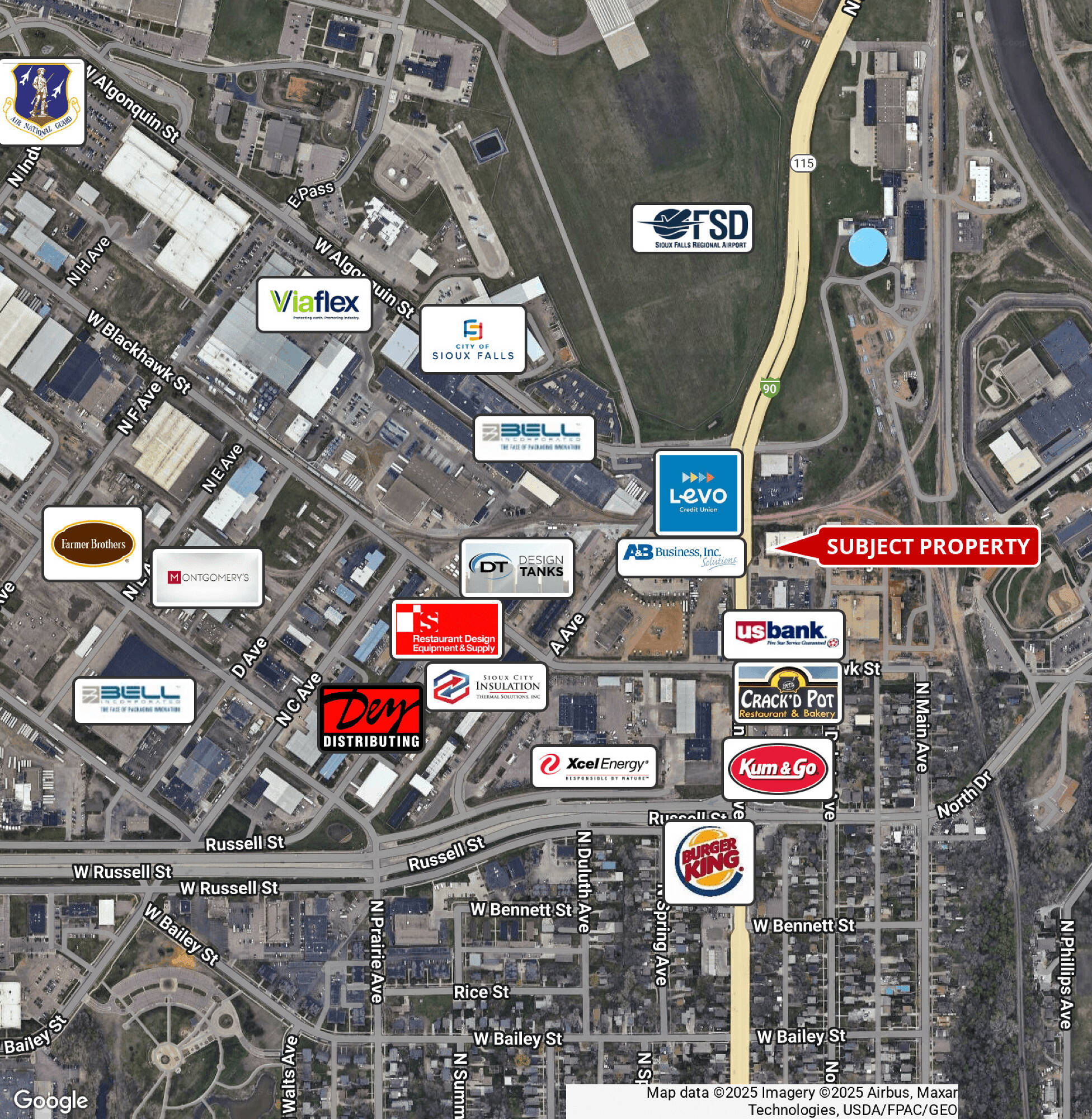 Located on North Minnesota Avenue, south of the Sioux Falls Airport, this commercial space is situated among neighbors such as A&B Business Solutions, Levo Federal Credit Union, US Bank, Kum & Go, Xcel Energy, Bell Incorporated, and the Sioux Falls Regional Airport. The traffic count on Minnesota Avenue is 11,800 vehicles per day.