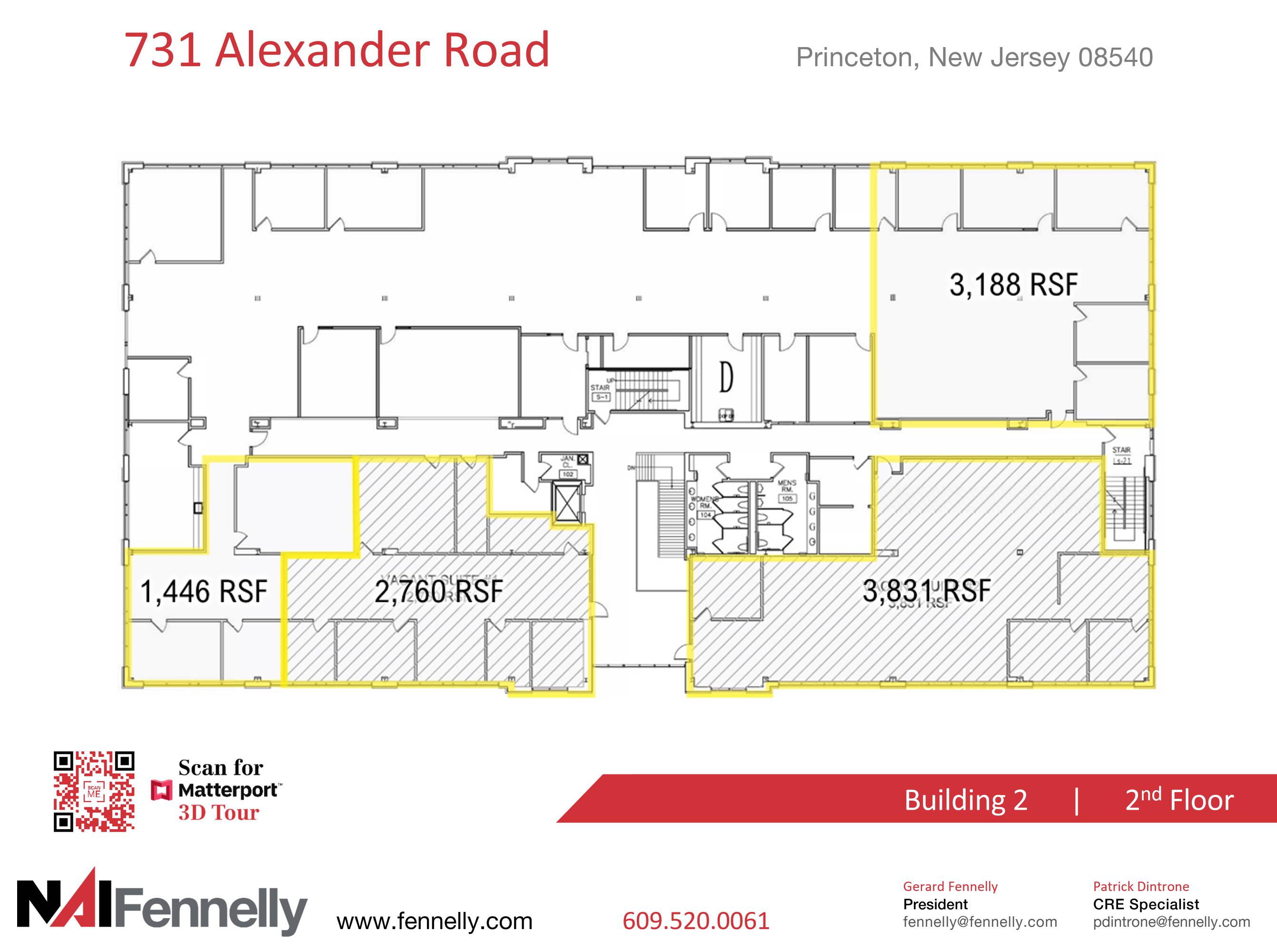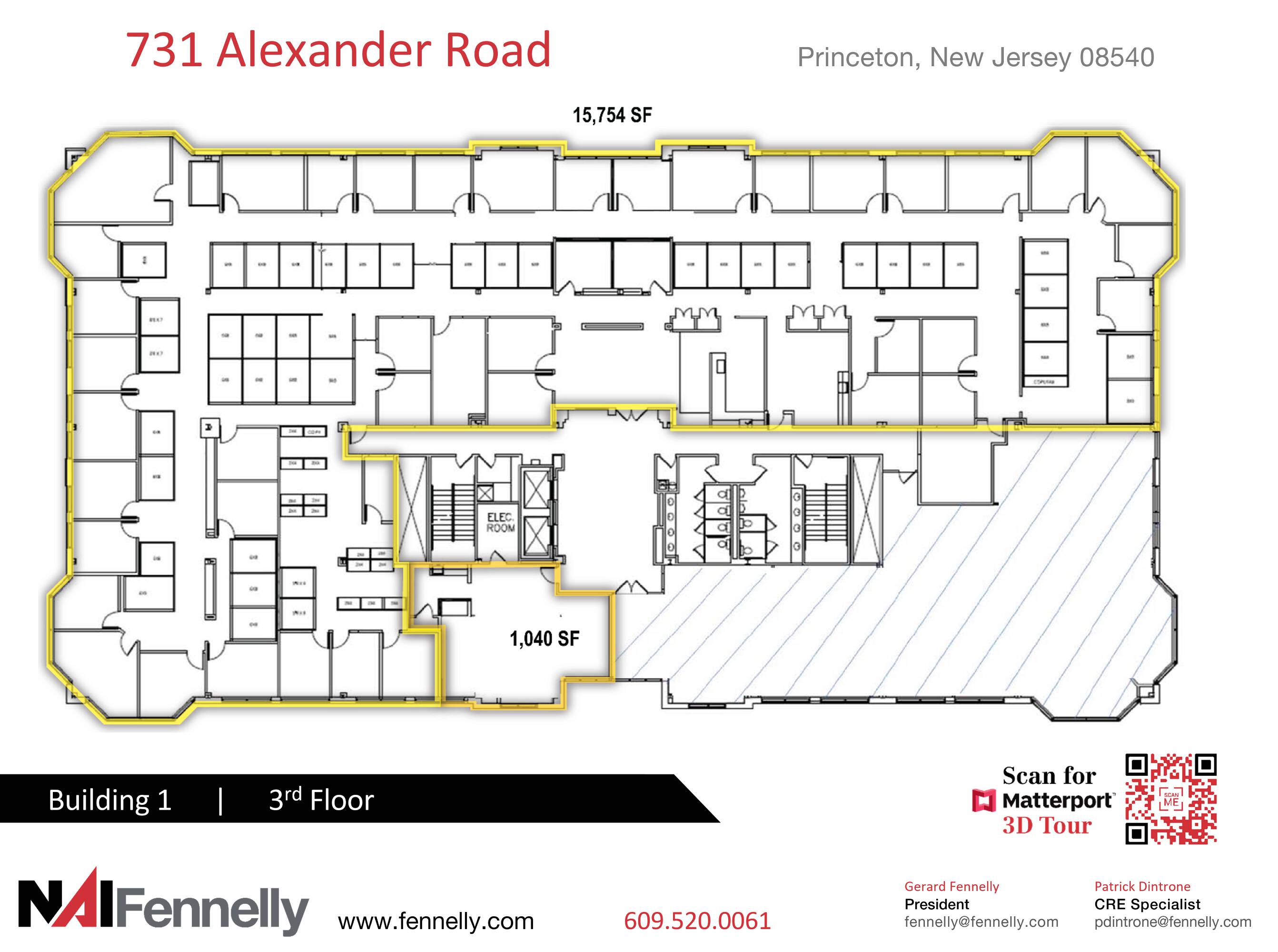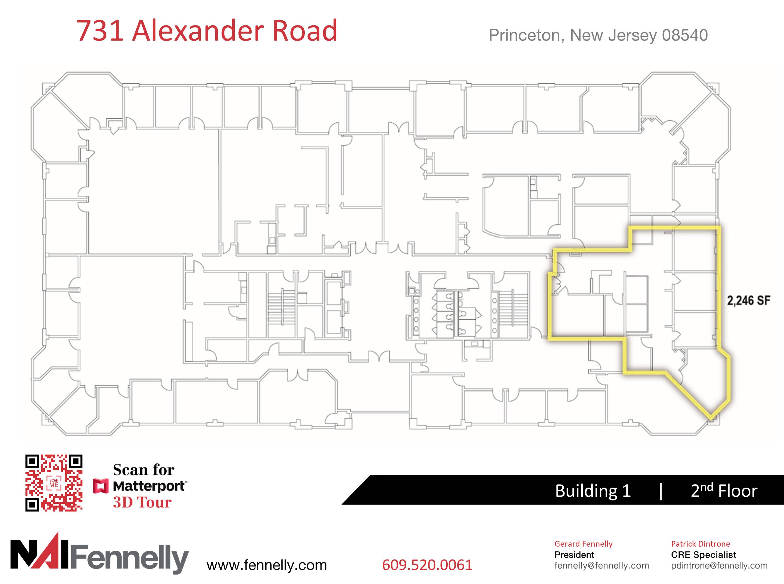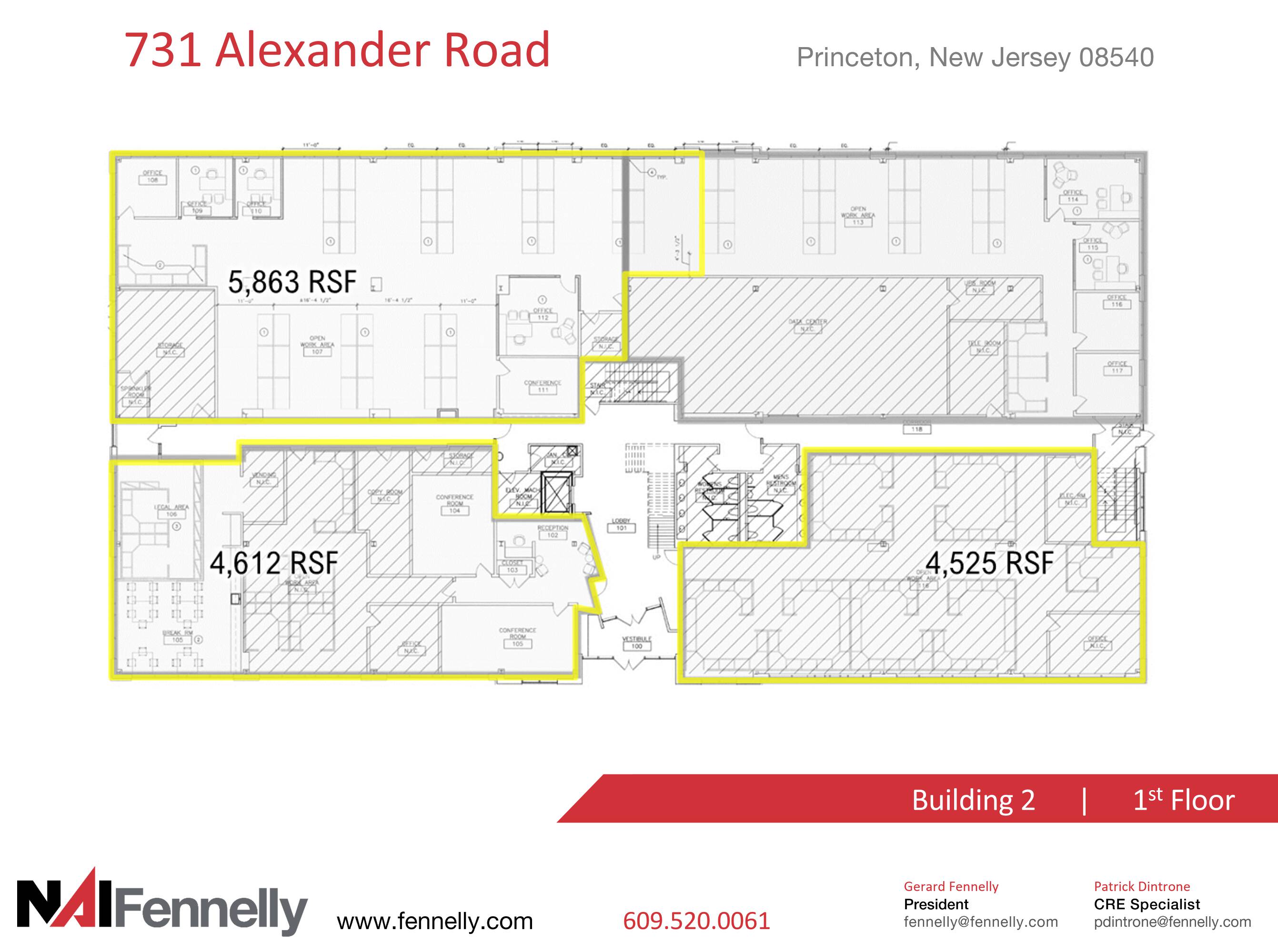 Available for lease are medical and office spaces within two buildings. Building 2 offers 34,010 square feet of space, while Building 1 has 15,754 square feet available. The property is located on Alexander Road in Princeton, New Jersey.