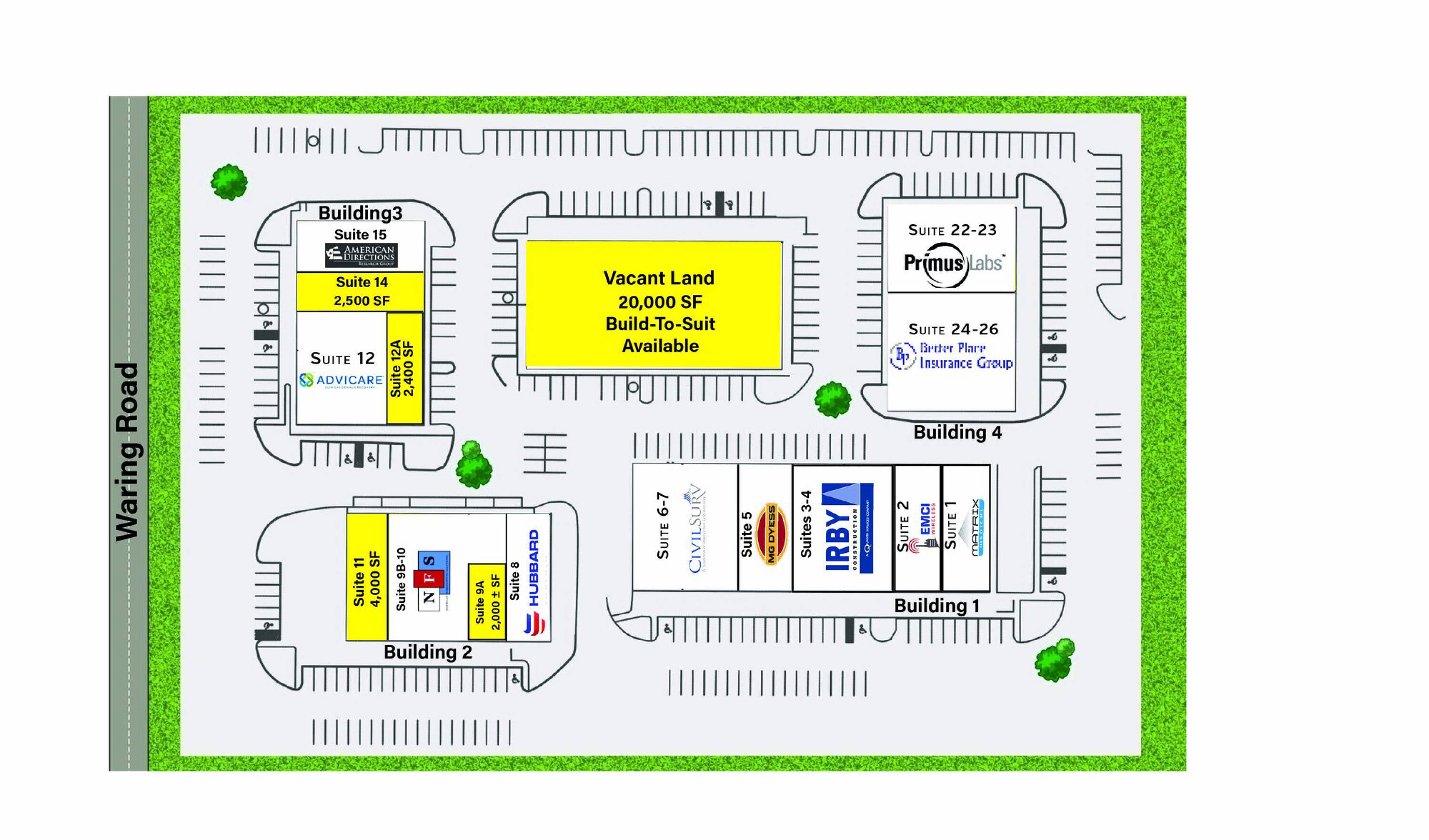 Commercial business park with spaces and land for lease.
