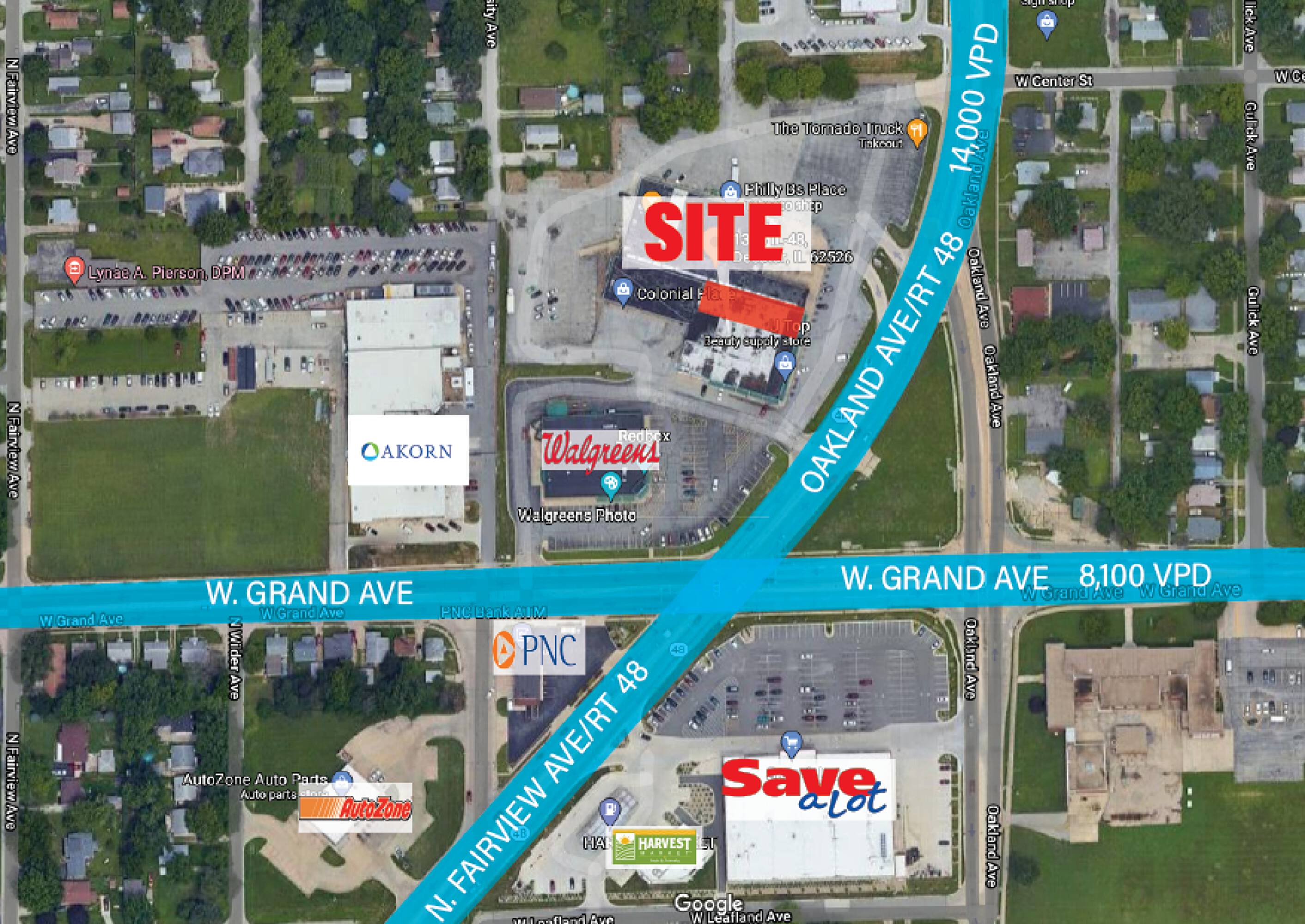 This property features: 7,200 SF available for lease.; Located on the corner of IL Rt. 48 (11,700 VPD) and W. Grand Ave (8,100 VPD).; Surrounded by retailers such as Walgreens, Save A Lot Grocery, and Autozone.