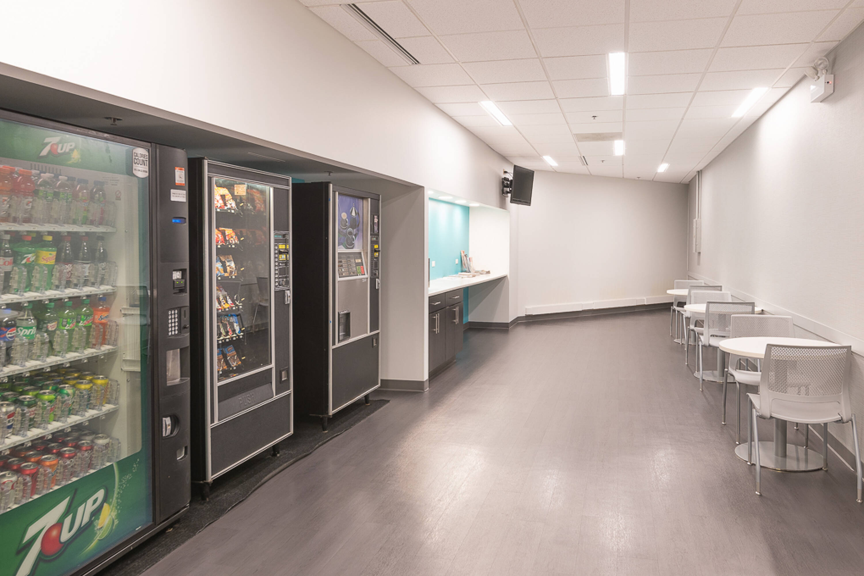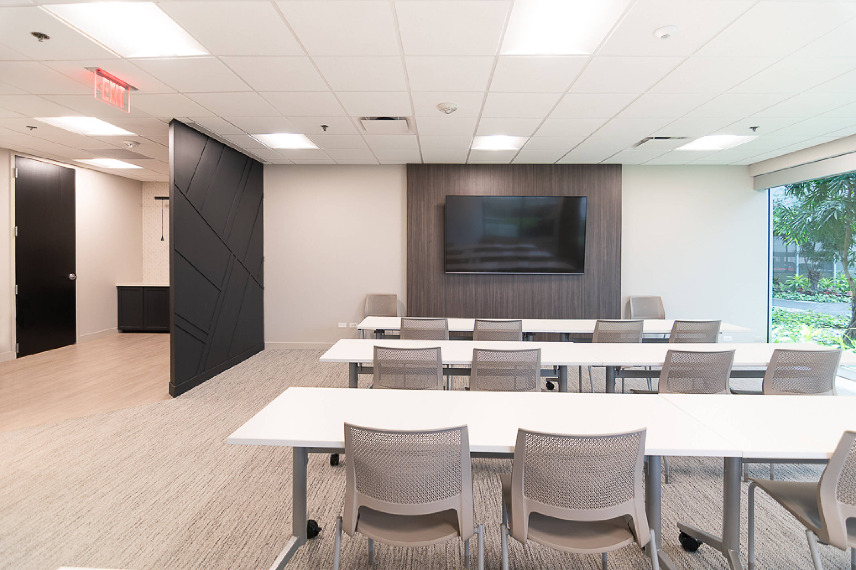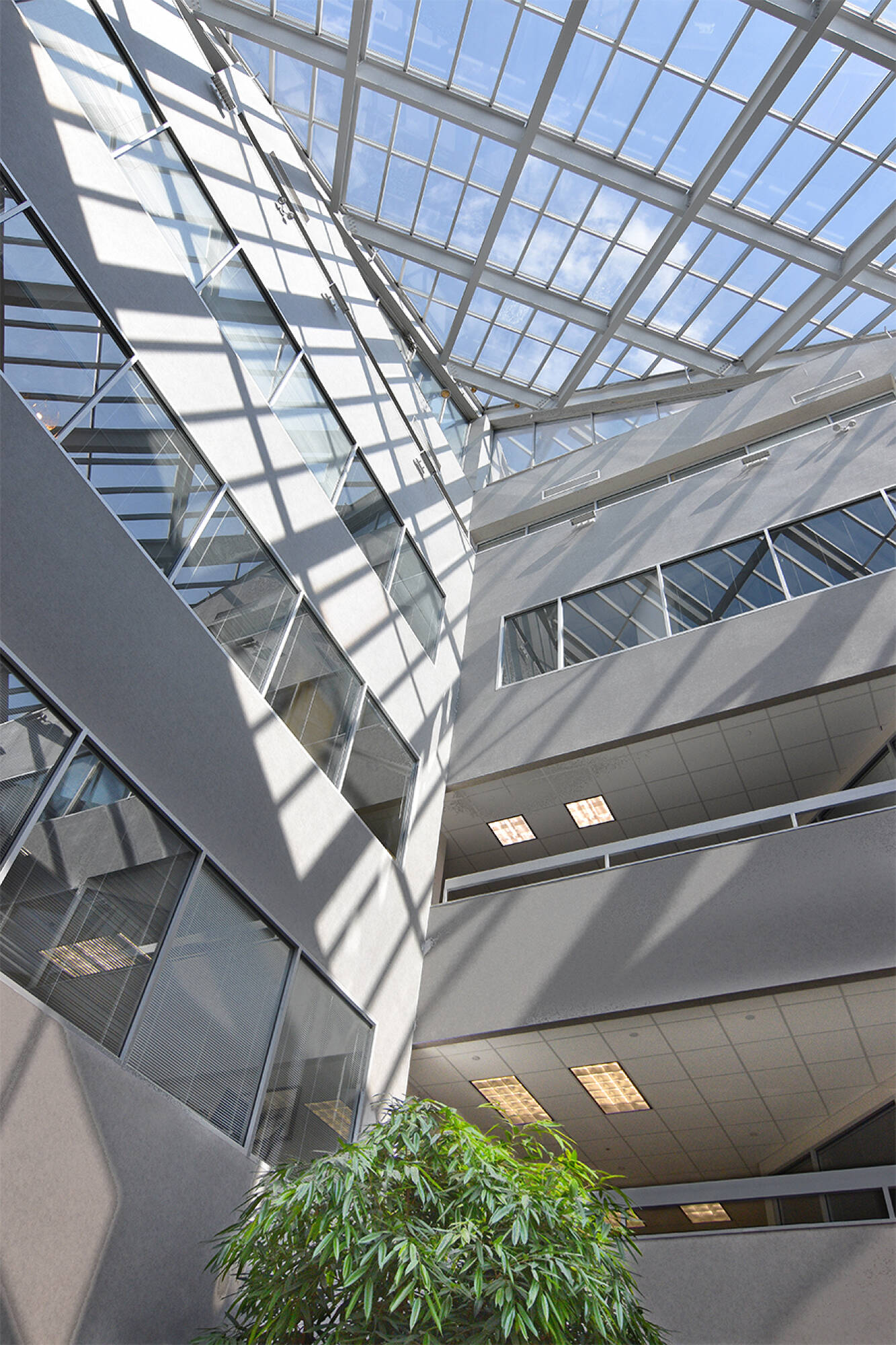 Office building with atrium, conference room, lounge, and parking.