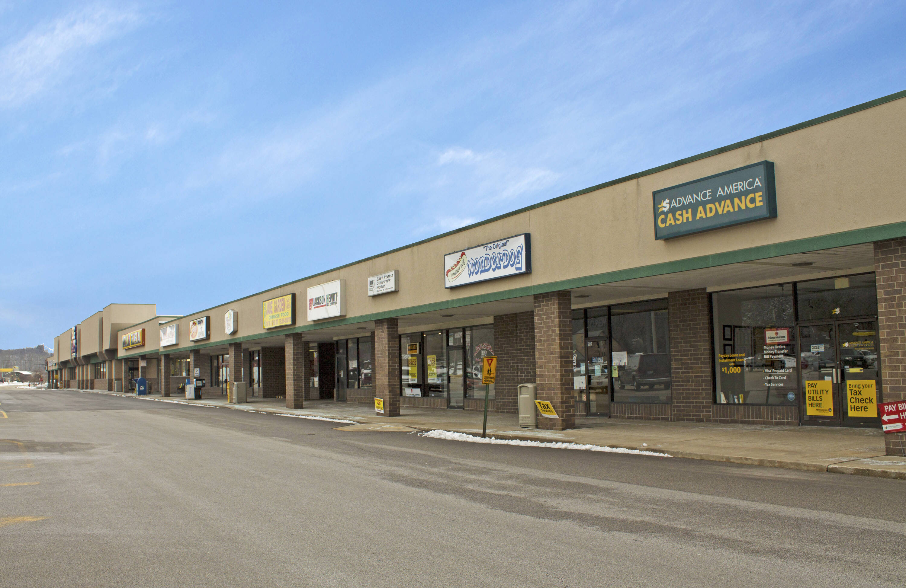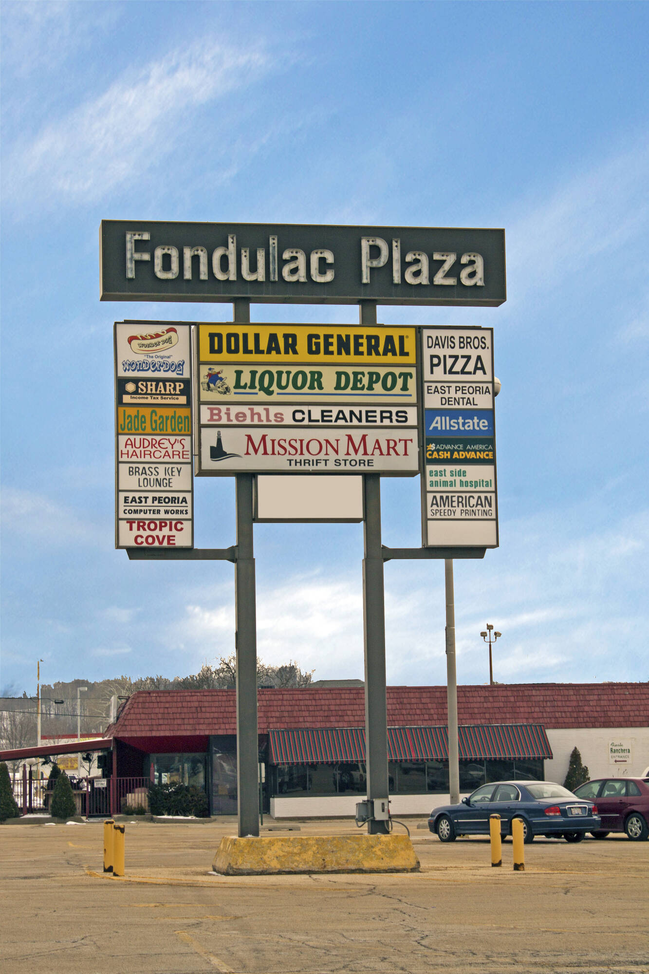 Retail spaces for lease at Fondulac Plaza in East Peoria.