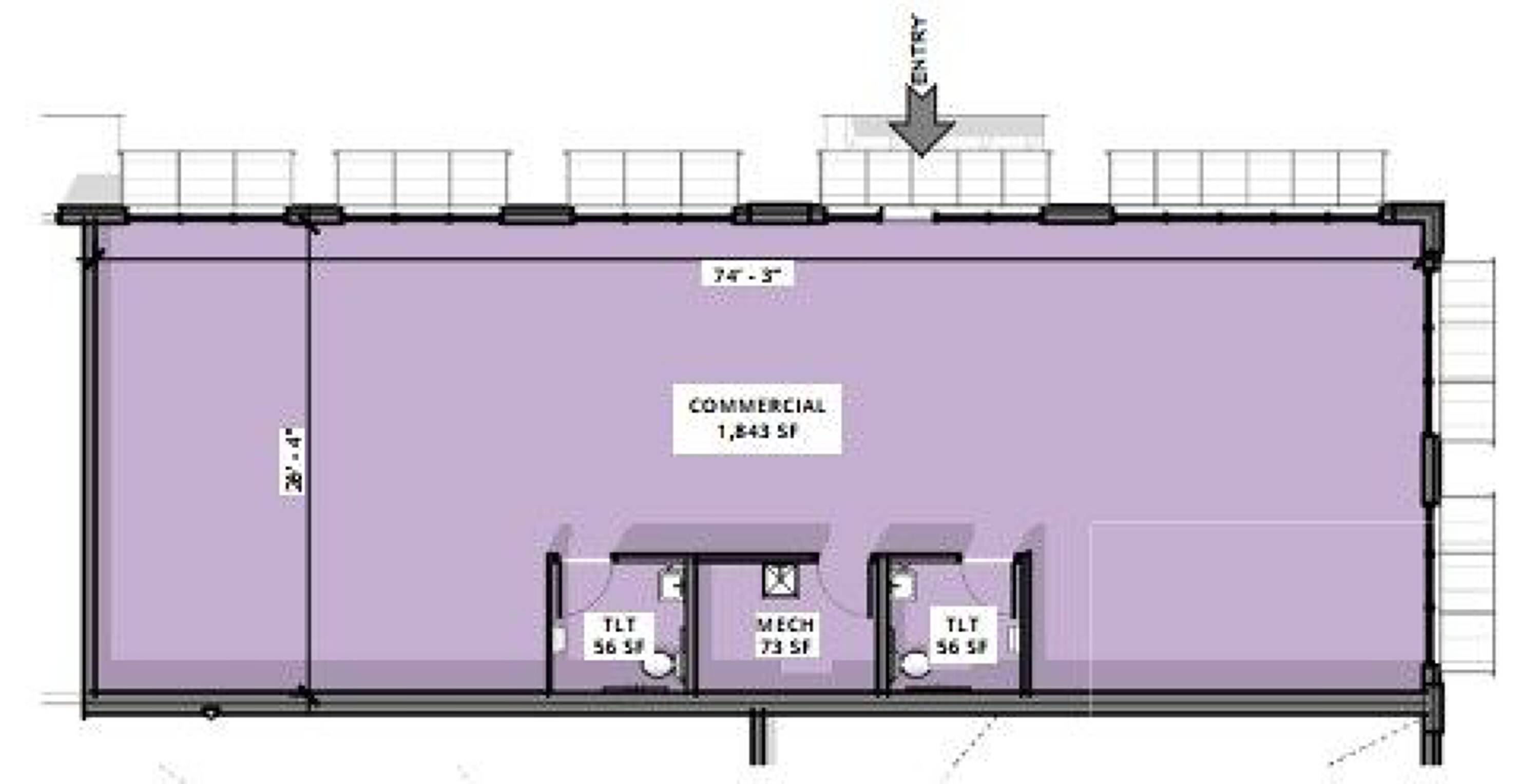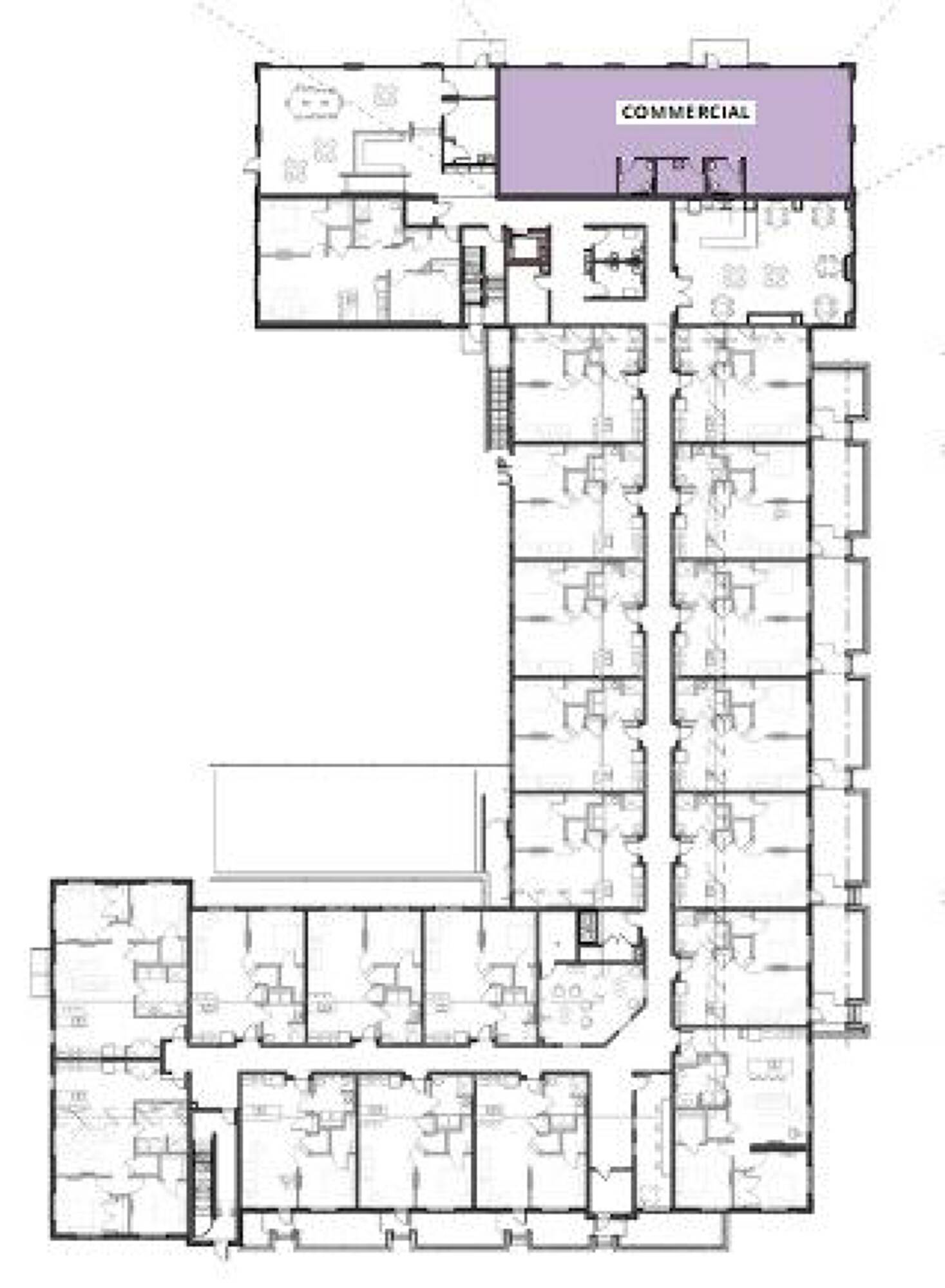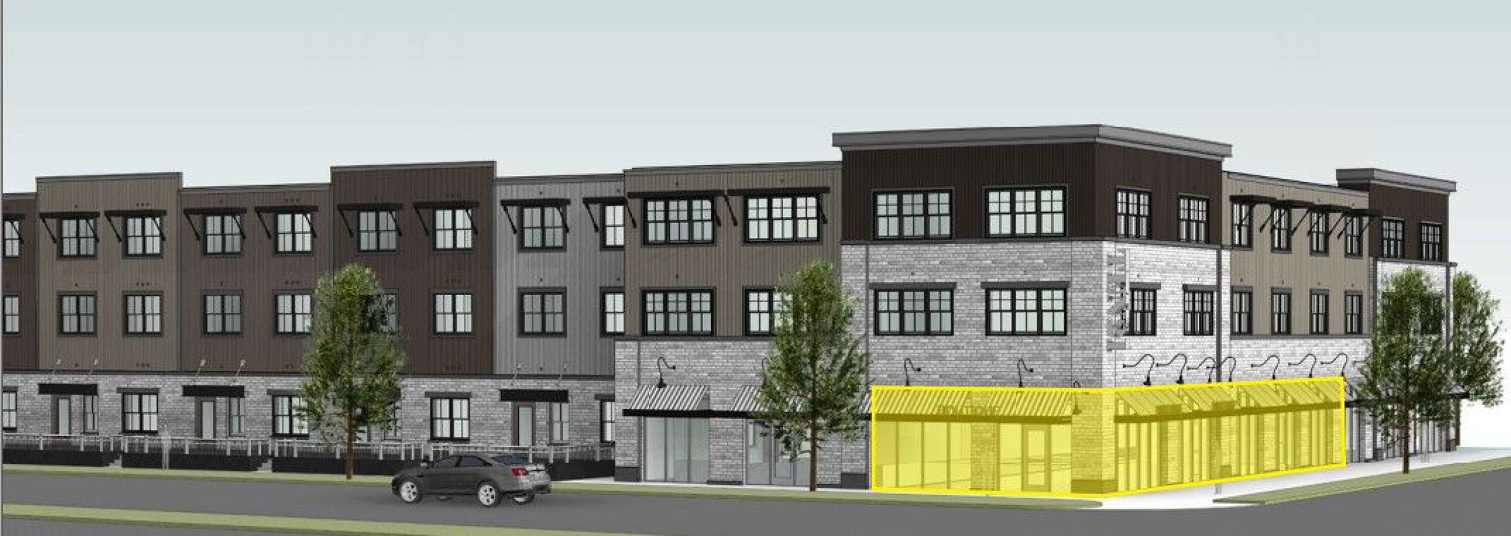 New construction commercial space in a mixed-use downtown building.