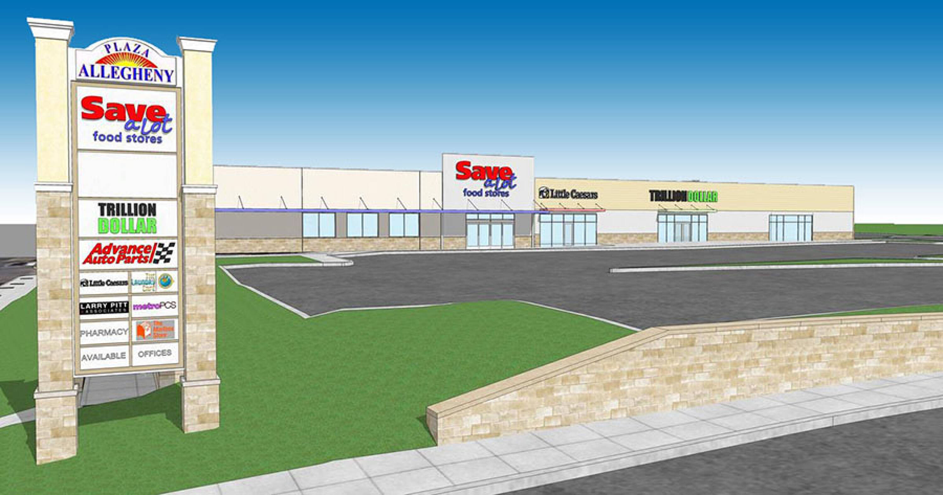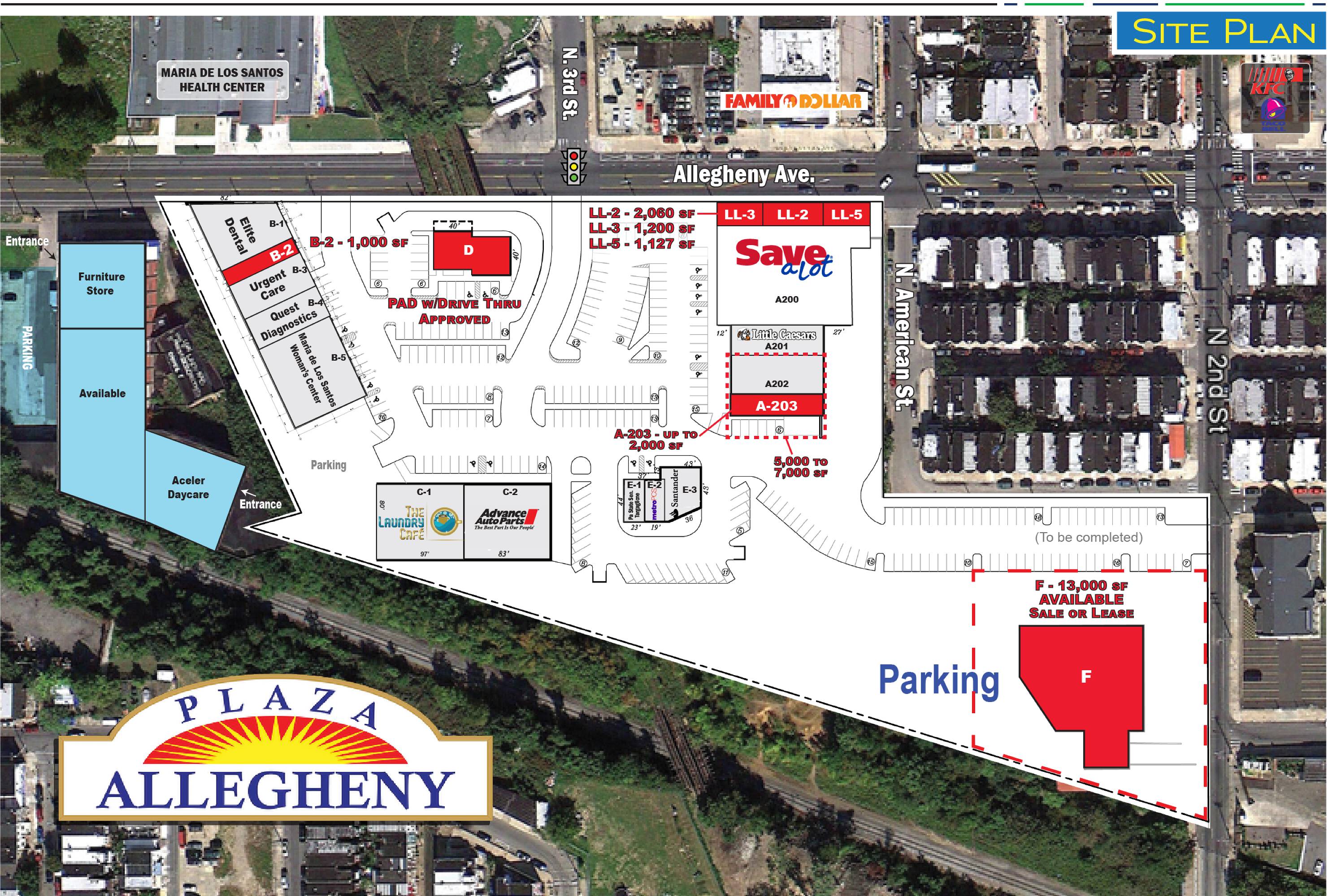 Retail spaces available for lease with drive-thru potential.