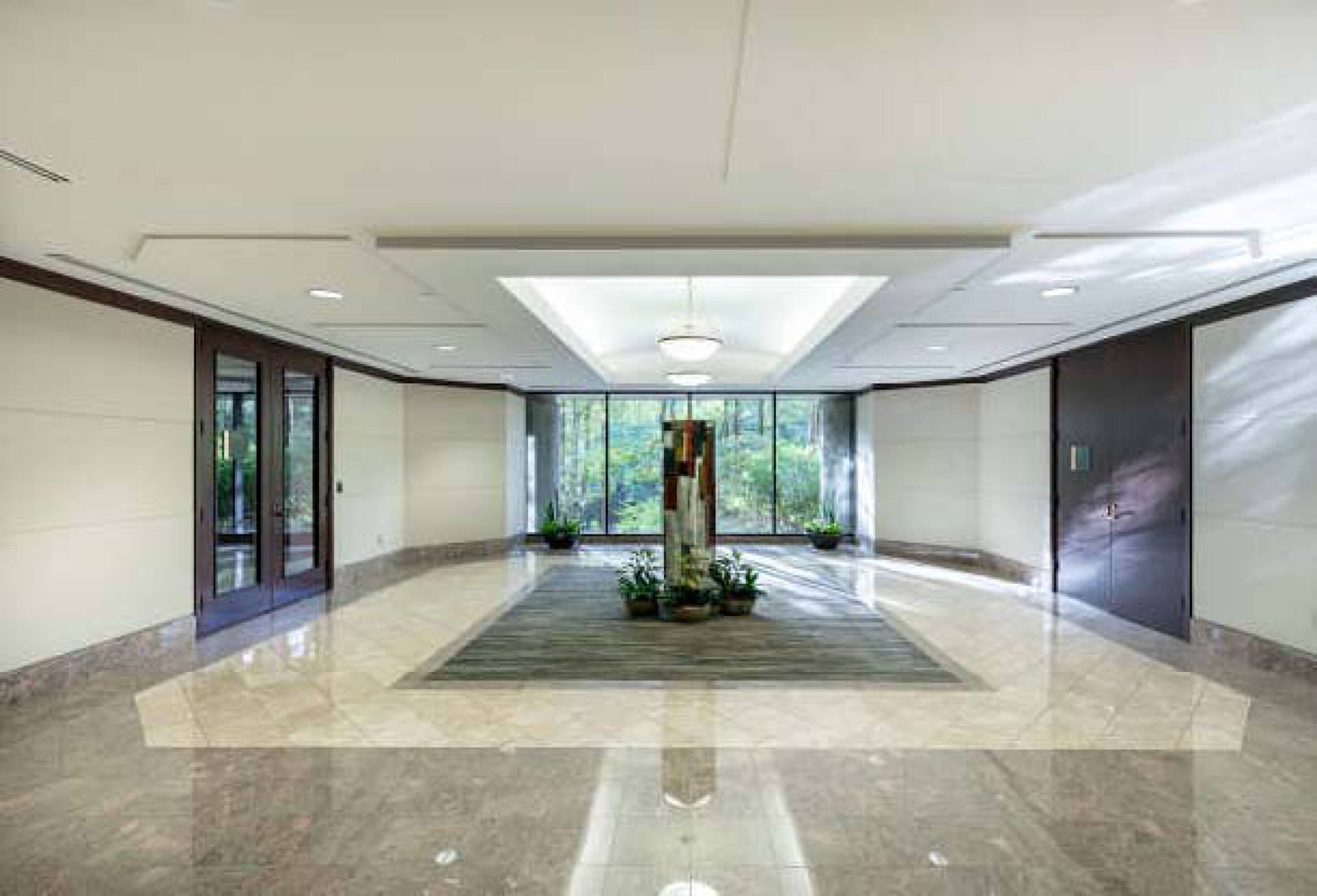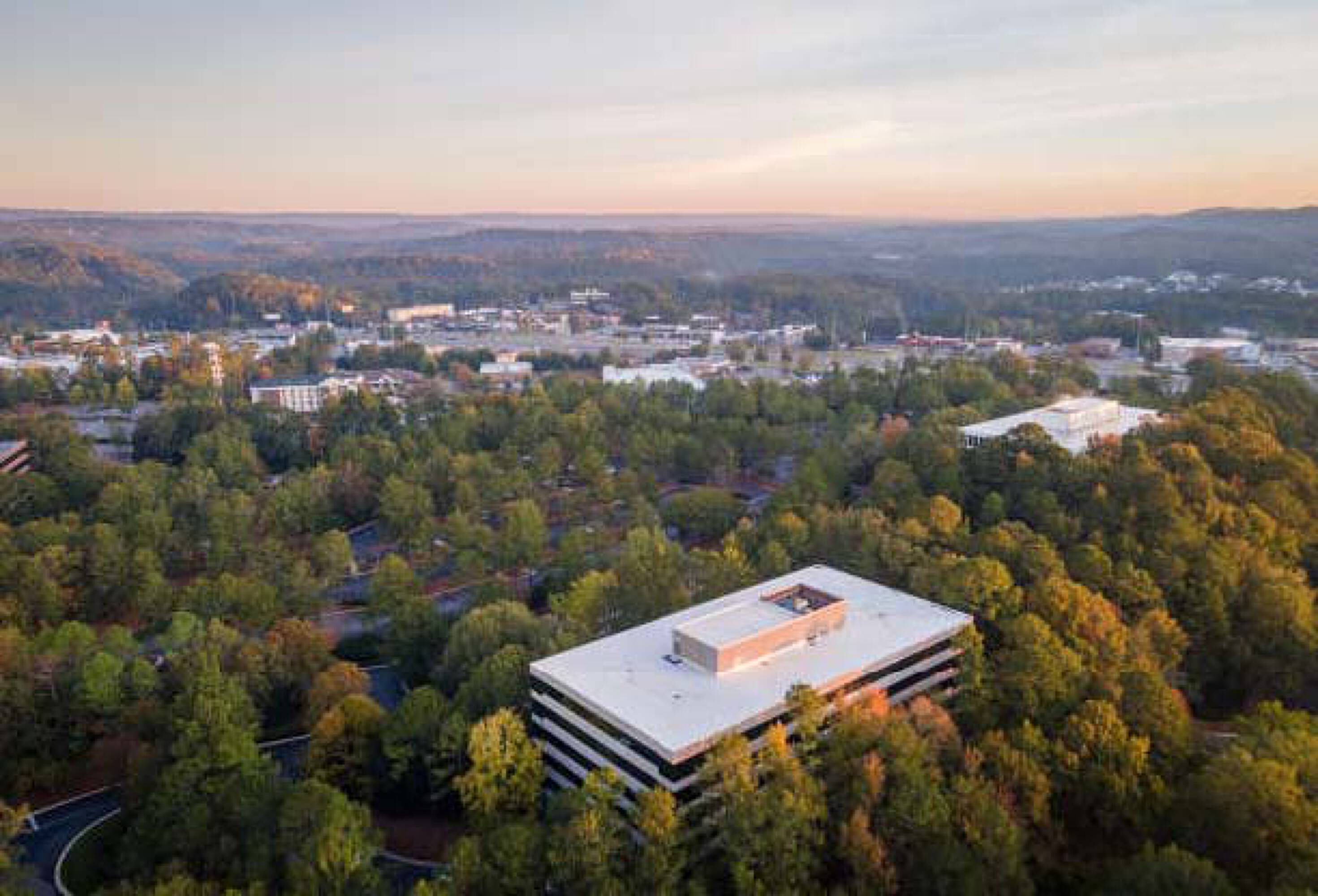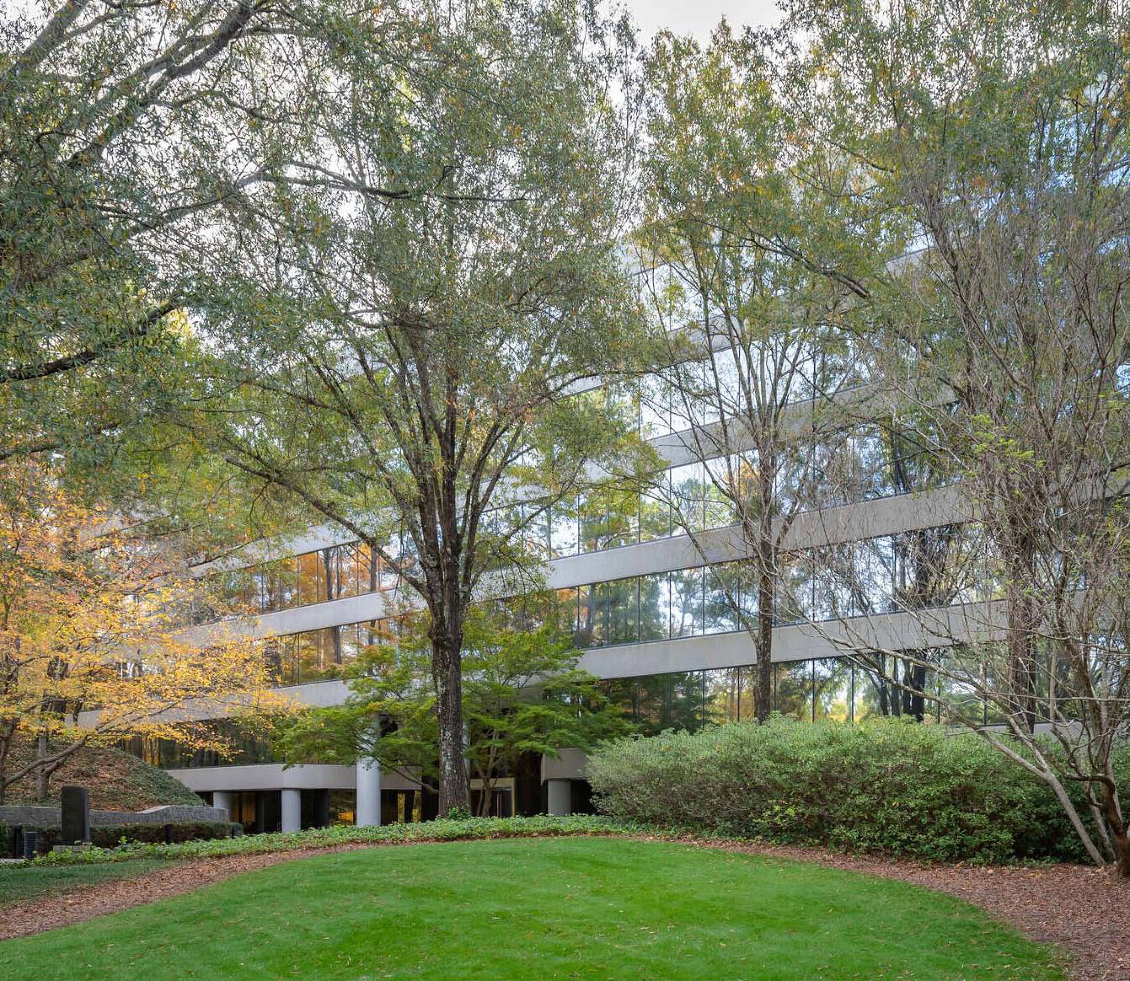 Lush, wooded office park near retail and residential areas.