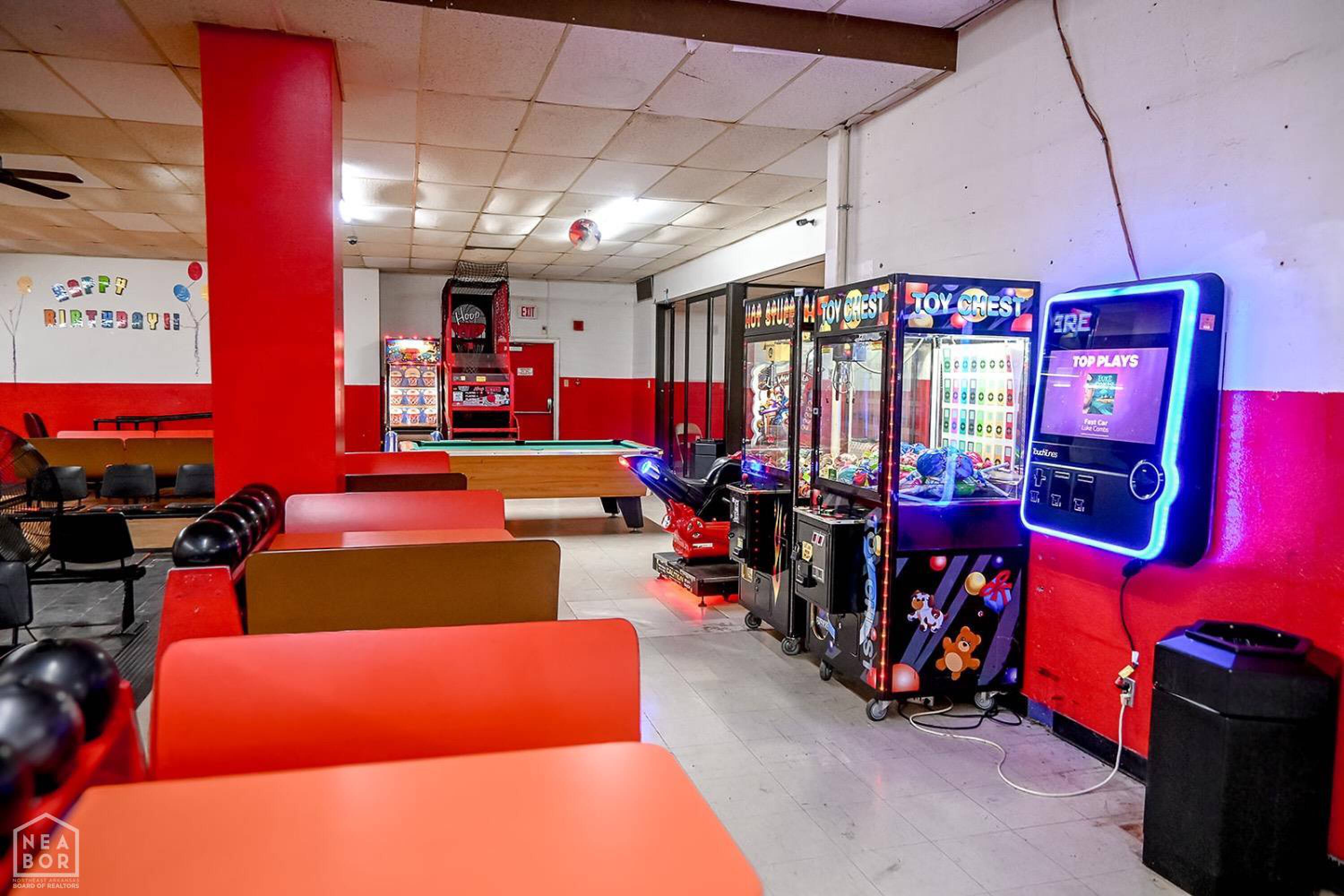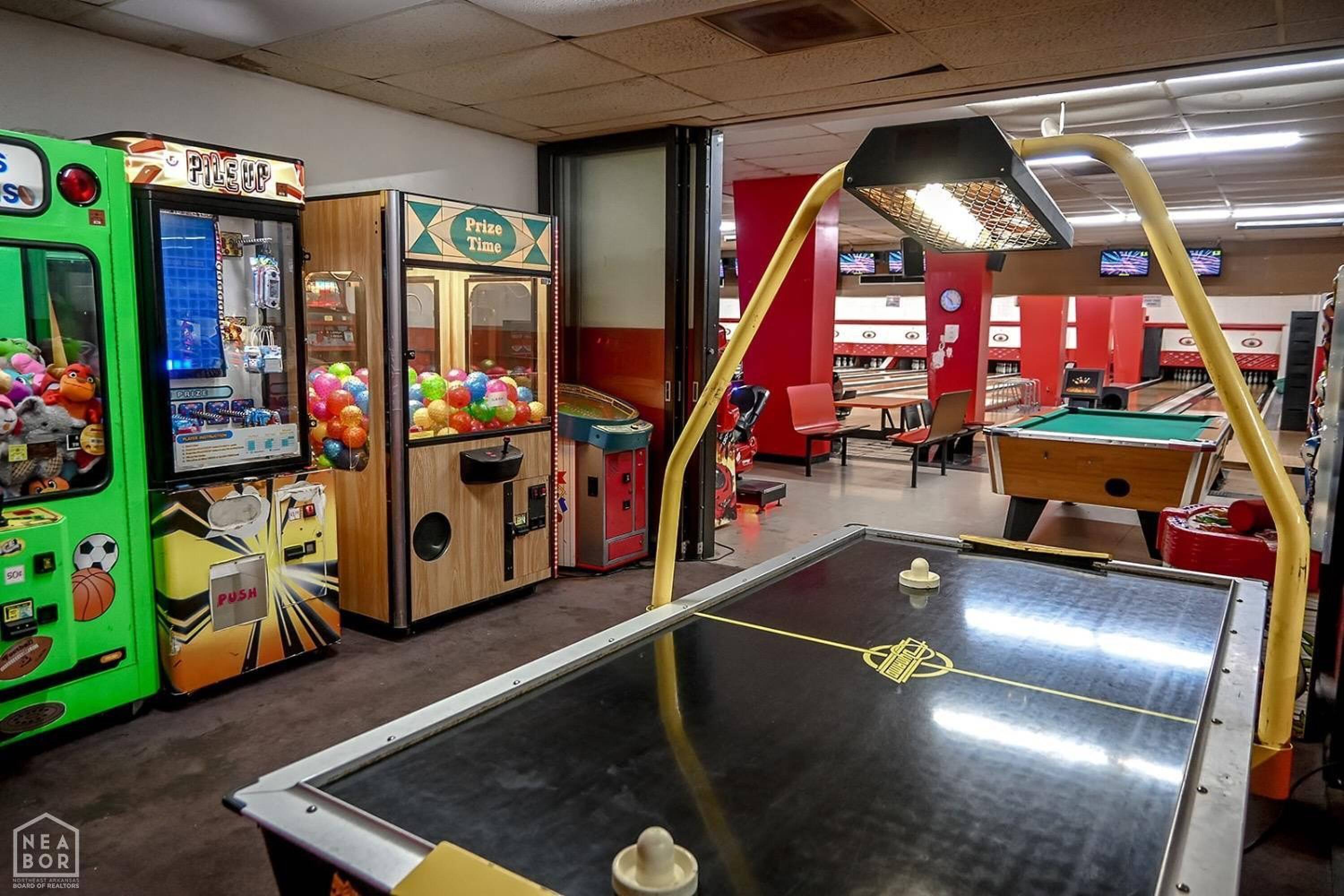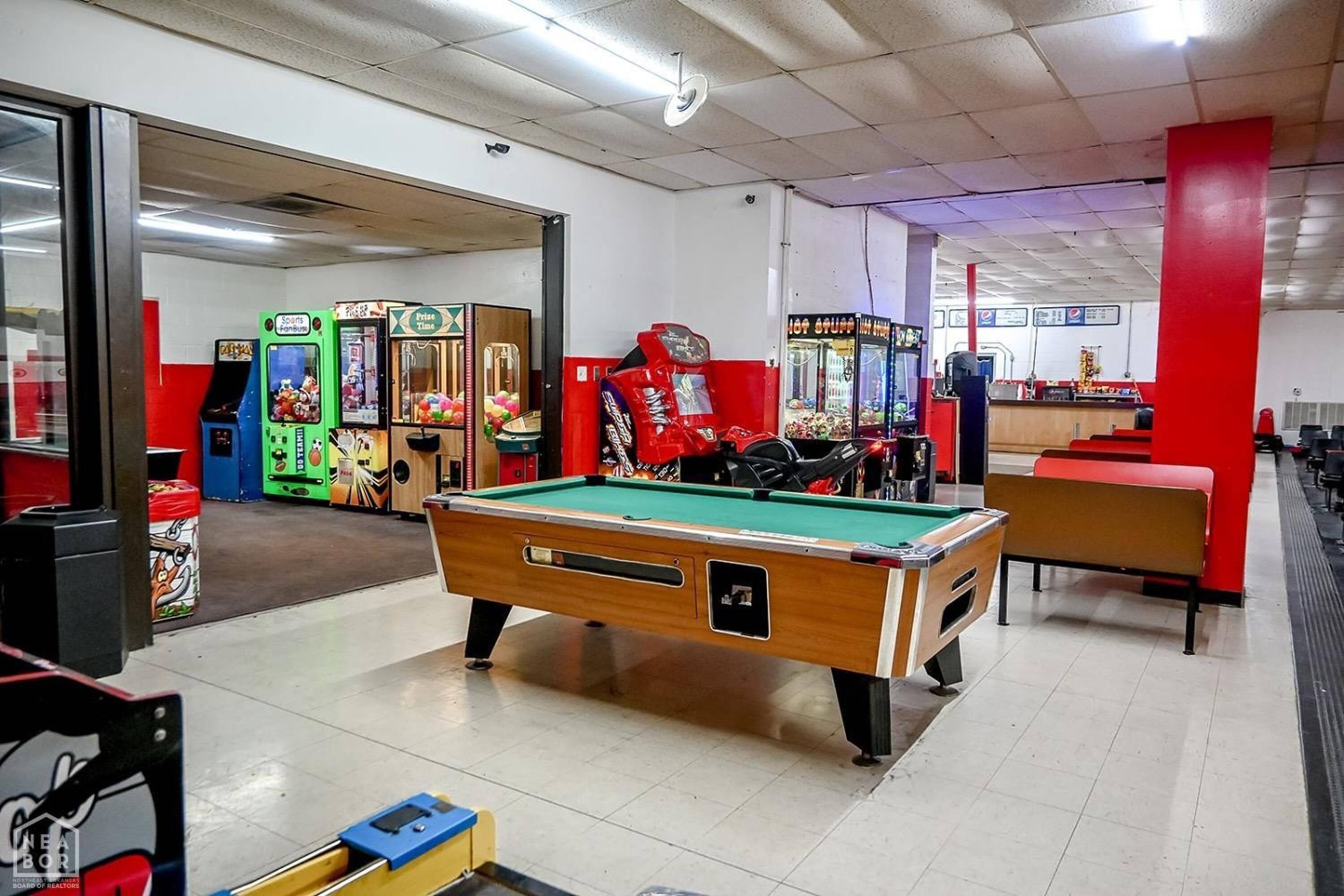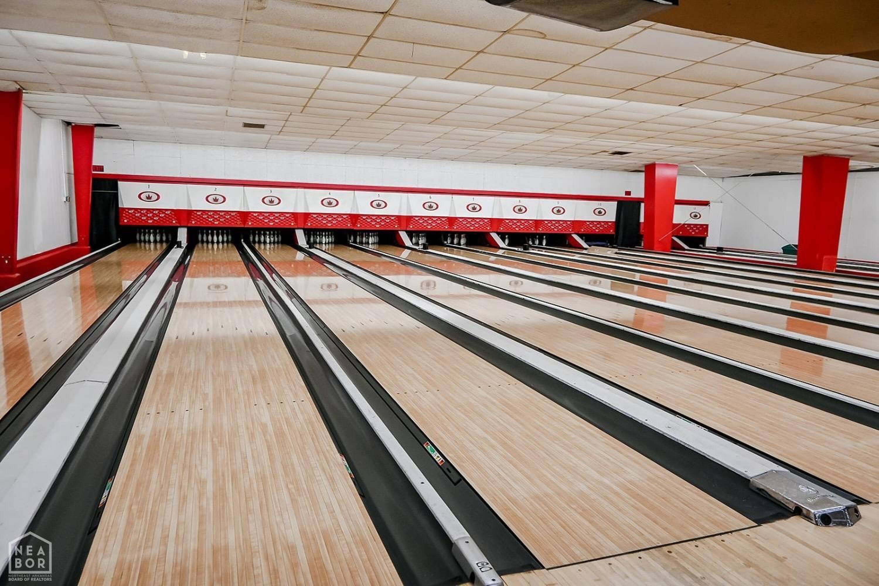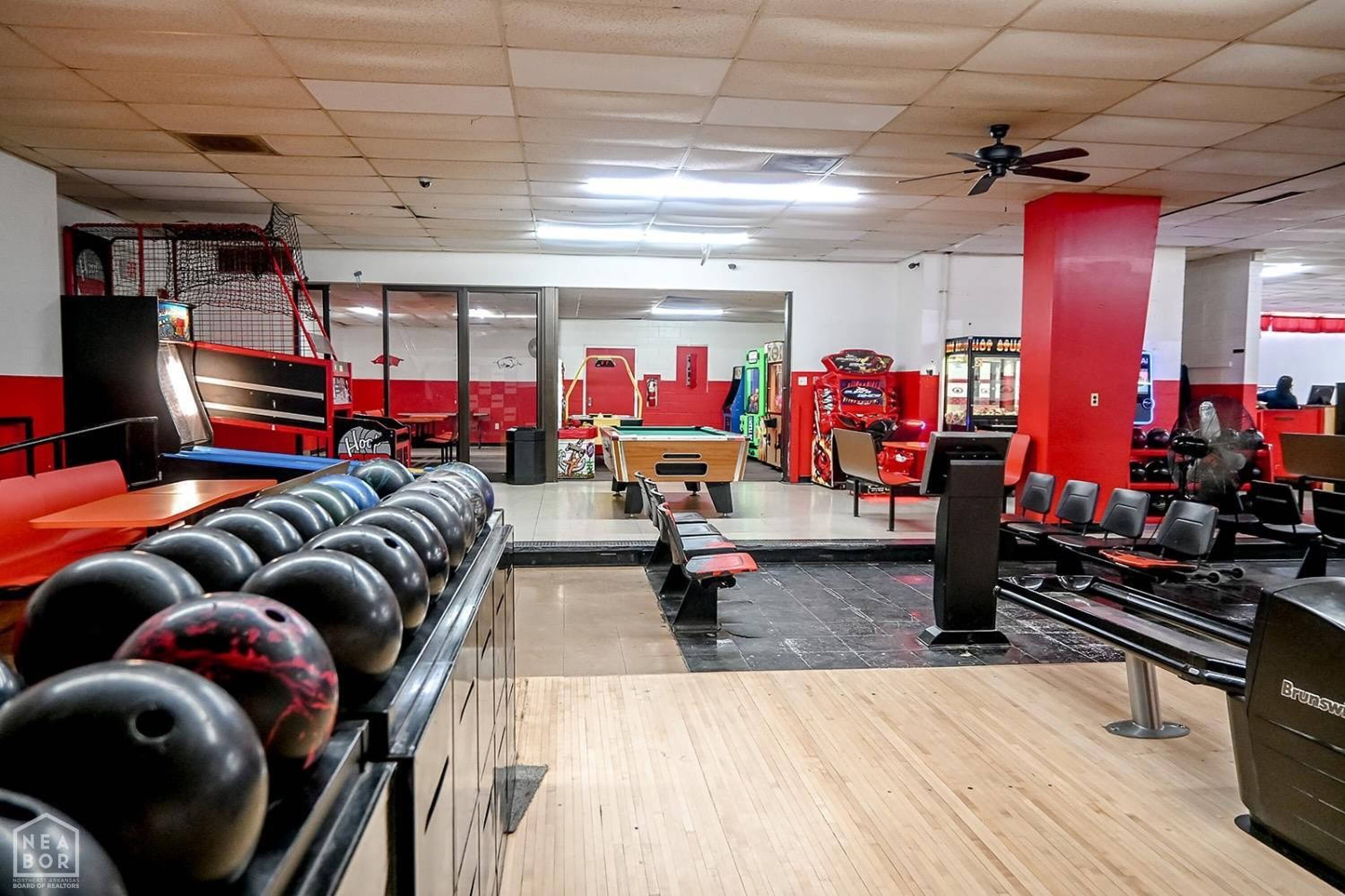 Bowling alley with arcade, restaurant, and party room.