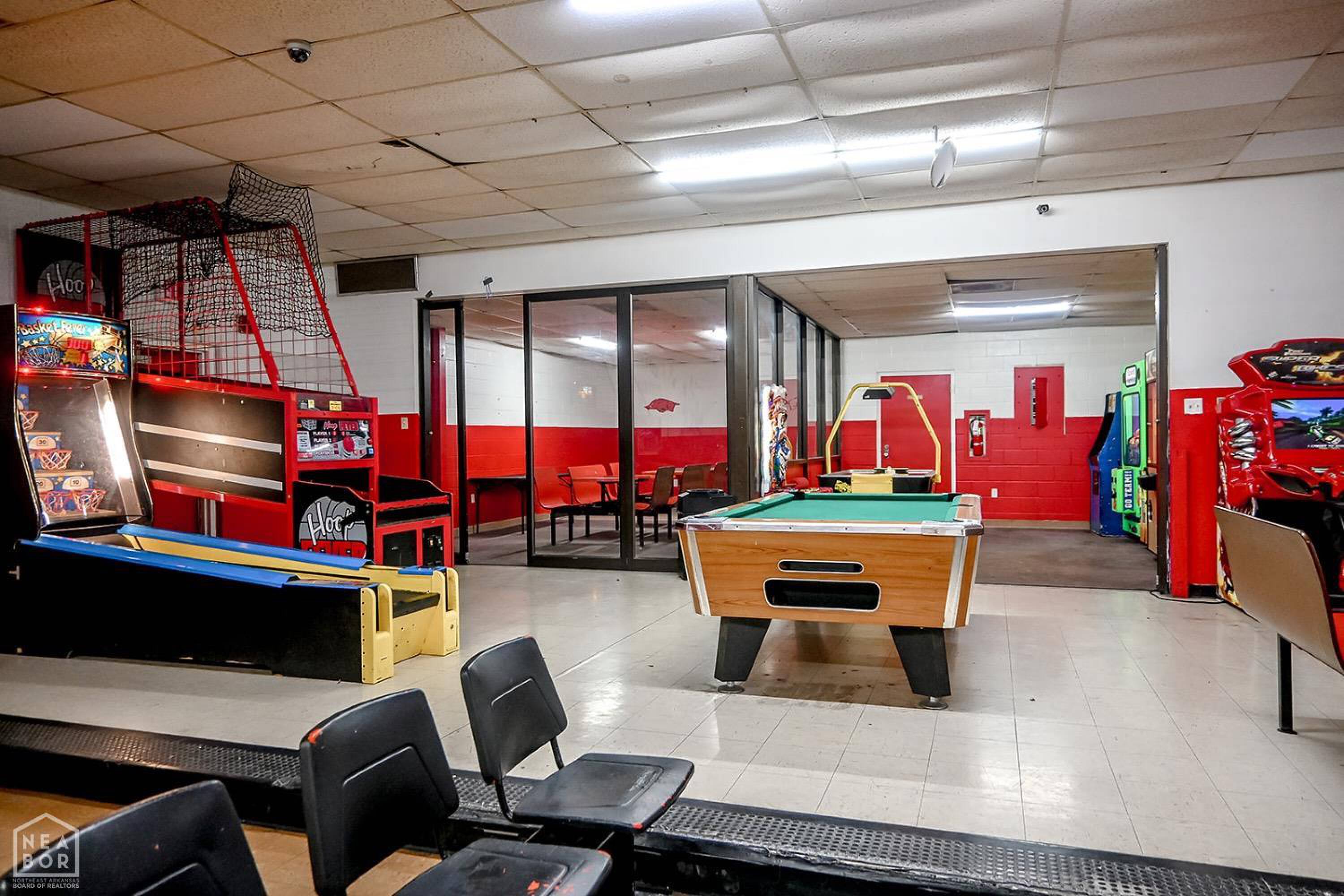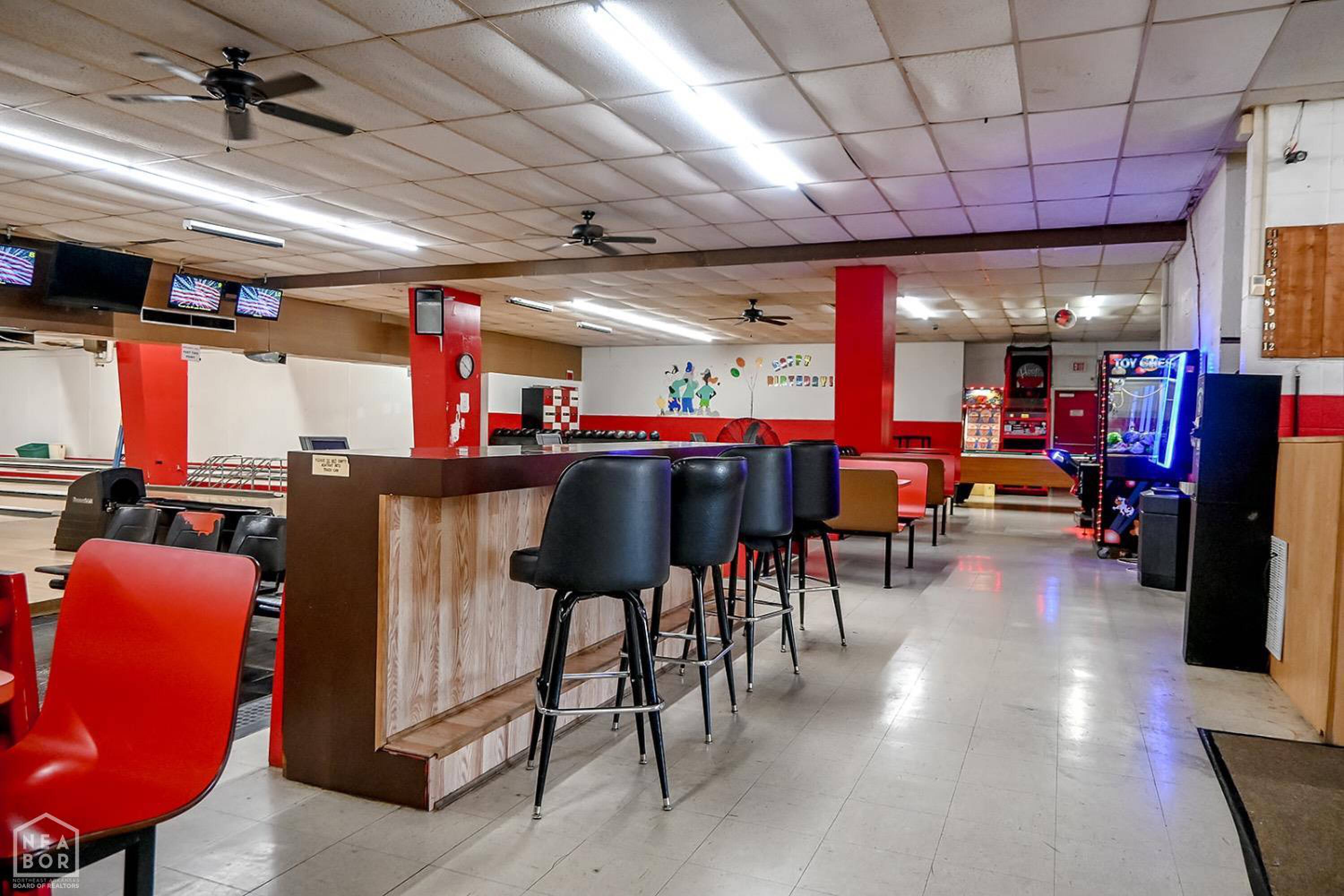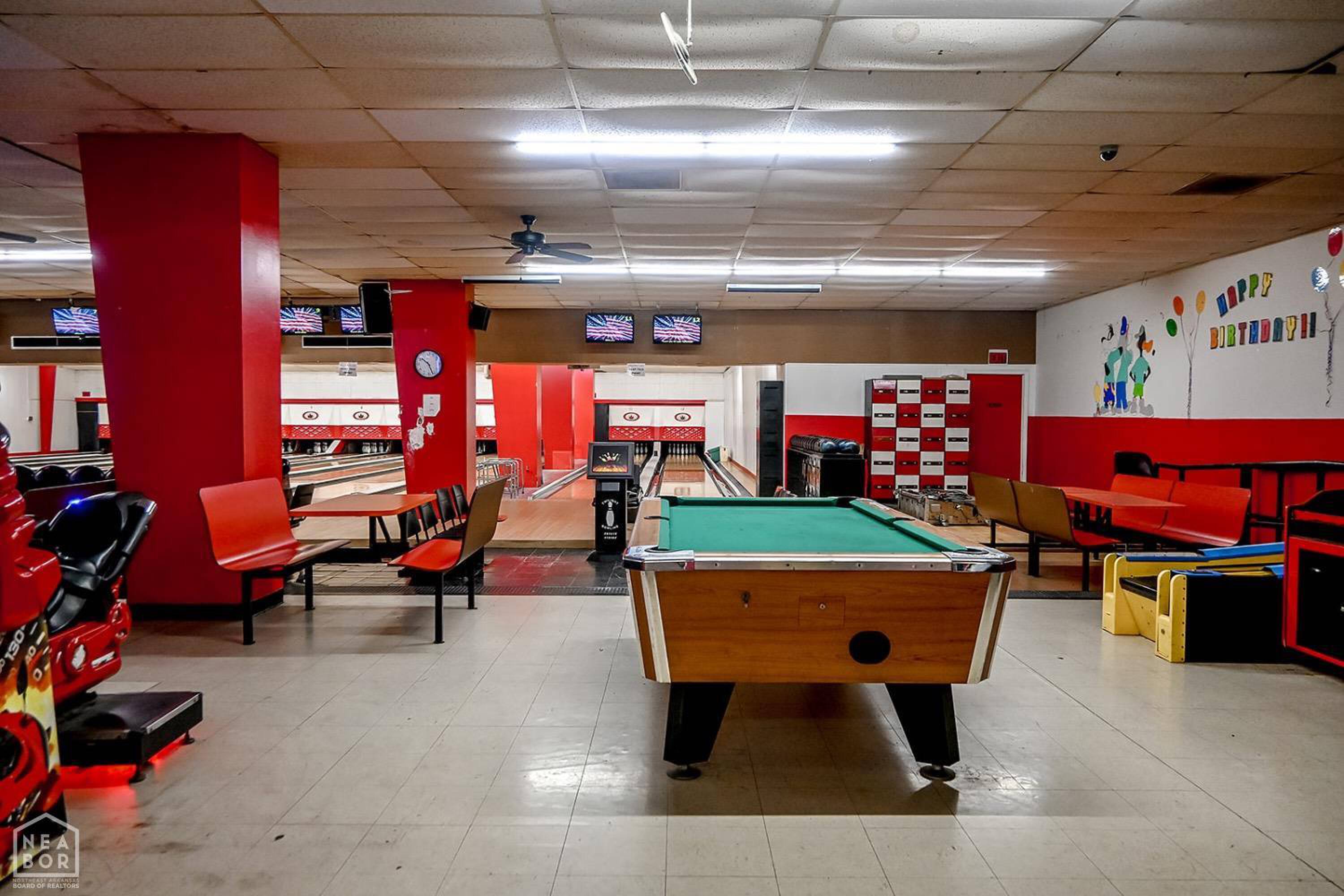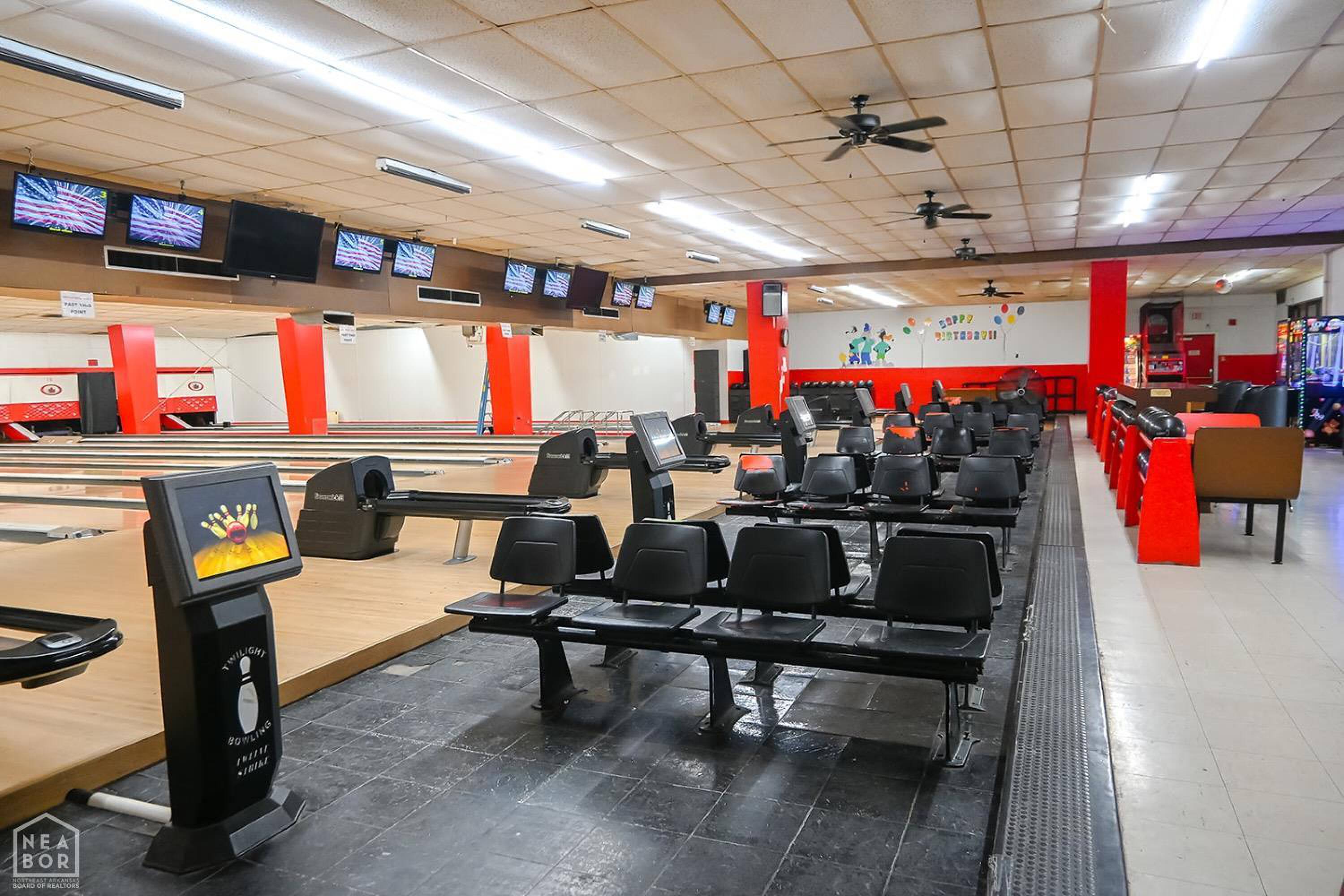 Bowling alley with arcade, restaurant, and party room.