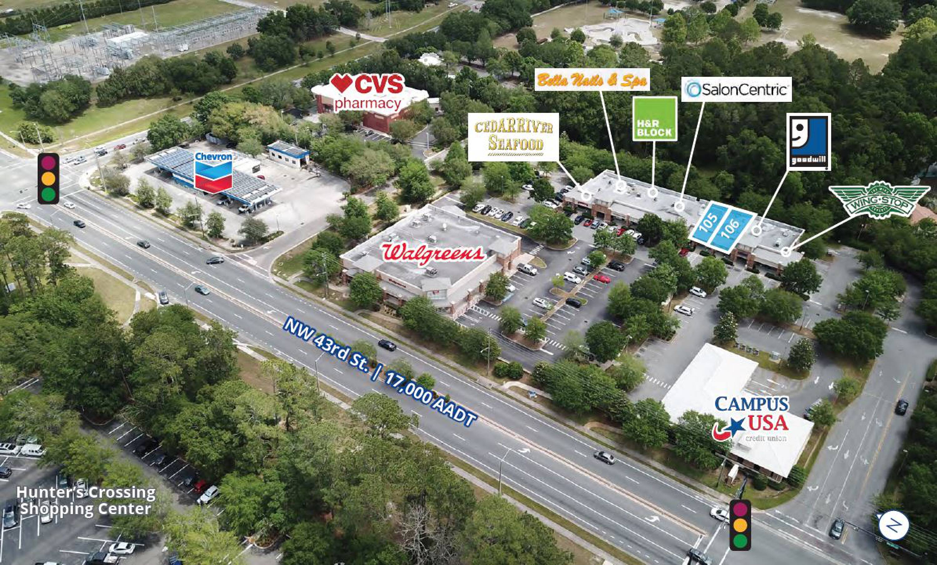 Located in Hunter’s Walk Shopping Center at the corner of NW 43rd Street and NW 53rd Avenue, this retail space is easily accessible from NW 43rd Street at a signalized intersection. The shopping center is directly across the street from Hunter’s Crossing, which is anchored by Publix. Walgreens and Campus USA Credit Union are outparcels, providing a consistent pipeline of customers. On-building signage, monument signage, and ample parking are available. Current tenants include Cedar River Seafood, H&R Block, Salon Centric, Goodwill, Wingstop, and Bella Nails & Spa.