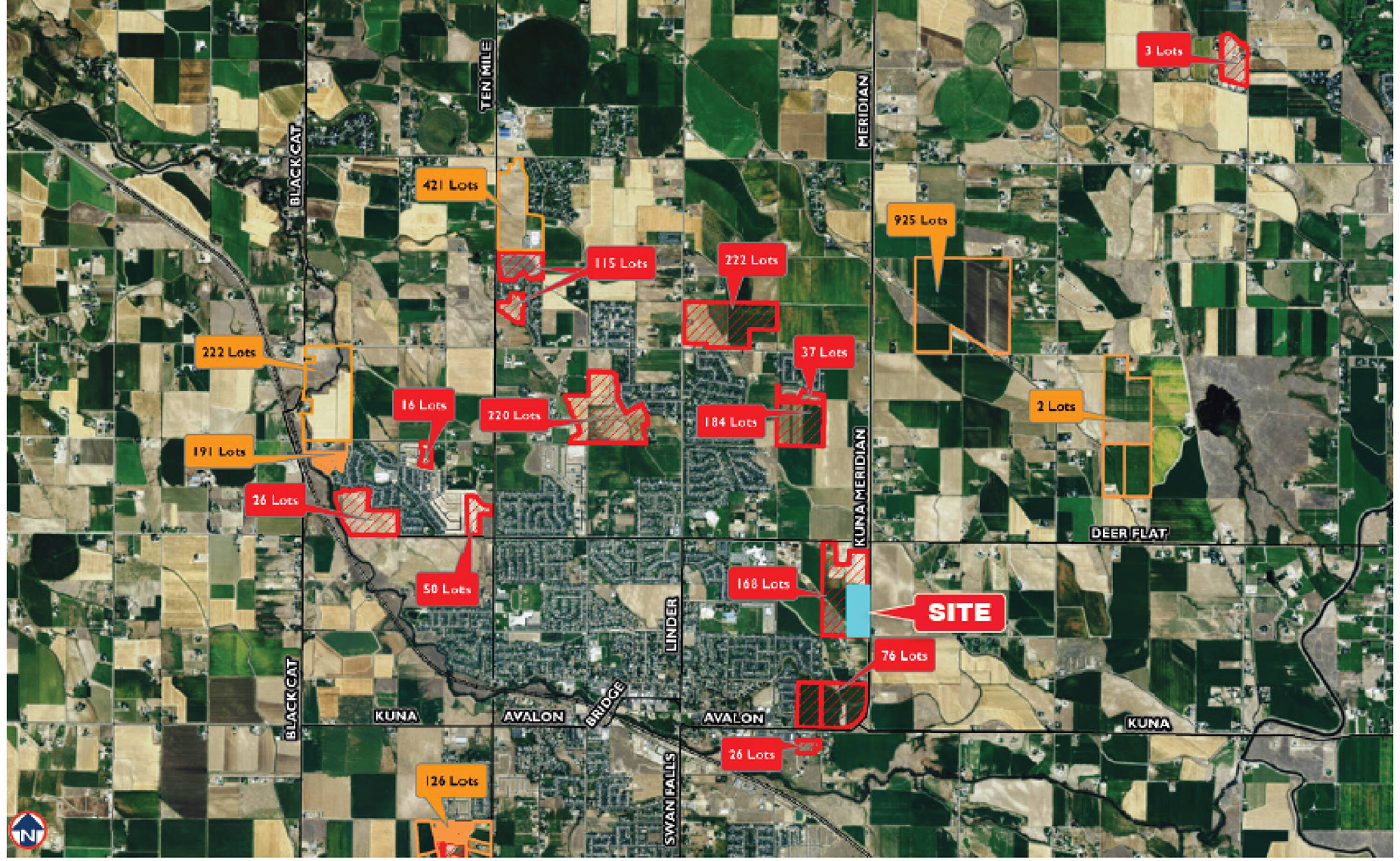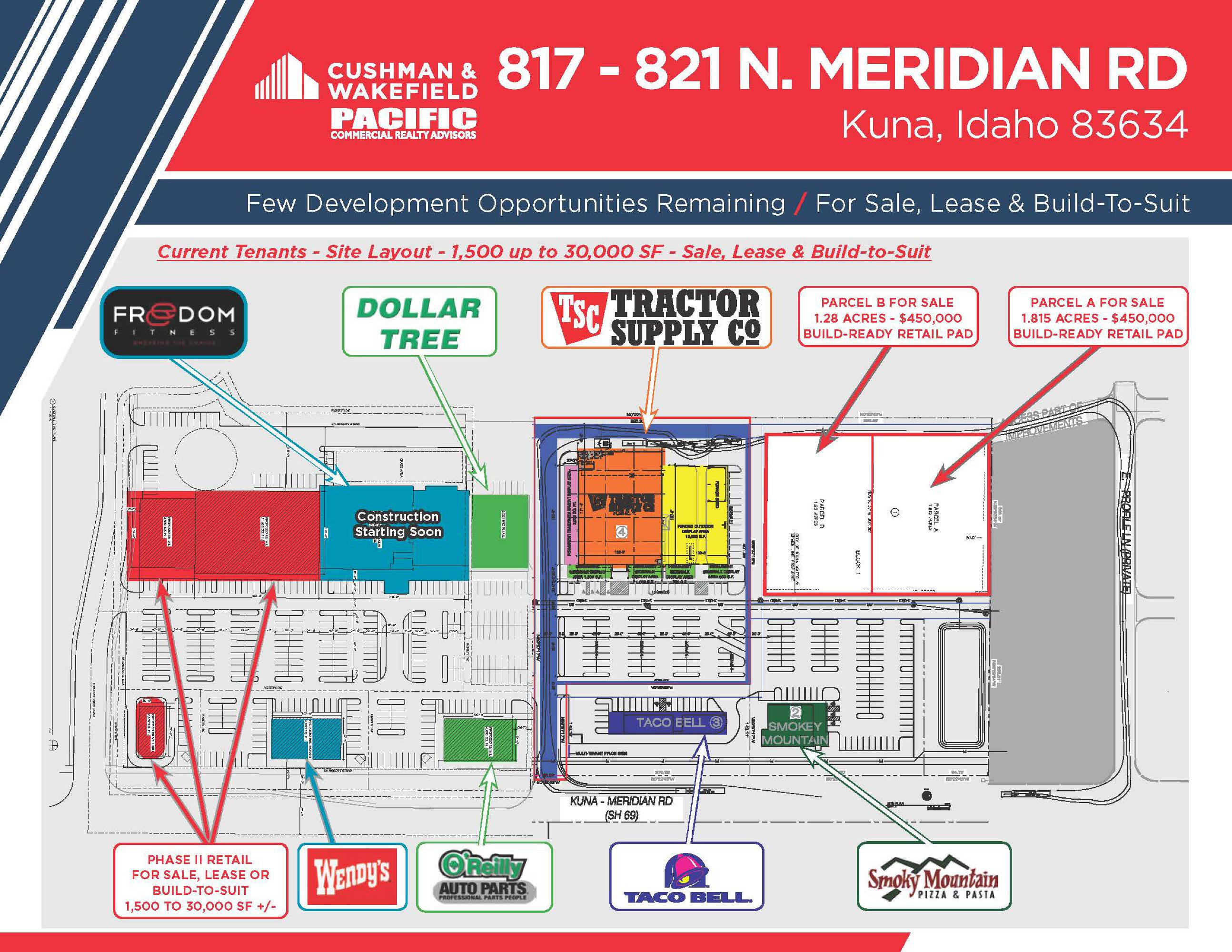This commercial property offers retail spaces for sale, lease, or build-to-suit. It is situated in a growing area near downtown Kuna, located on the main thoroughfare. The property features rough graded pads with utilities stubbed to the site. Current tenants include Tractor Supply, O’Reilly, Dollar Tree, Smoky Mountain Pizza, and Freedom Fitness, with construction starting soon. The location is south of Ridley’s Food & Drug, Ace Hardware, the Reel Theater, and McDonald’s, within a new development on the hard corner of Deer Flat and Meridian Roads. The surrounding area includes new and recently platted residential and commercial subdivisions and developments.