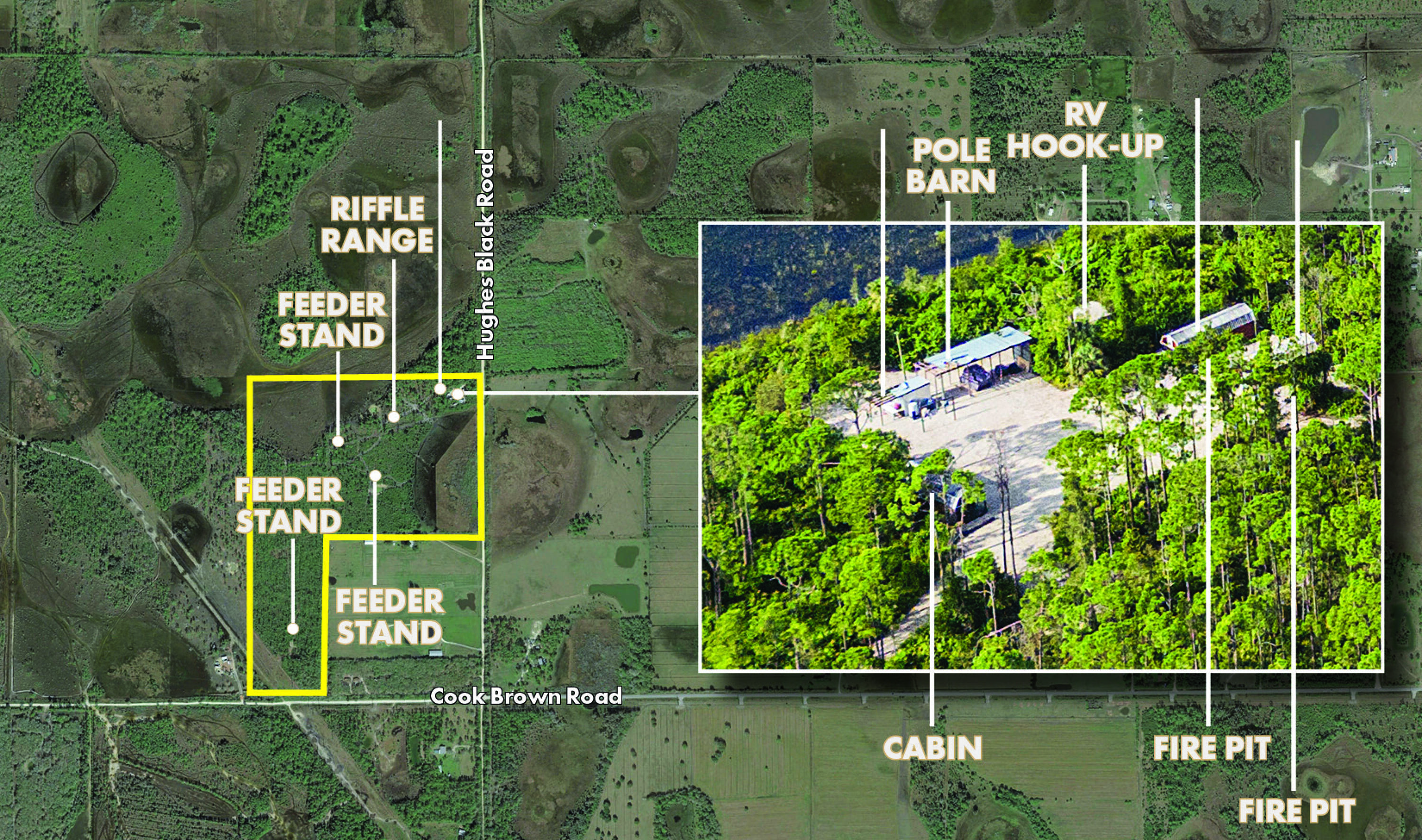 Turn-key recreational property with hunting cabins and outdoor facilities.